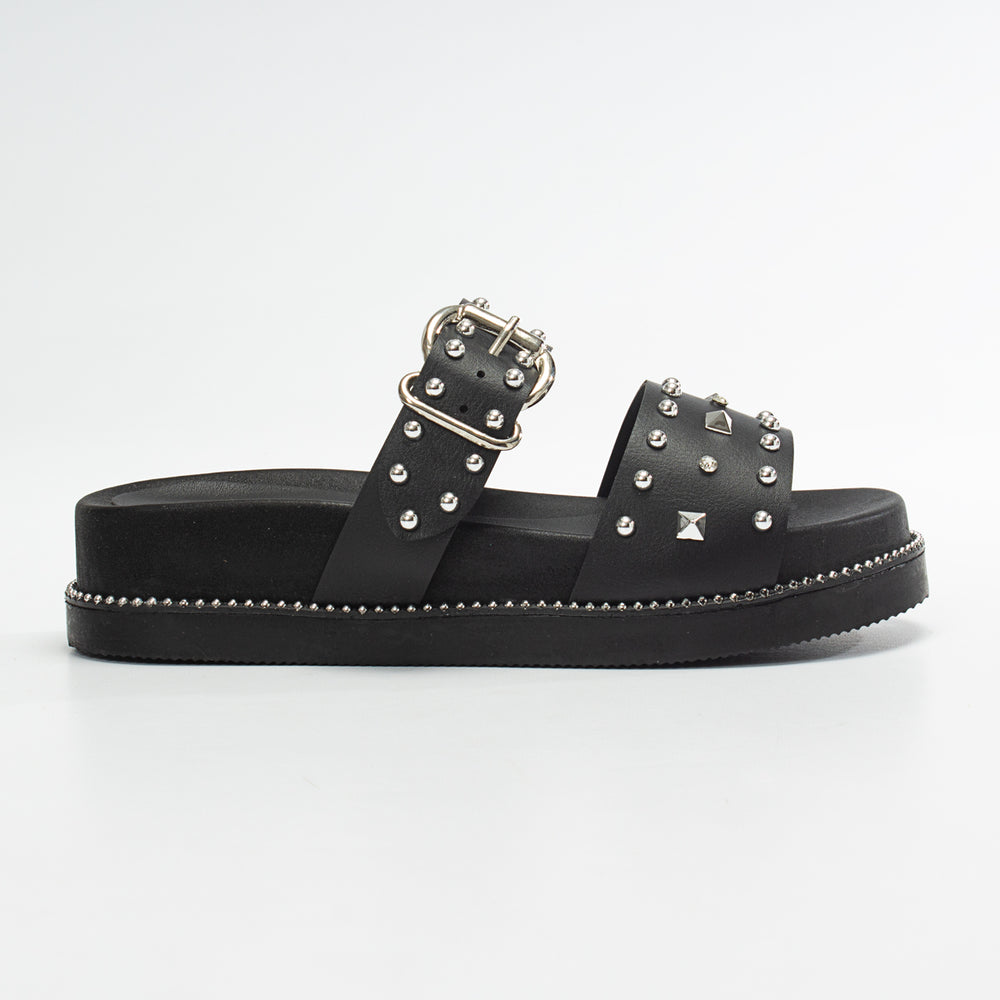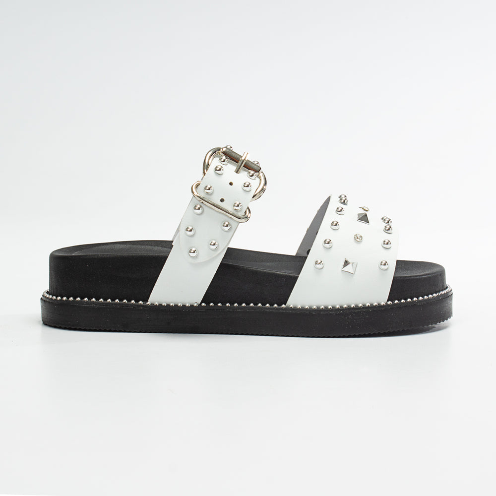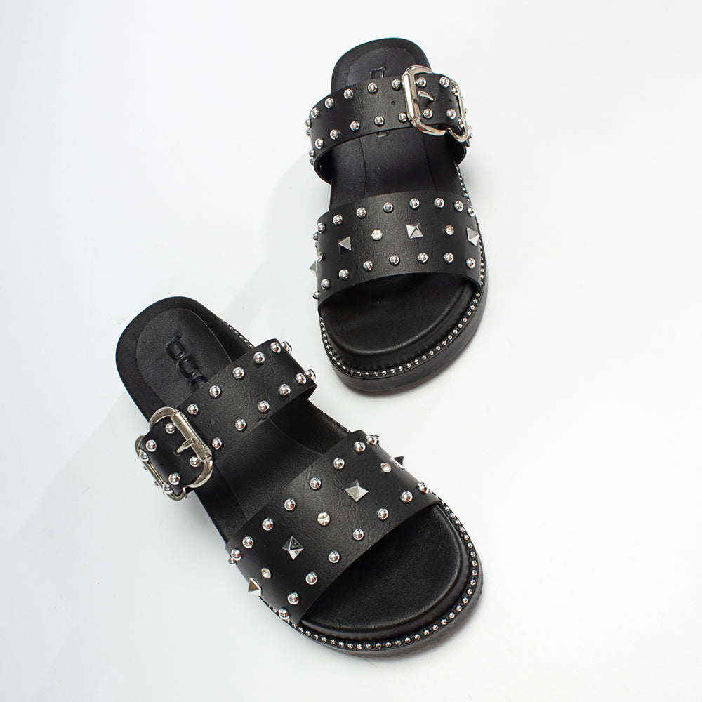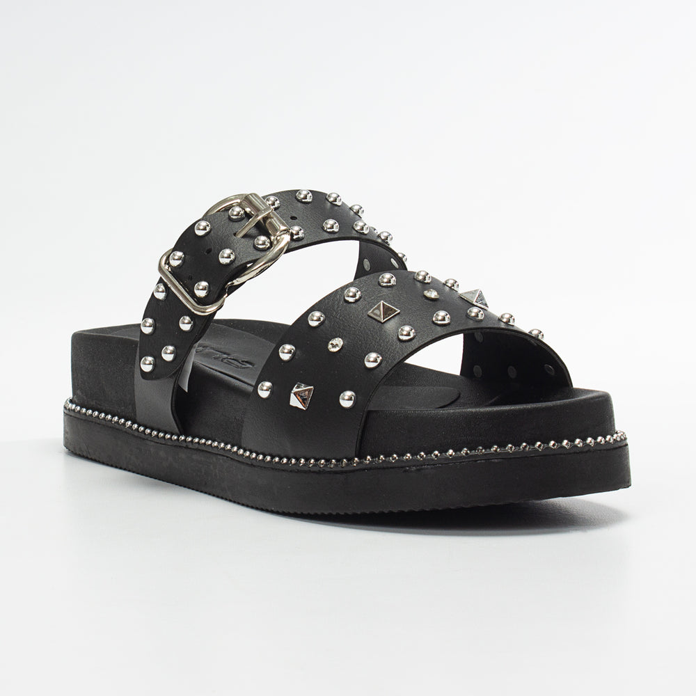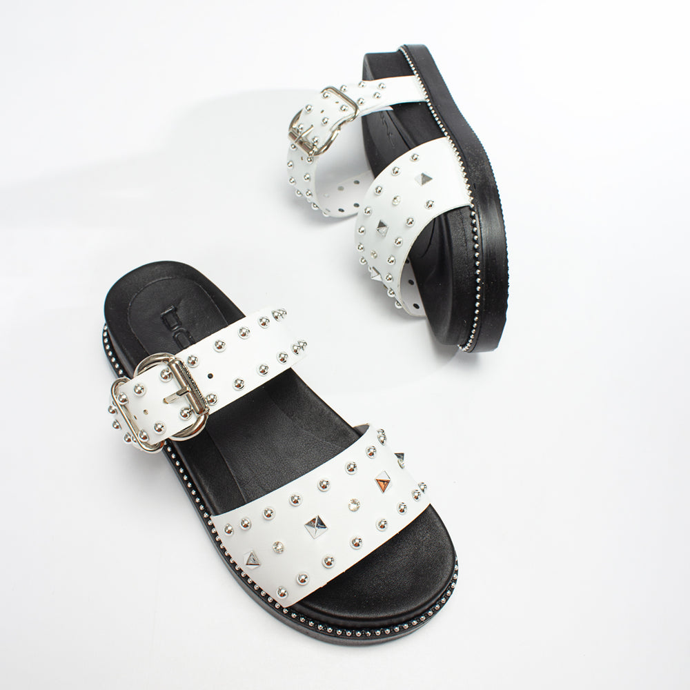 Sandalias planas a dos correas con taches y hebillas, para quienes aman estar frescas y a la moda.