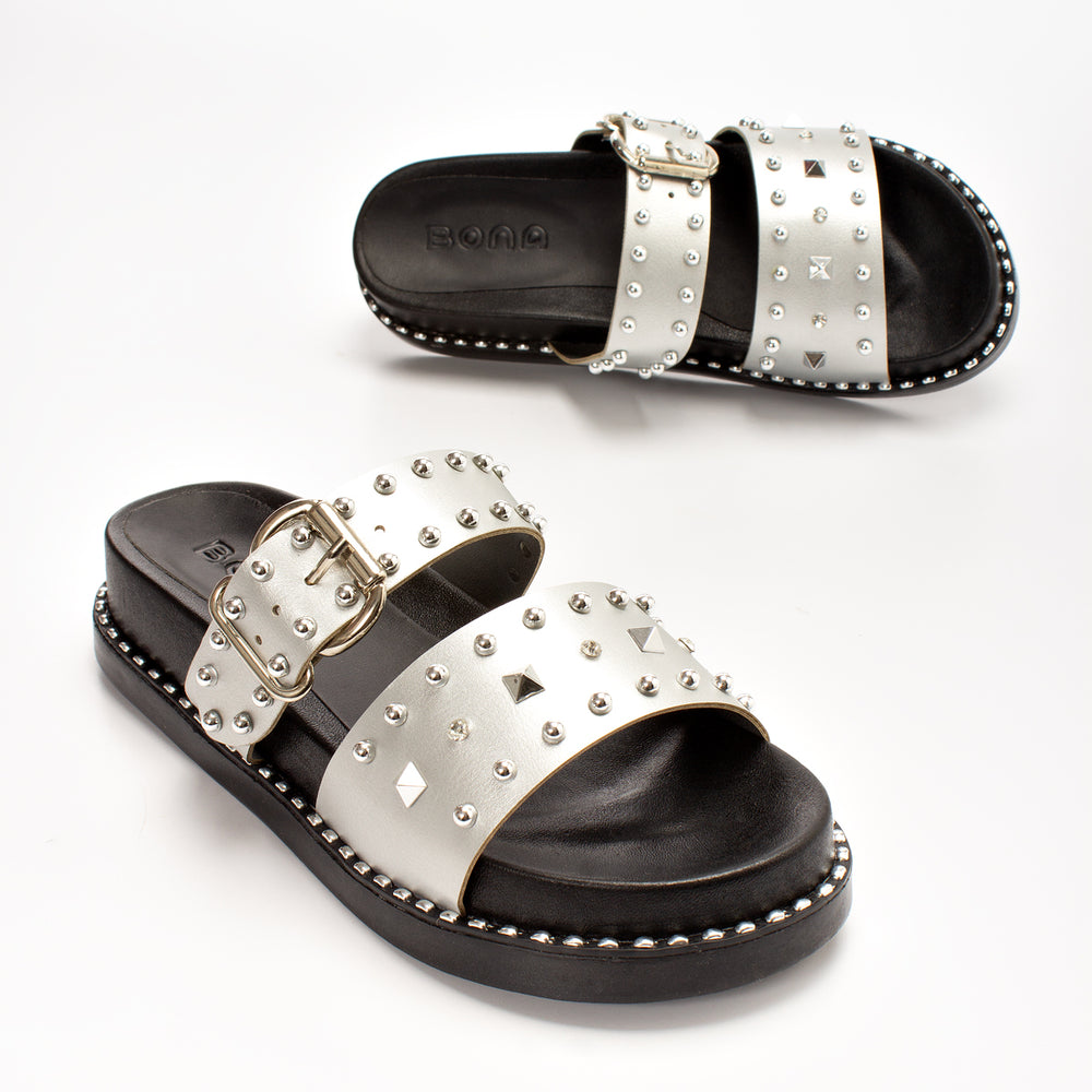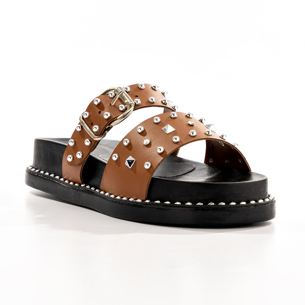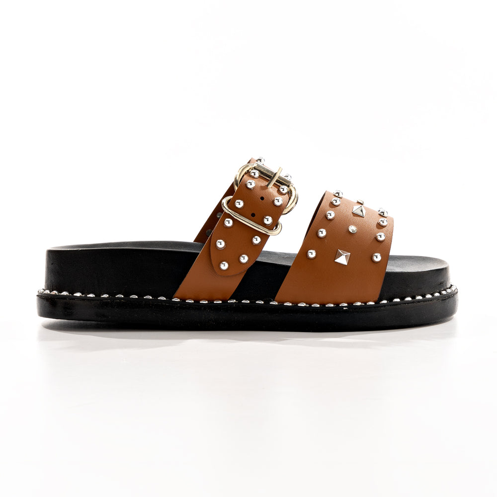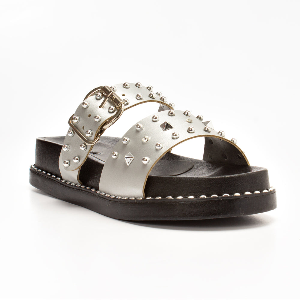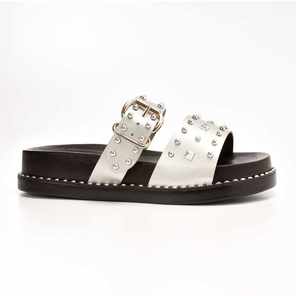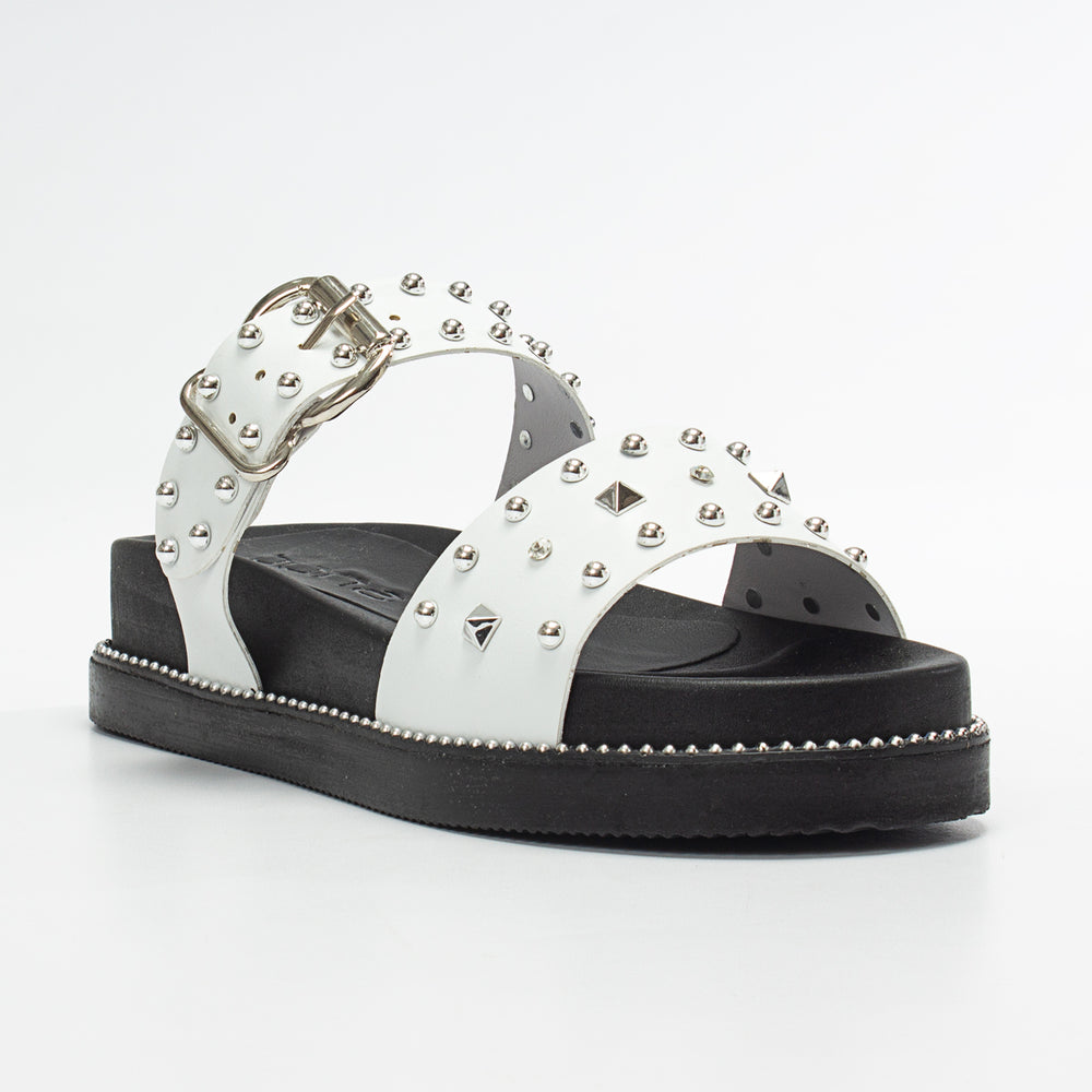 Sandalias planas a dos correas con taches y hebillas, para quienes aman estar frescas y a la moda.
