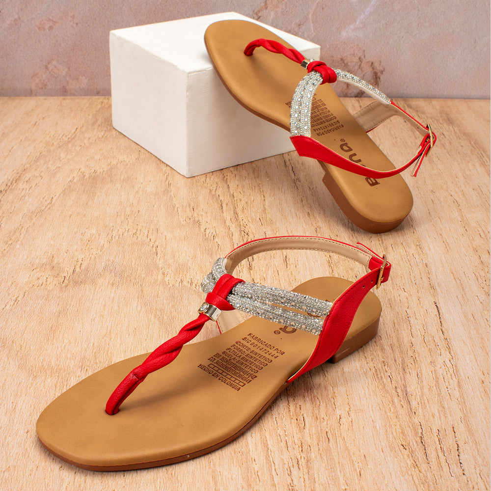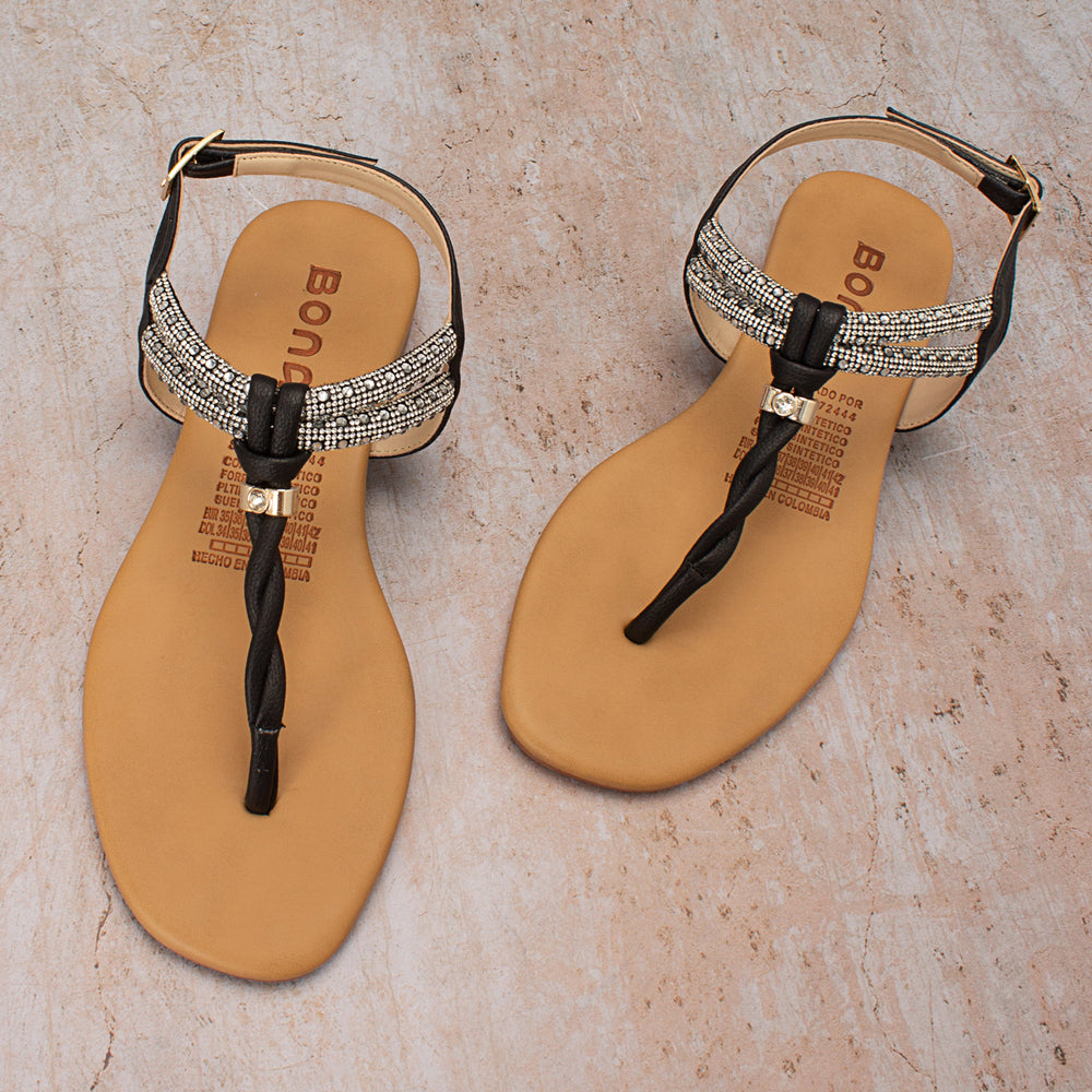 Sandalia plana de moda para mujer, tres puntas con detalles en brillos y cierre mediante hebilla en...