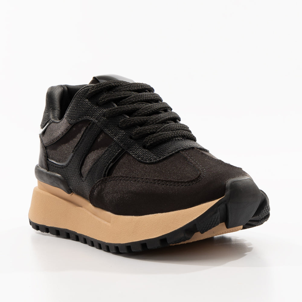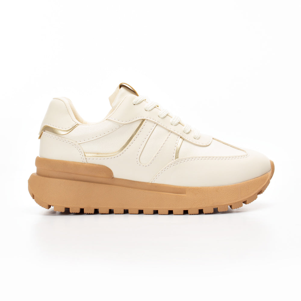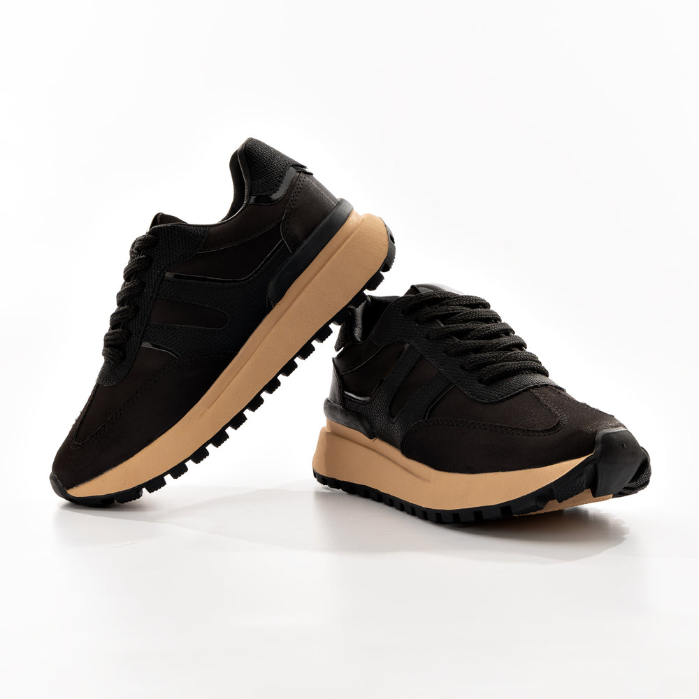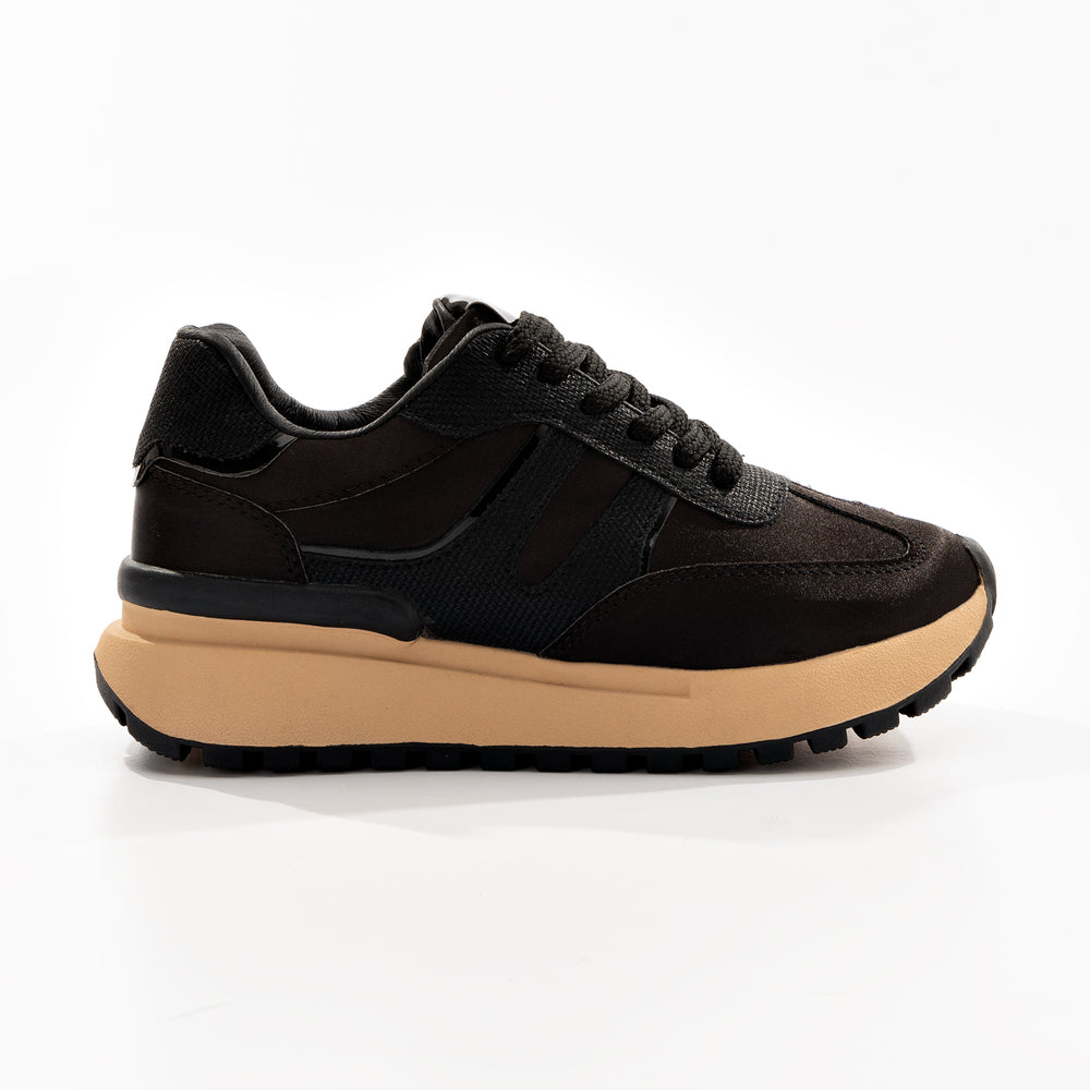 Tenis de moda para mujer, Este tenis moderno y funcional destaca por su suela tracturada, diseñada para ofrecer un excelente agarre y estabilidad en diversos terrenos. La suela, con un diseño robusto y en relieve, proporciona una sensación de seguridad y comodidad en cada paso. Lo que realmente marca la diferencia es la combinación de materiales que forman el zapato: el contraste de colores y texturas, crea una estética dinámica y llamativa.
