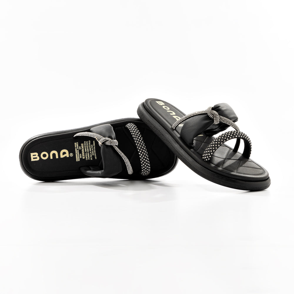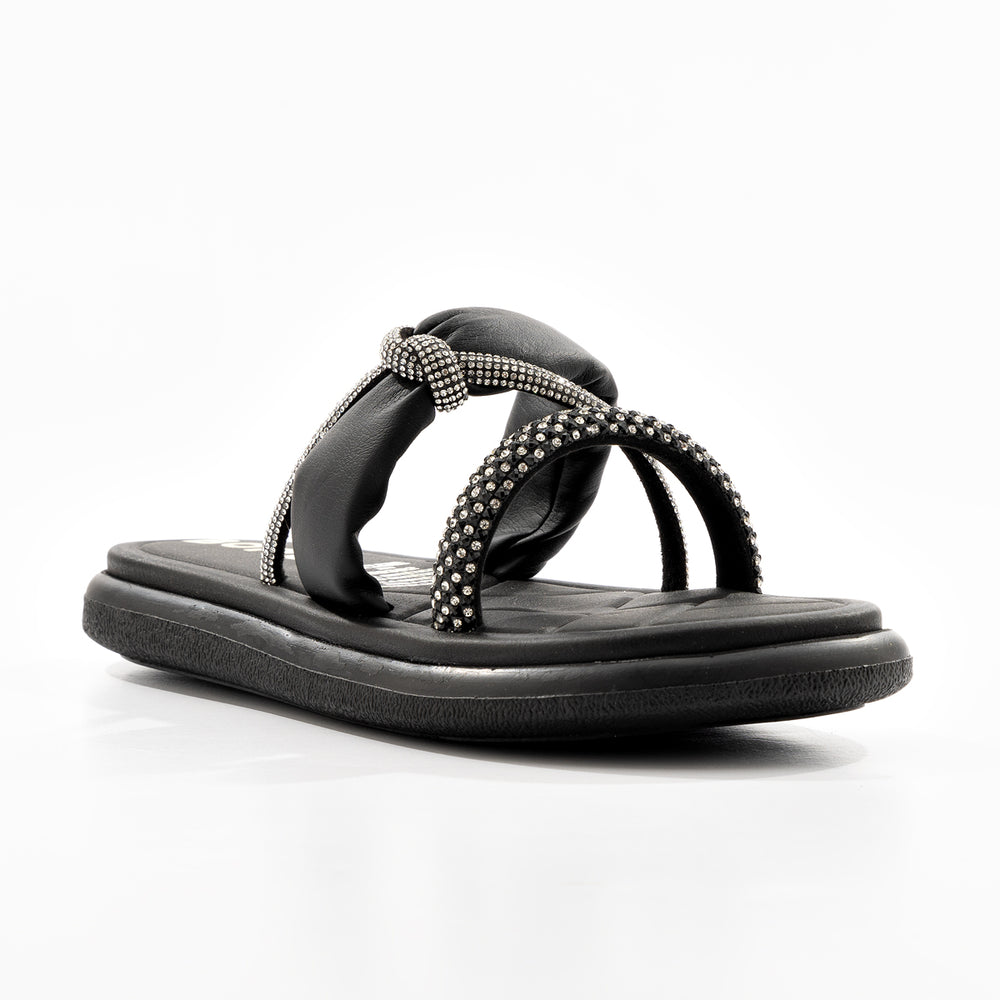 Sandalia tipo slide en cuero negro con elegantes detalles de pedrería plateada en las tiras. Diseño moderno y sofisticado que combina comodidad con estilo urbano-contemporáneo.