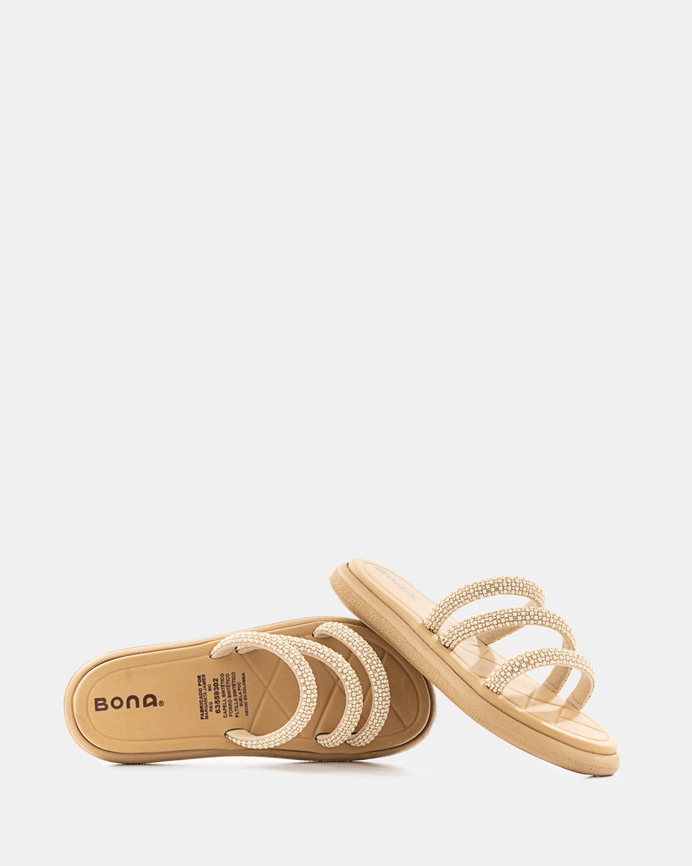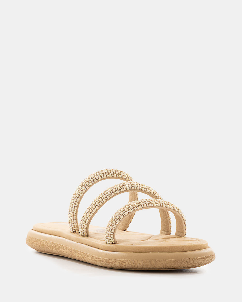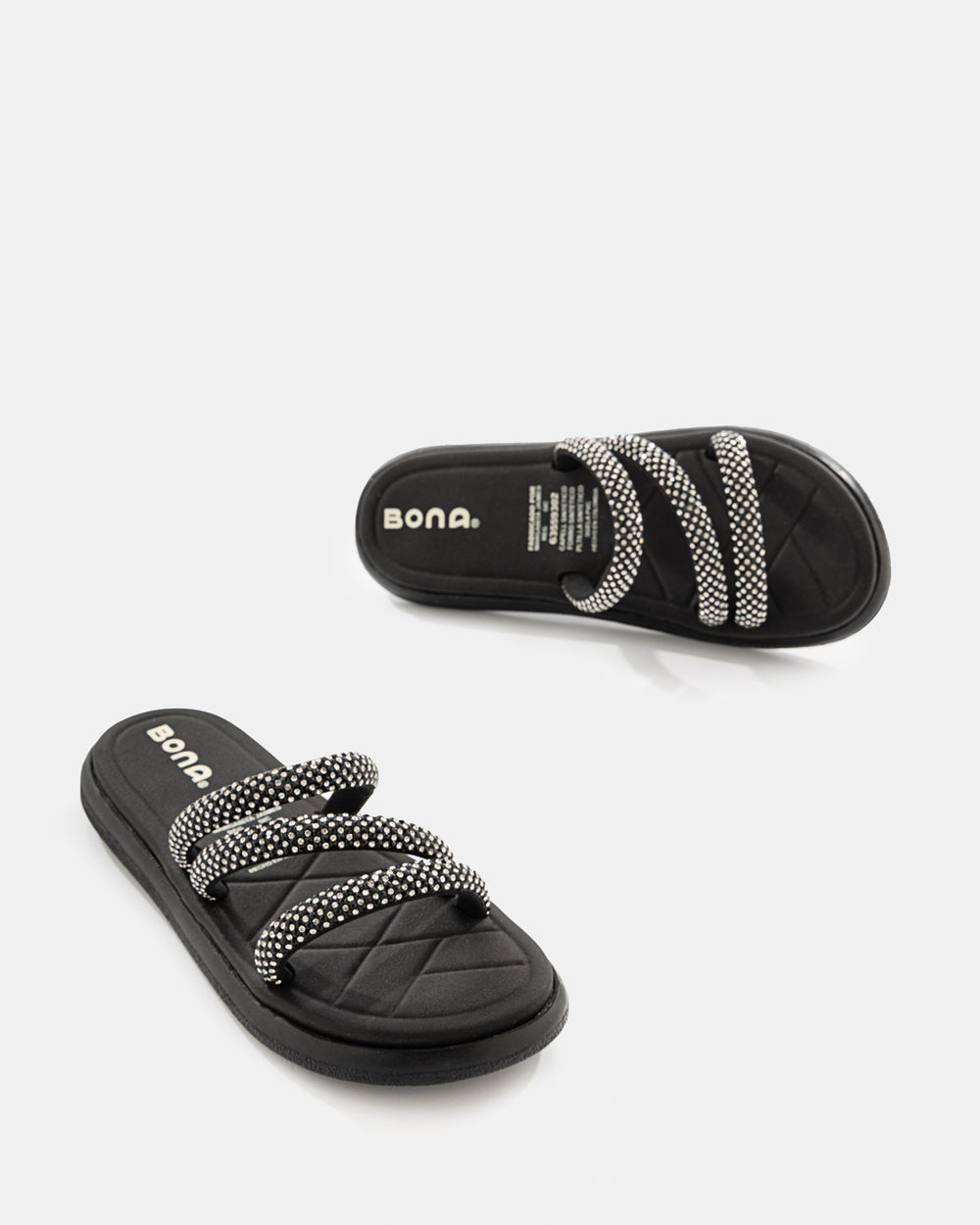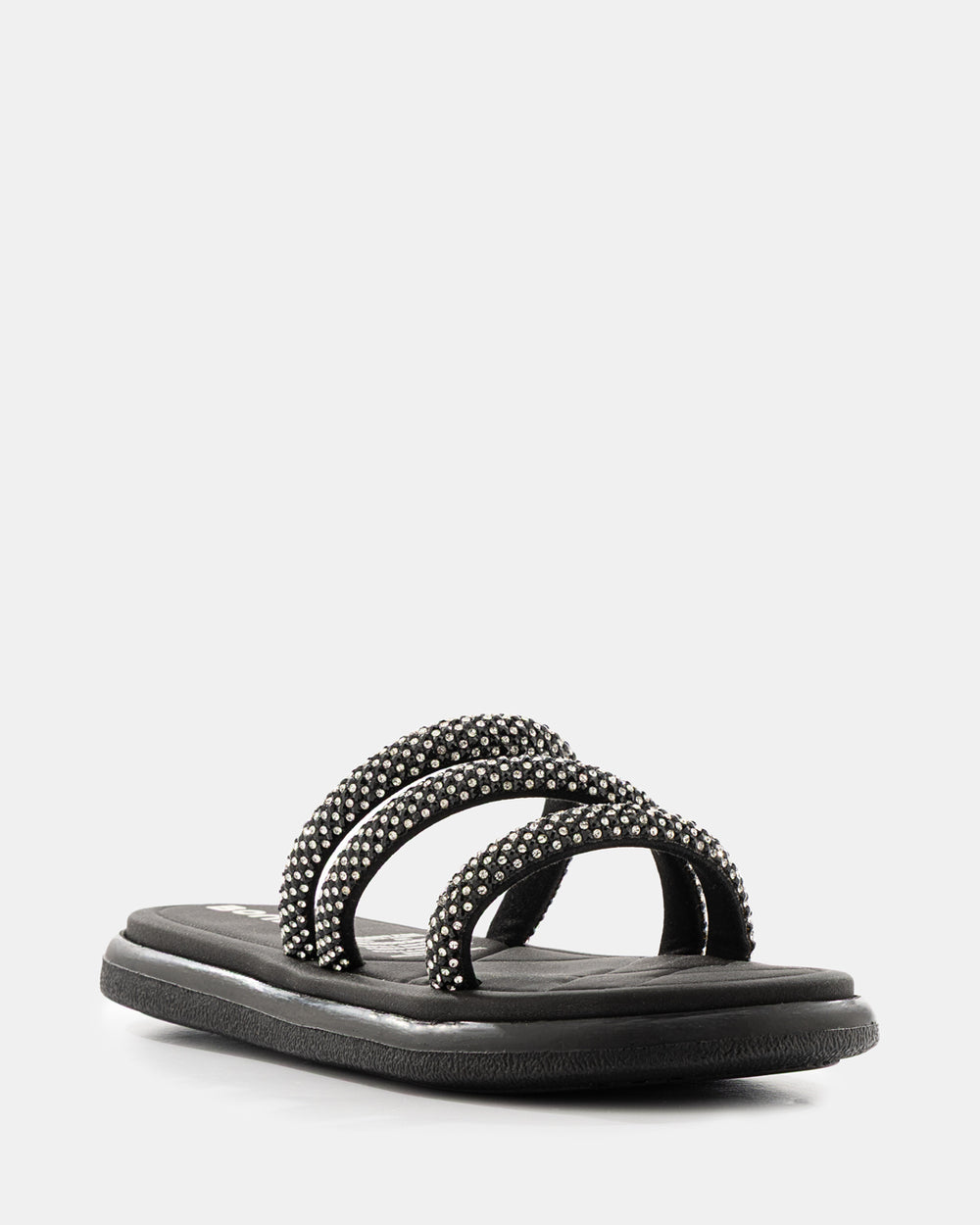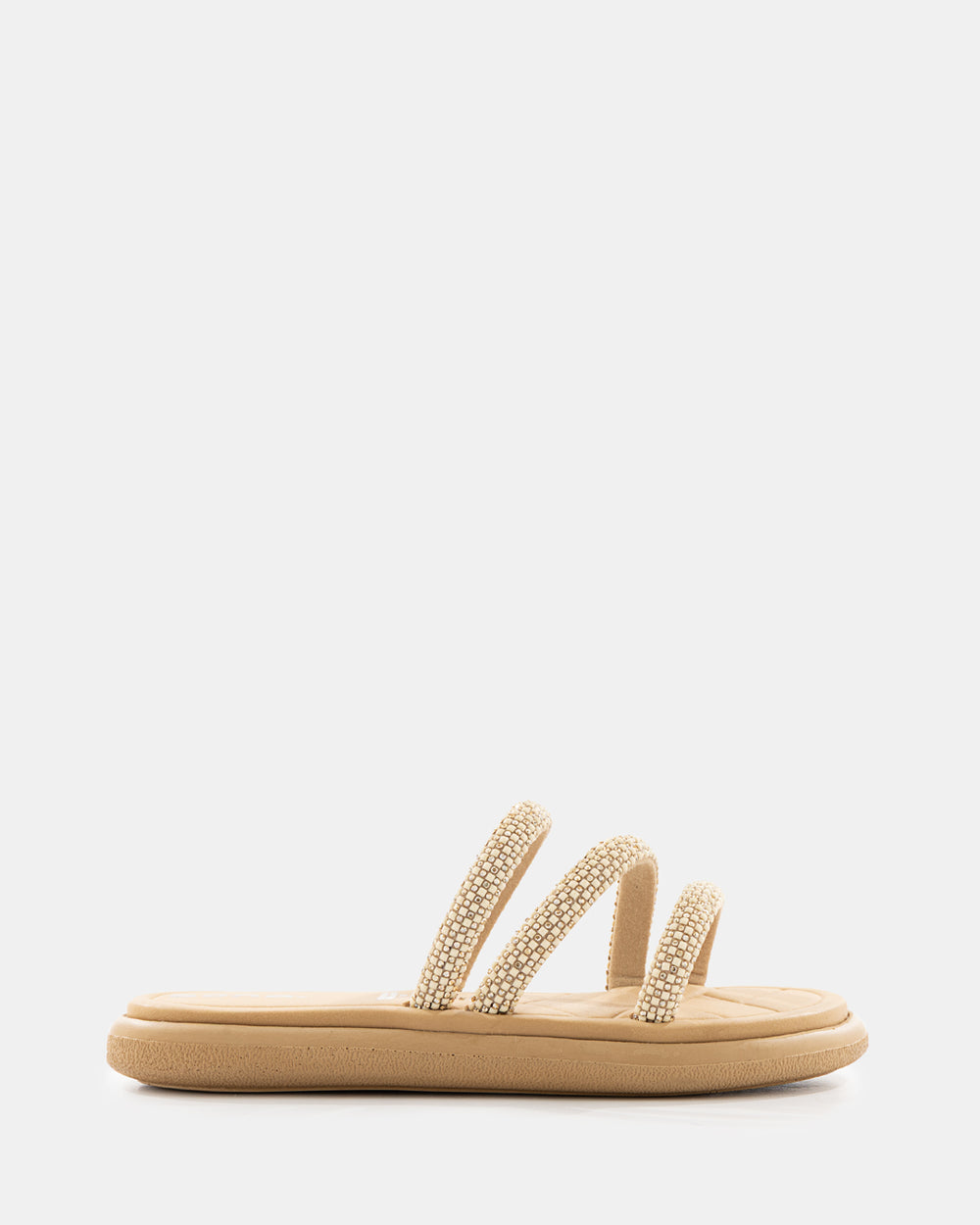 Sandalia slide que redefine el concepto de lujo casual. Diseñada con tiras completamente cubiertas de pedrería brillante, esta sandalia es la elección perfecta para quienes buscan destacar con elegancia sin sacrificar la comodidad del calzado tipo slide.