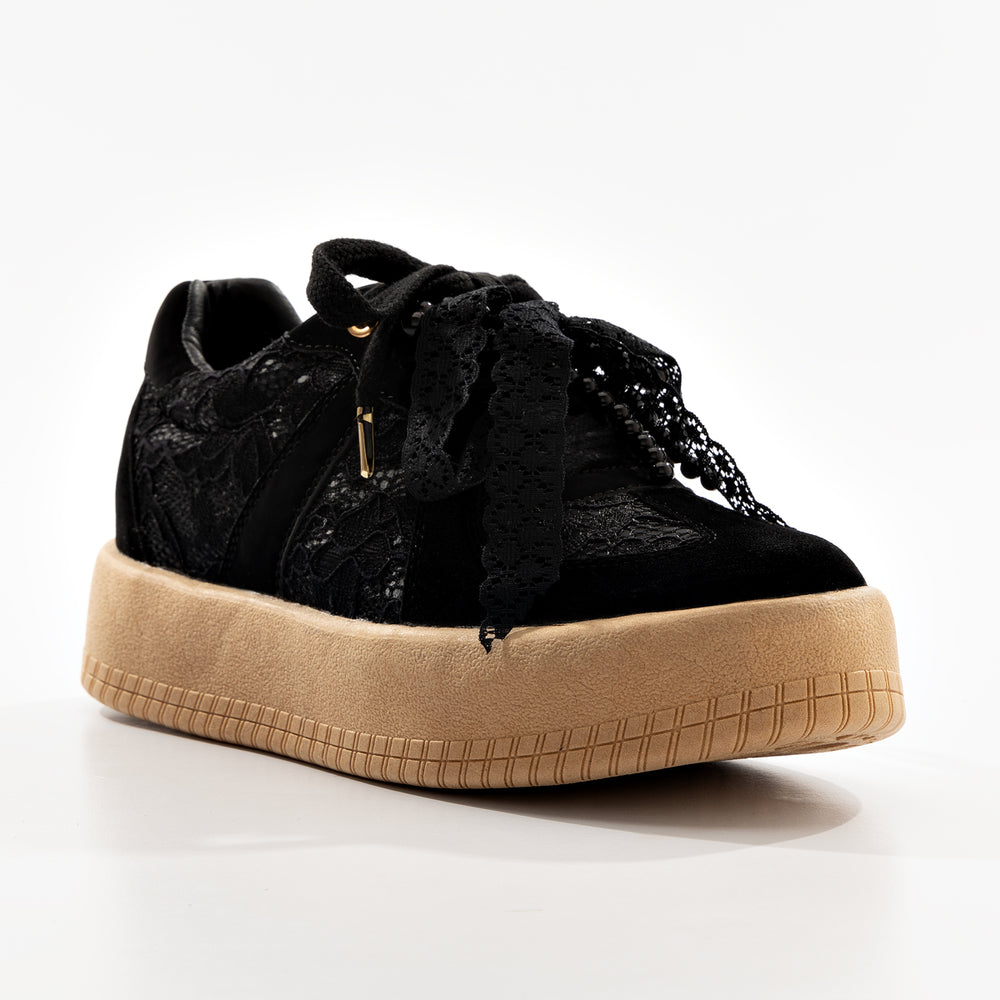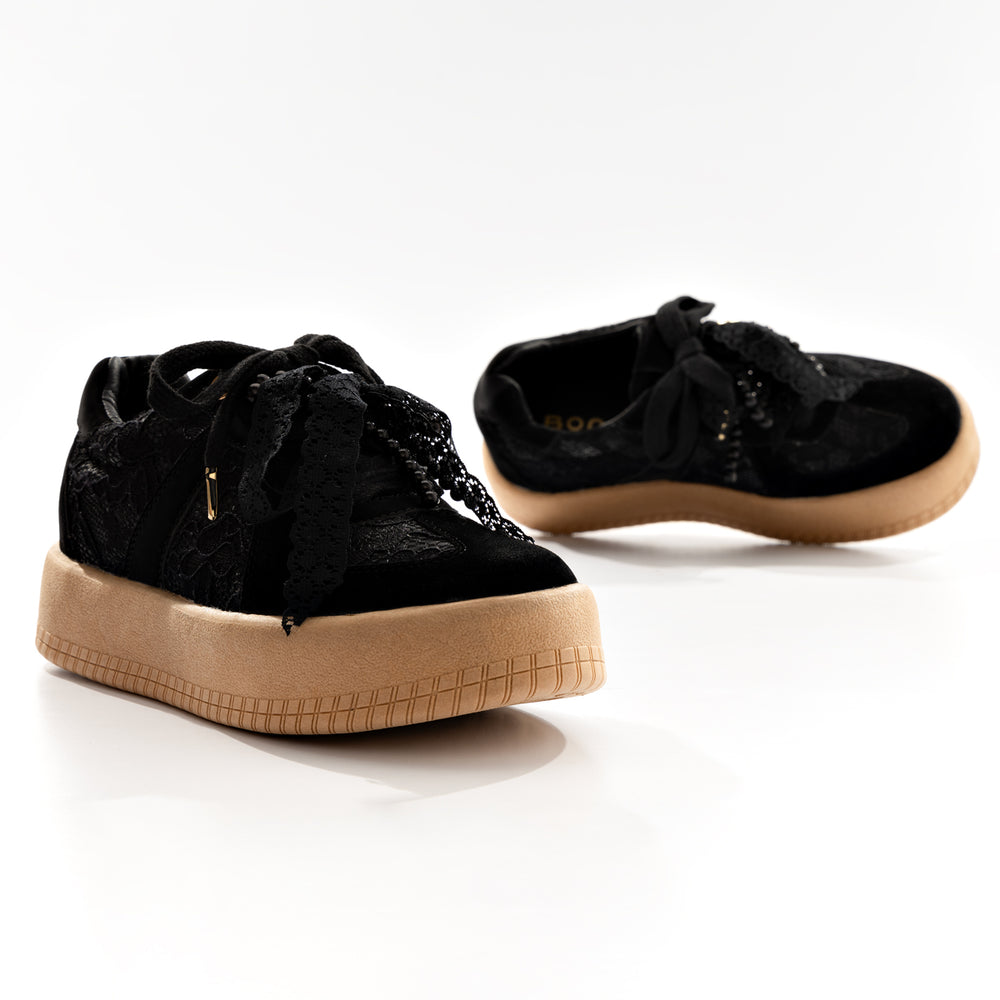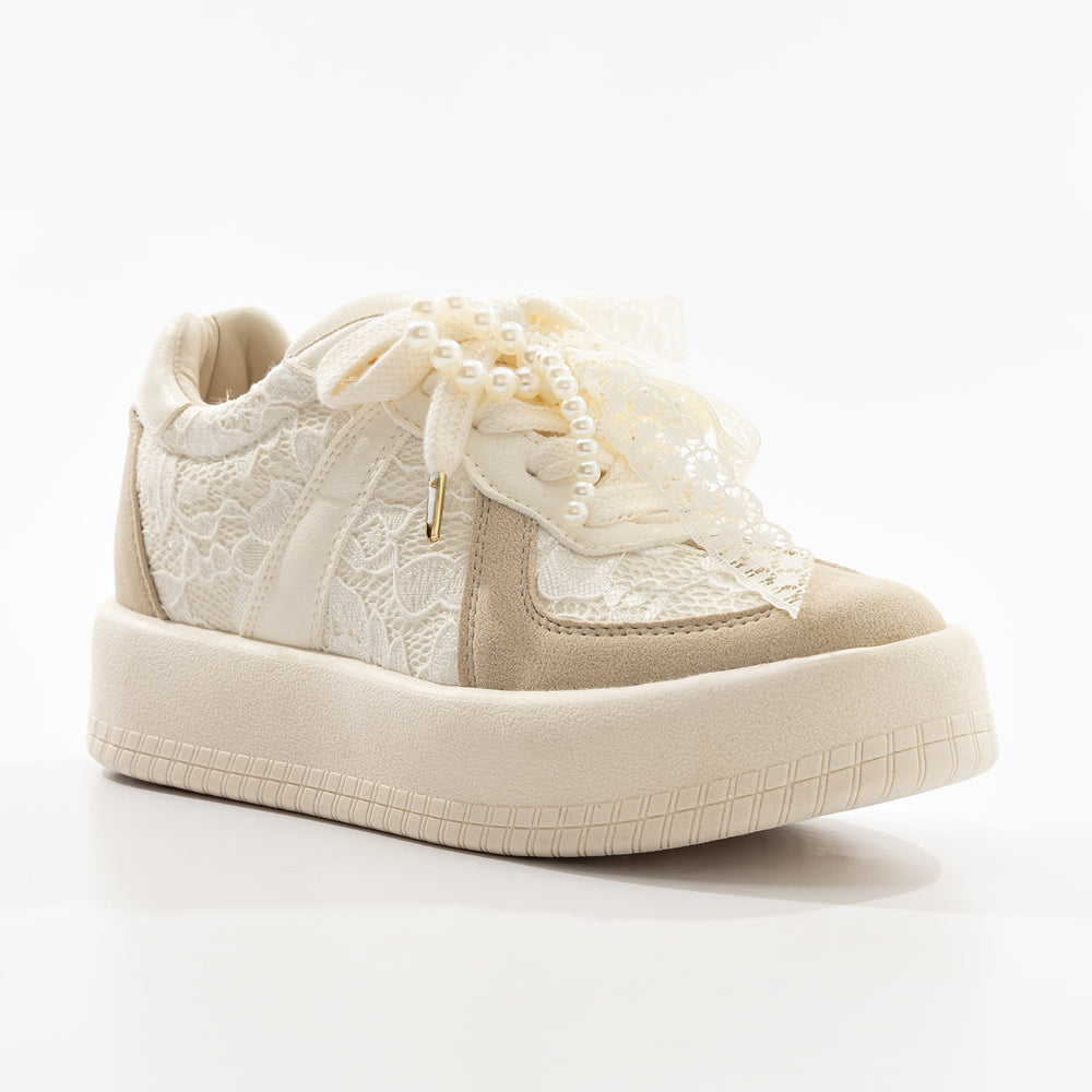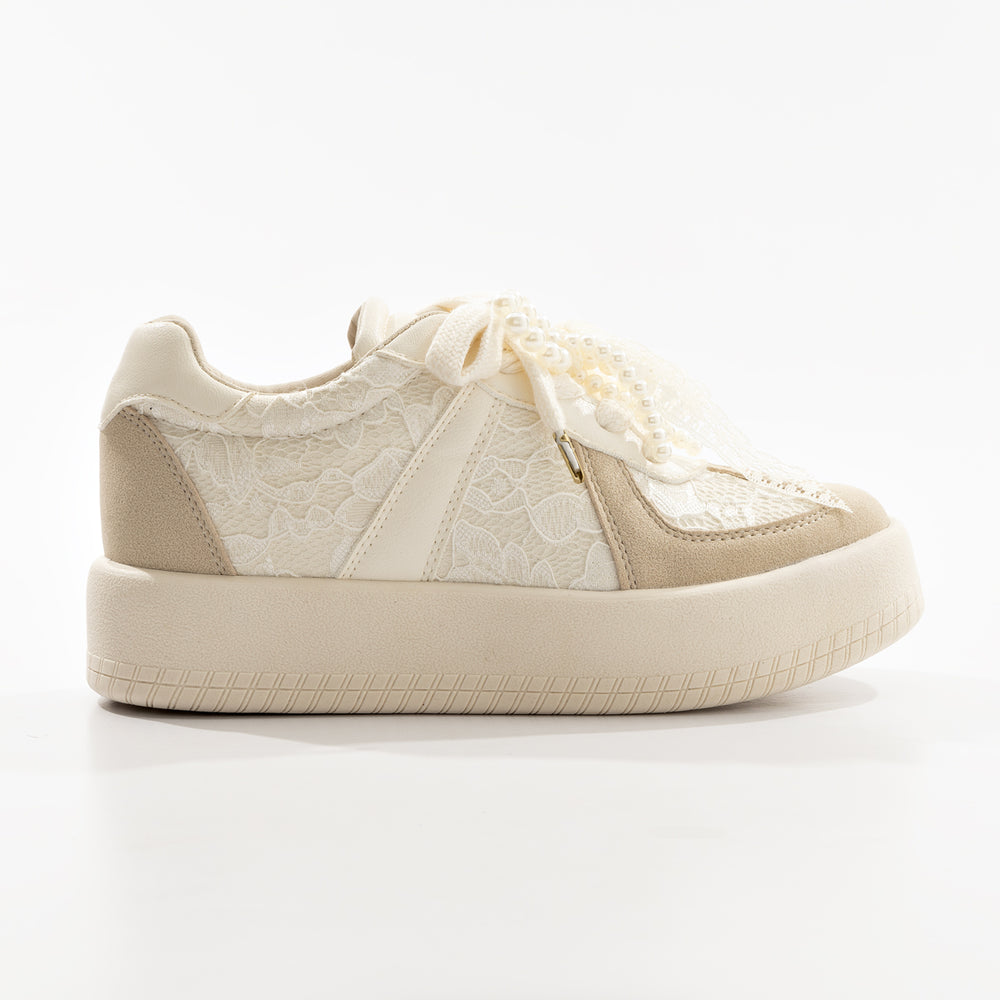 Tenis de moda para mujer, presenta un diseño delicado y sofisticado destaca por sus llamativos moños elaborados con una combinación de cordones de tela y encaje adornado con pequeñas perlas, añadiendo un aire romántico y elegante.