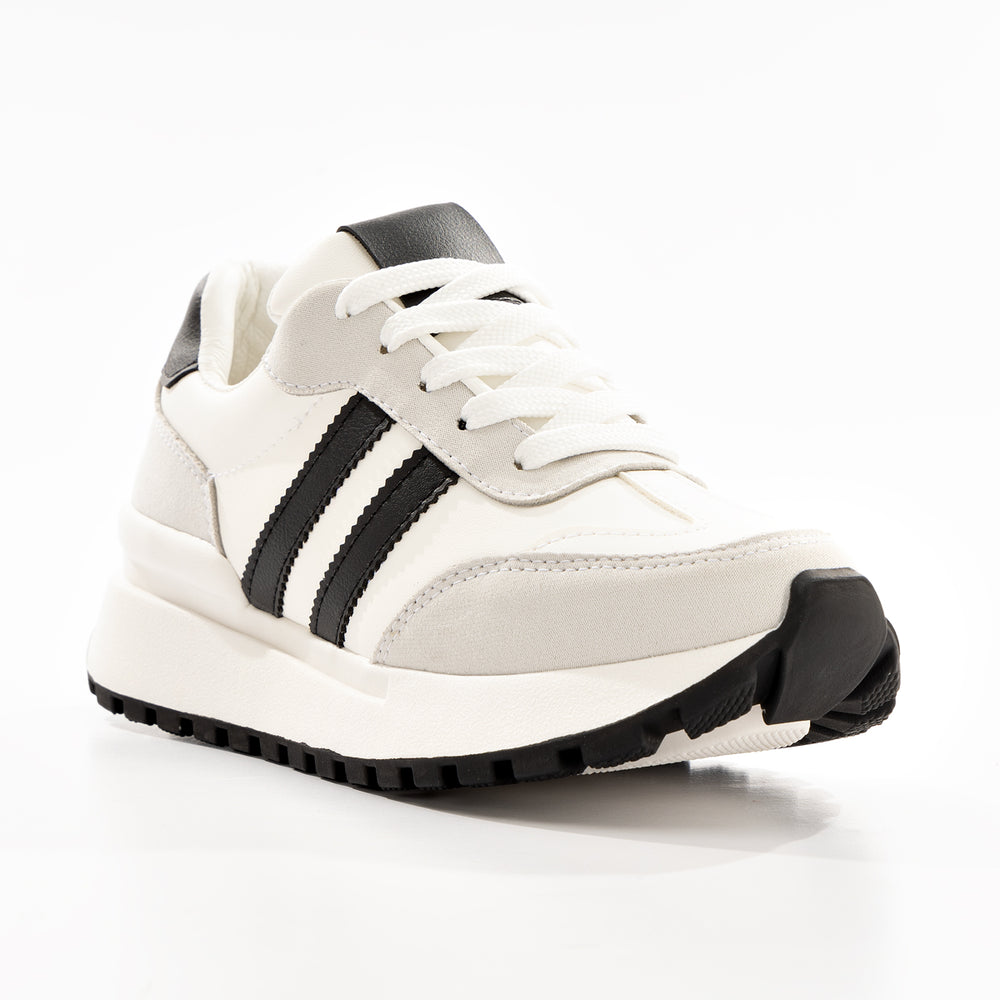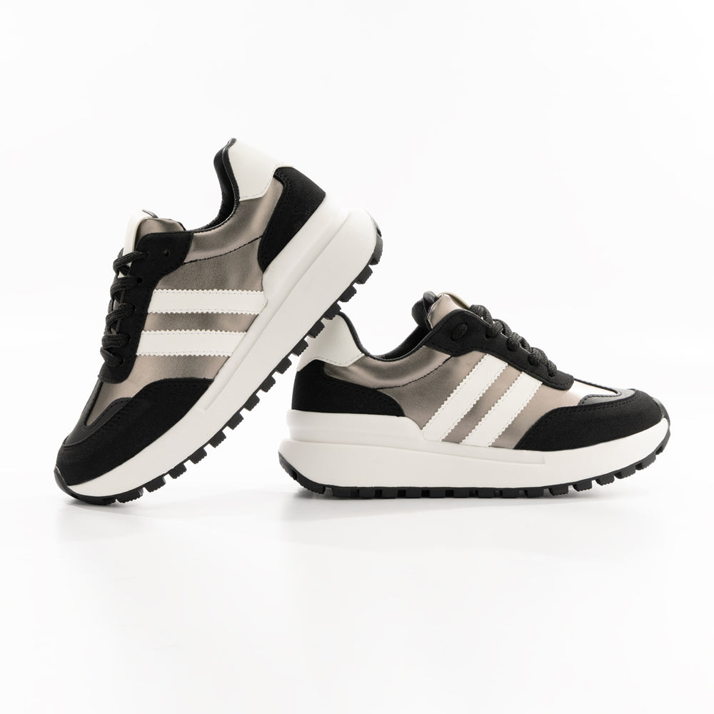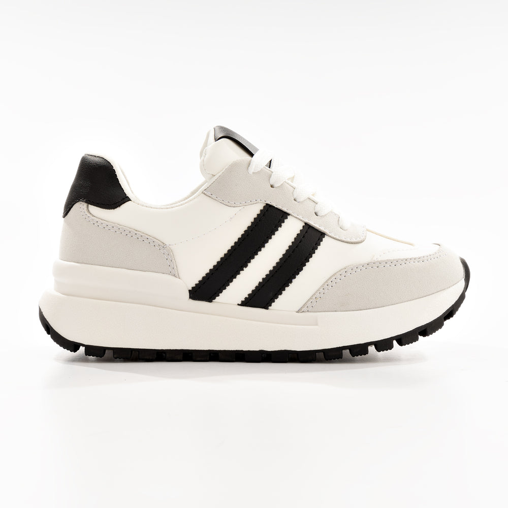 Tenis de moda para mujer, combinan un diseño clásico con detalles modernos para ofrecer un look versátil y cómodo. Su combinación de tonos blanco, negro y gris claro, junto con las franjas laterales en contraste, aportan un estilo urbano con inspiración retro.