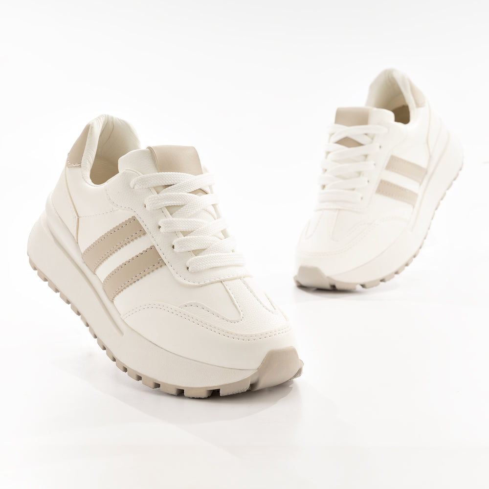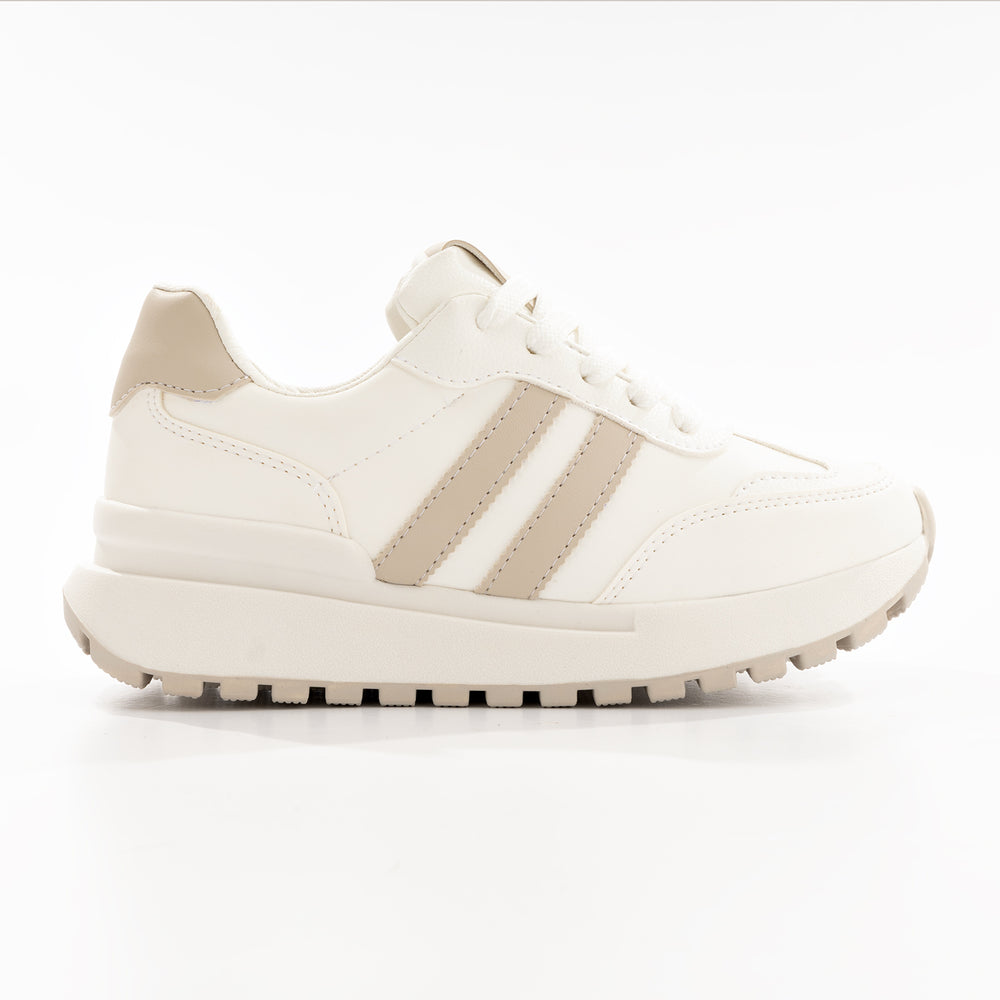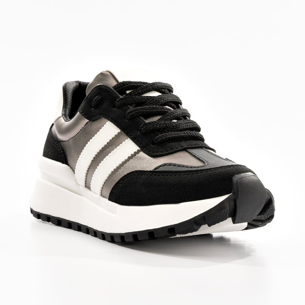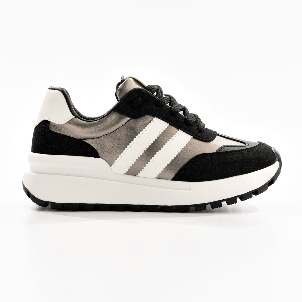 Tenis de moda para mujer, combinan un diseño clásico con detalles modernos para ofrecer un look versátil y cómodo. Su combinación de tonos blanco, negro y gris claro, junto con las franjas laterales en contraste, aportan un estilo urbano con inspiración retro.