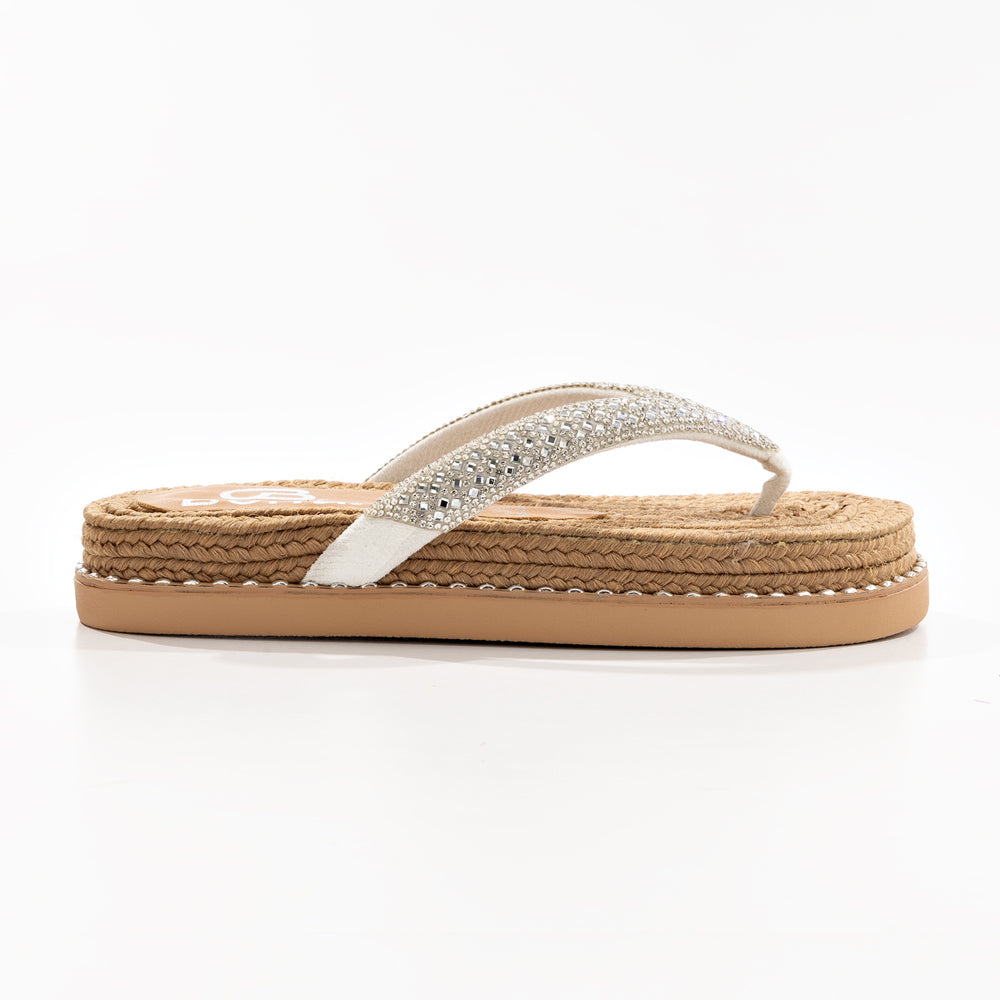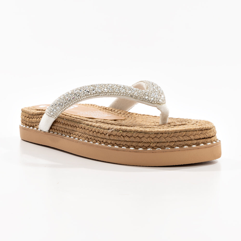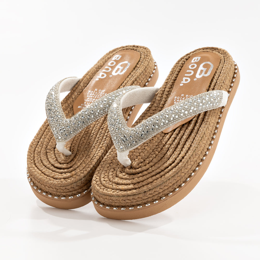 Sandalia de moda para mujer, con una base de yute trenzado que resalta su estilo natural y artesanal. Sus correas plateadas brillantes, decoradas con pedrería, añaden un toque glamoroso y elegante.