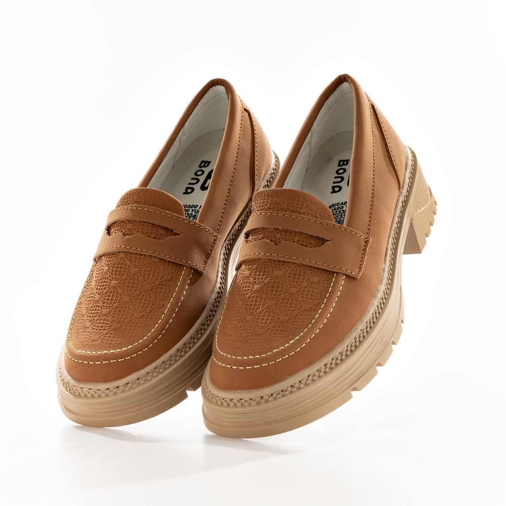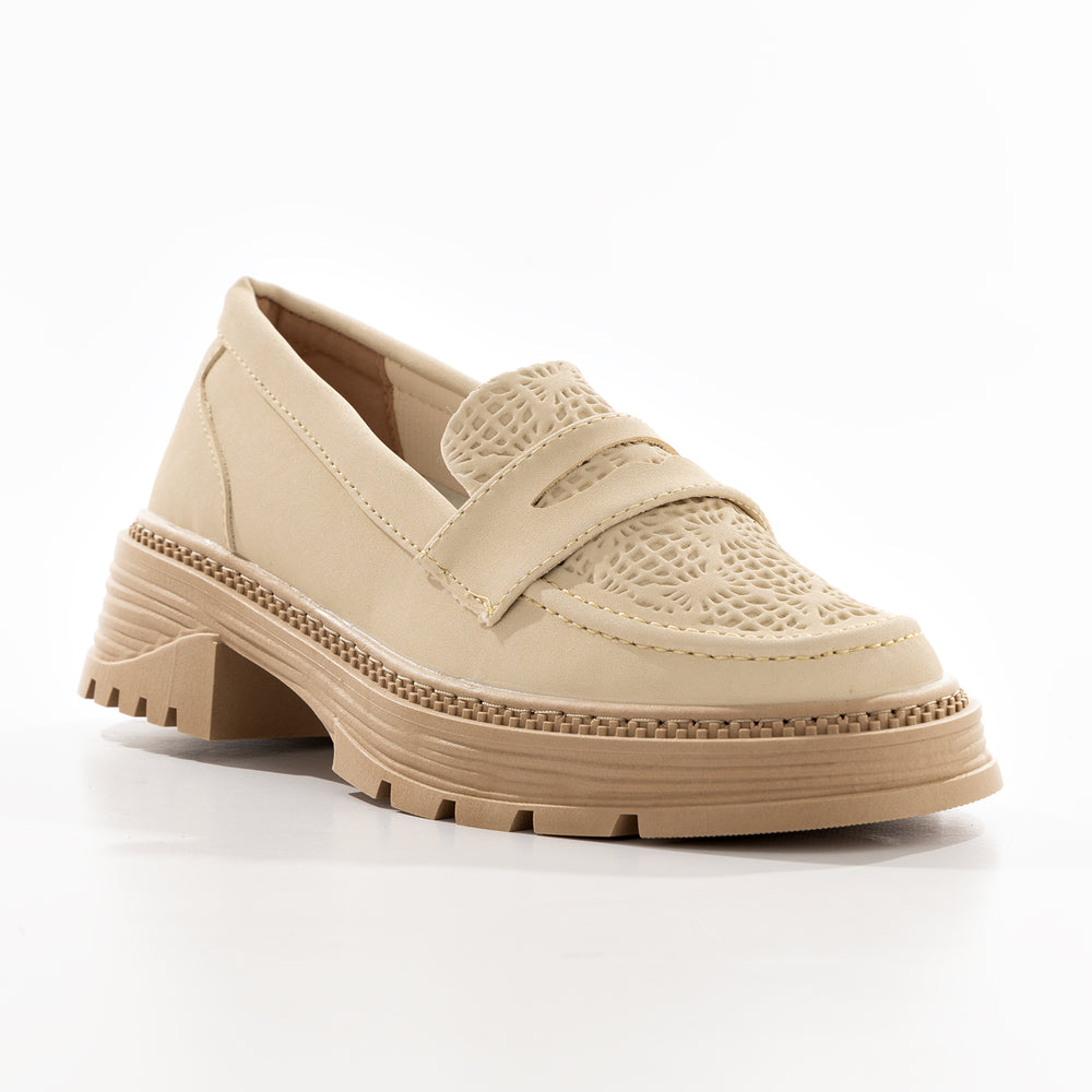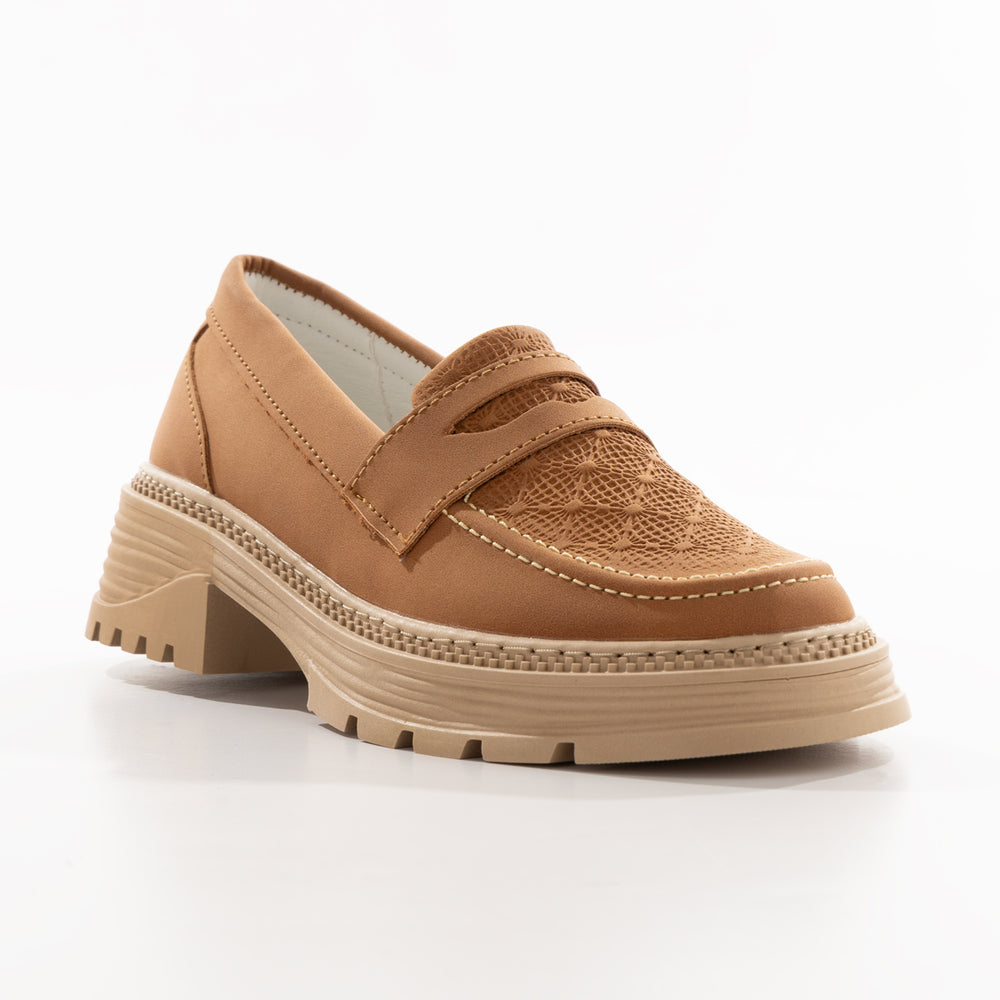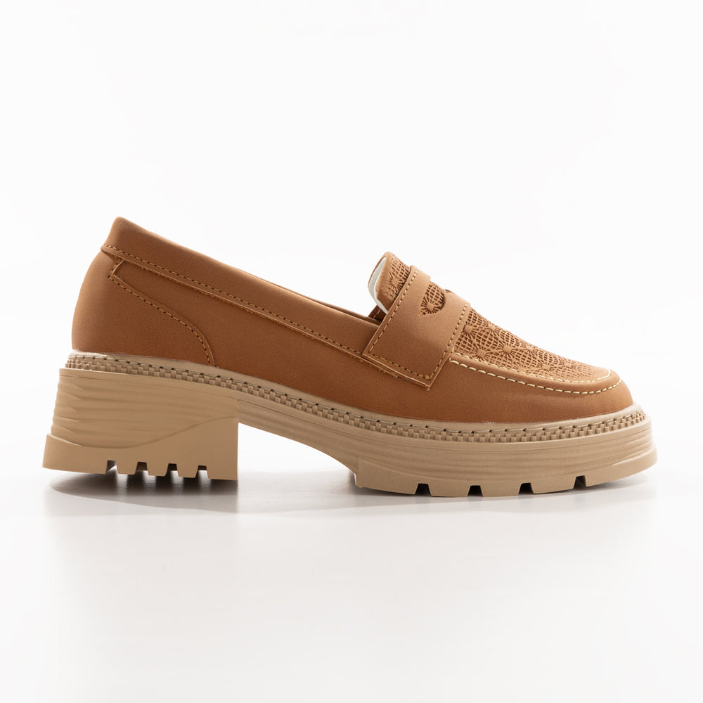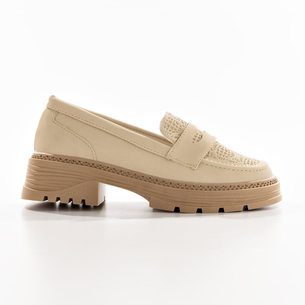Mocasines de moda para mujer, combina lo mejor del estilo clásico con la fuerza de las tendencias modernas. Su diseño tipo chunky con suela robusta, detalle tejido en la parte superior y acabado en tono arena lo convierten en un calzado versátil, ideal para mujeres que buscan comodidad y distinción.
