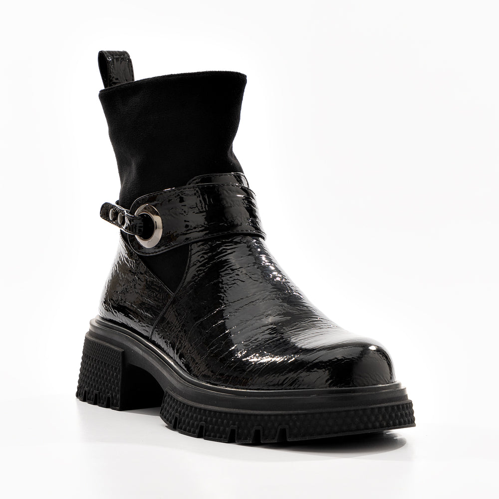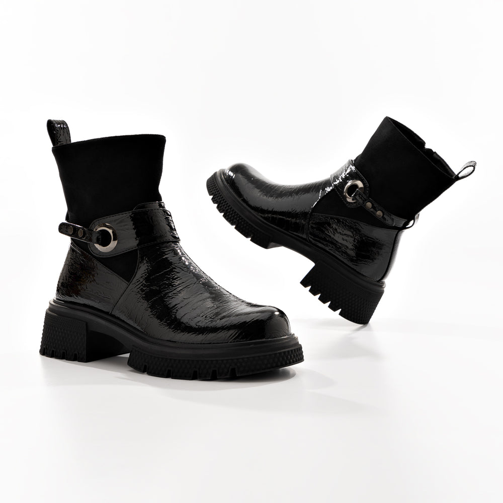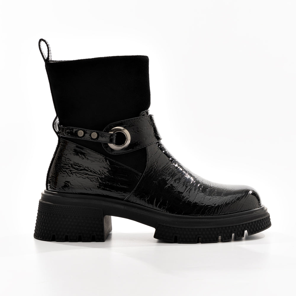 Botin de moda para mujer, combina actitud y elegancia en un diseño de inspiración militar. Presenta una suela gruesa tipo tractor que aporta firmeza y estilo. El detalle metálico en el lateral y la parte superior en contraste tipo gamuza le dan un aire sofisticado sin perder su esencia urbana.