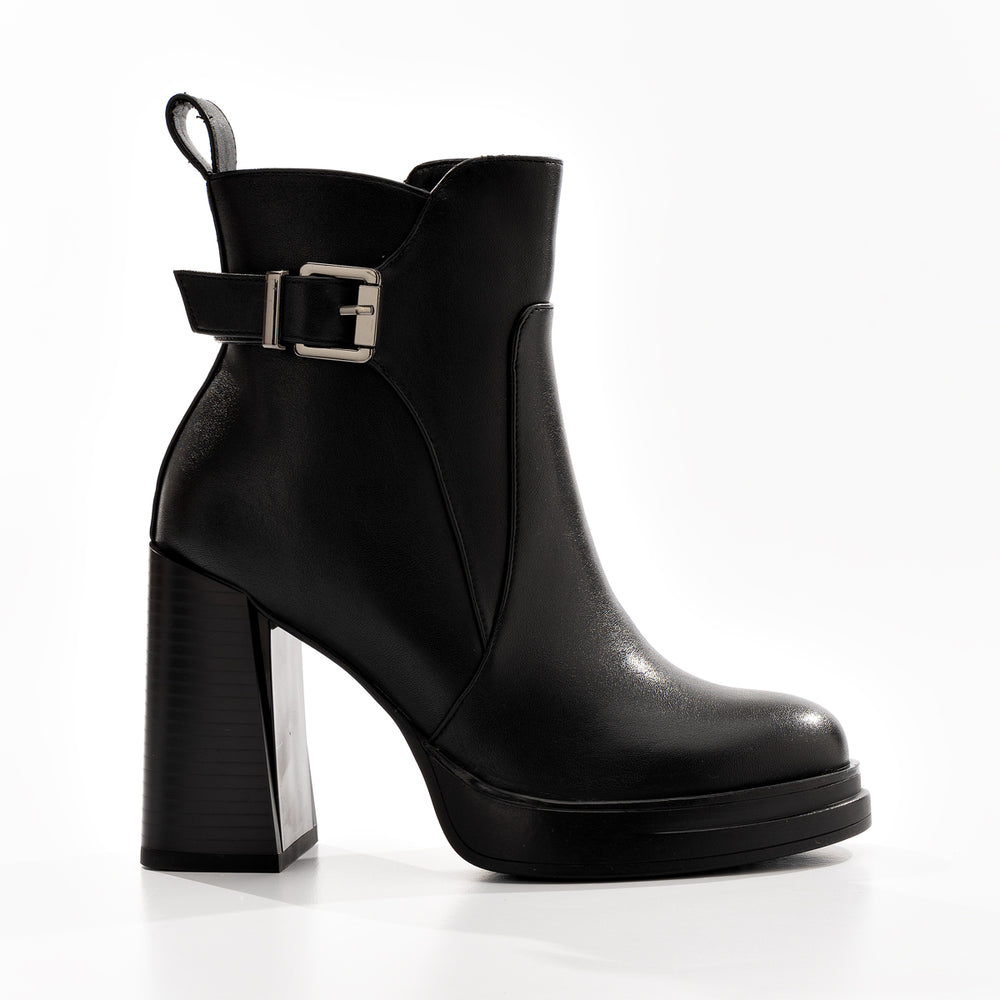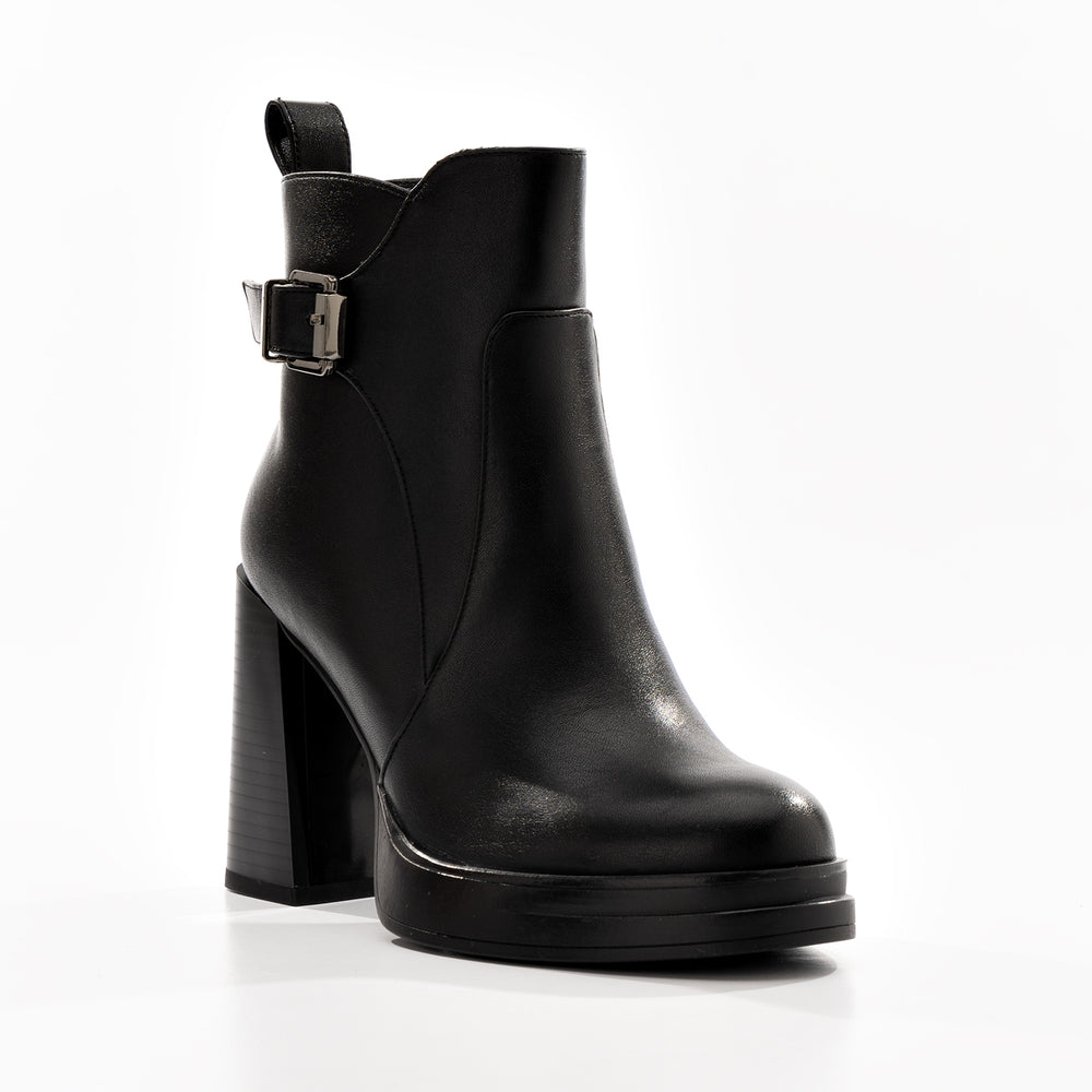 Botín de moda para mujer, Con un diseño contemporáneo y sofisticado, este botín negro es ideal para quienes buscan altura y estilo sin sacrificar comodidad. Cuenta con una plataforma delantera sutil que reduce la inclinación del pie, y un tacón alto y grueso que ofrece firmeza al caminar.