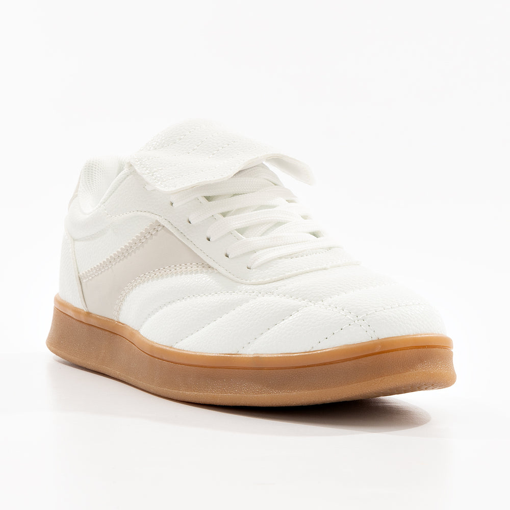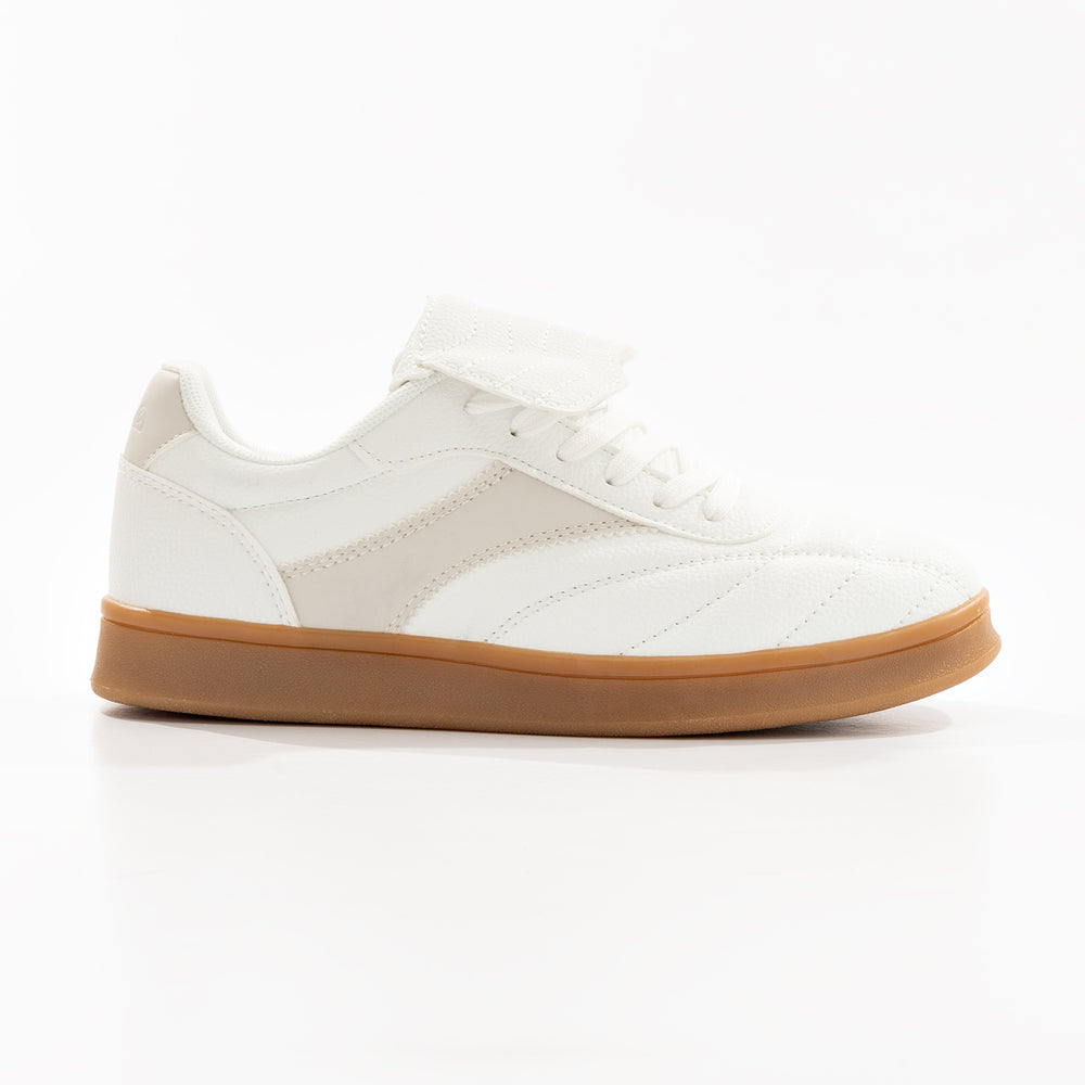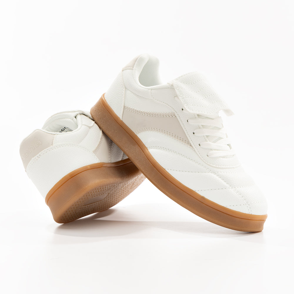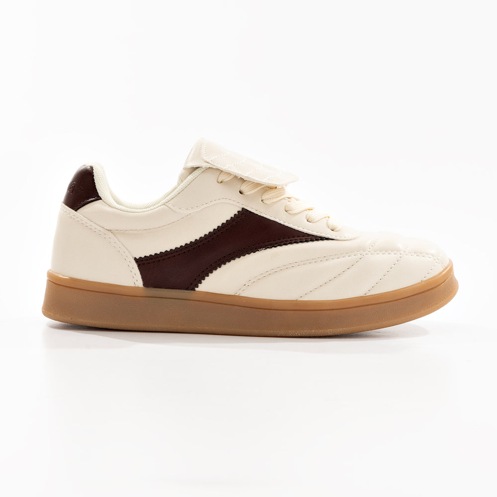Tenis de moda para mujer, dale un giro moderno y deportivo a tus outfits con estos tenis urbanos en tonos neutros. Fabricadas en material sintético de acabado acolchado, ofrecen un look sofisticado y cómodo. Su diseño en color crema se complementa con una franja lateral en tono marrón oscuro, creando un contraste elegante y atractivo.