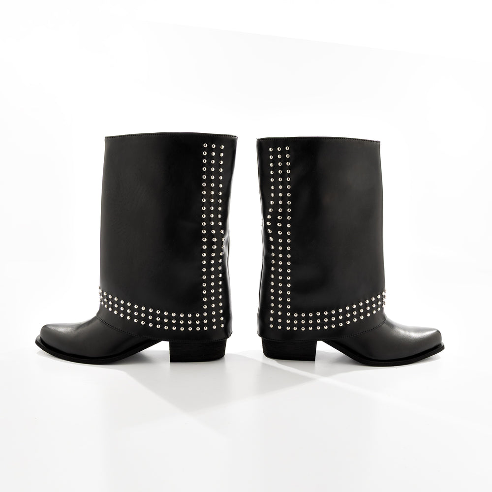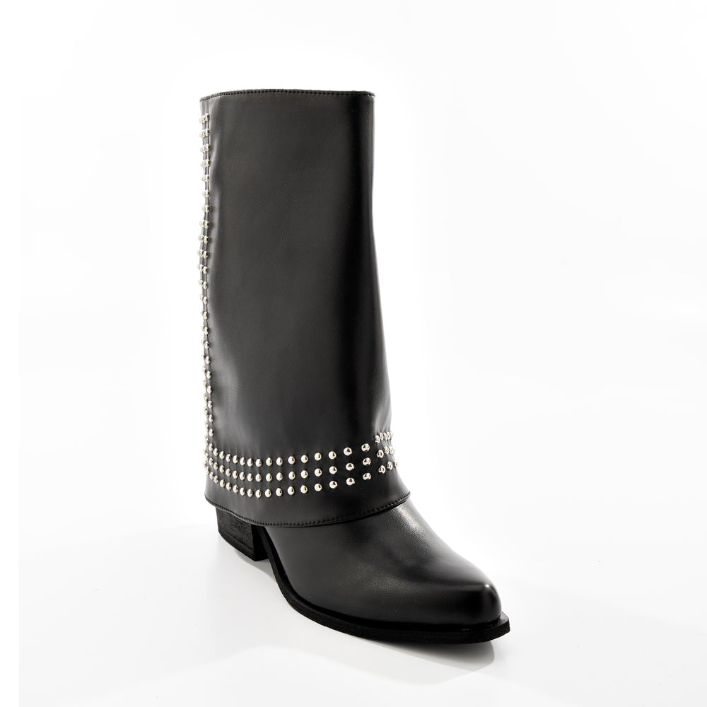Estas botas camperas en cuero sintético de alta calidad son la definición de western contemporáneo. Las tachuelas plateadas distribuidas estratégicamente en la caña y el borde inferior, añaden ese toque rock-chic que eleva el diseño clásico cowboy a un nivel completamente nuevo.