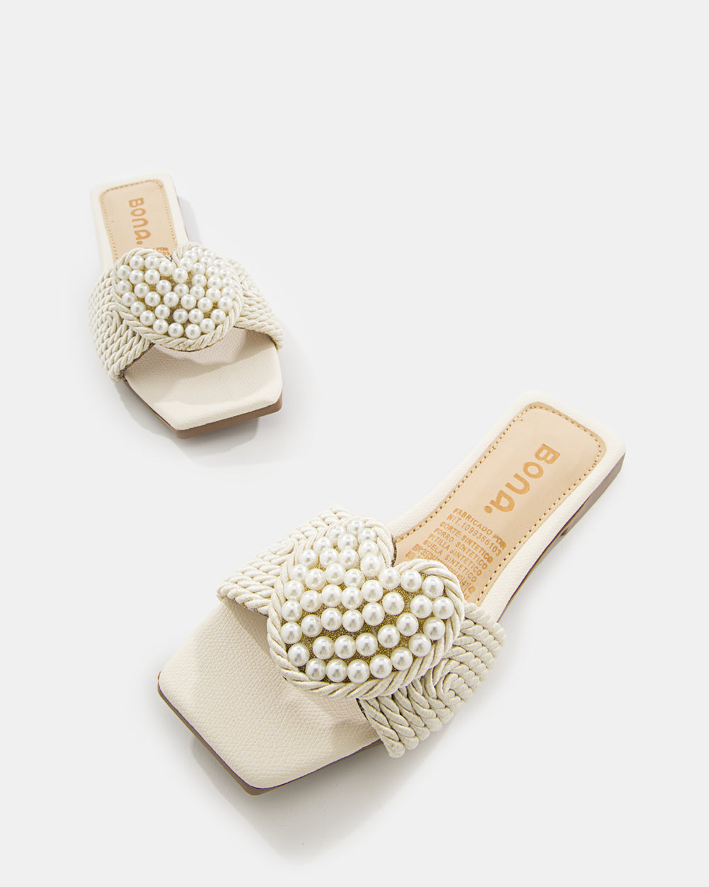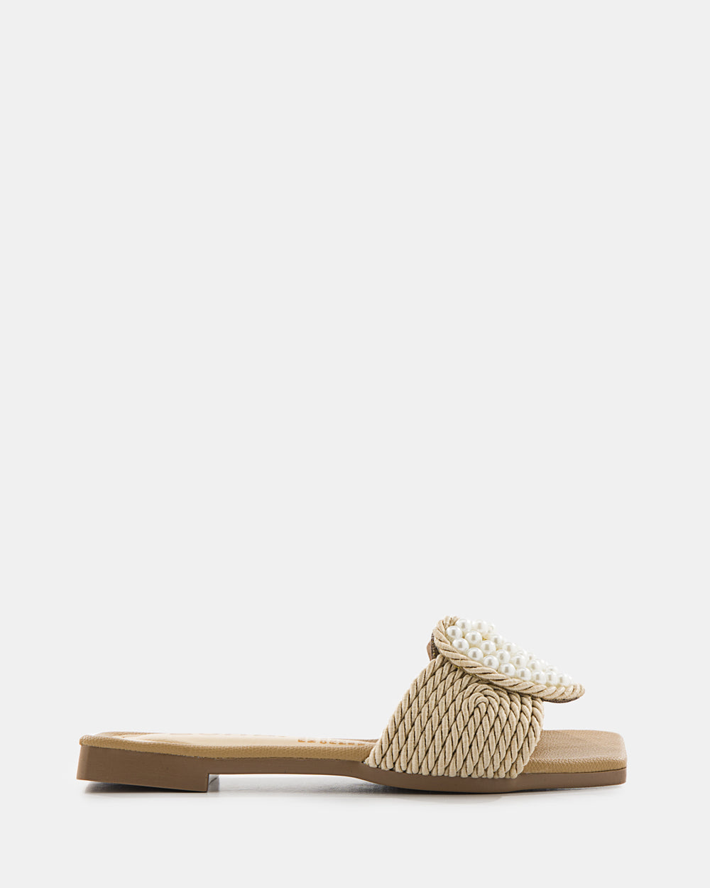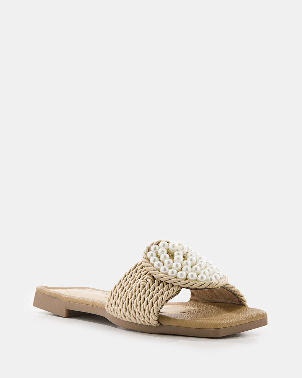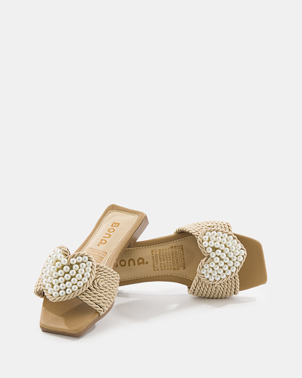 Sandalia slide de diseño artesanal que combina tejido de rafia con aplicaciones de perlas. El detalle floral con perlas y el tejido trenzado crean una pieza statement perfecta para la mujer que busca sofisticación bohemia y comodidad absoluta.