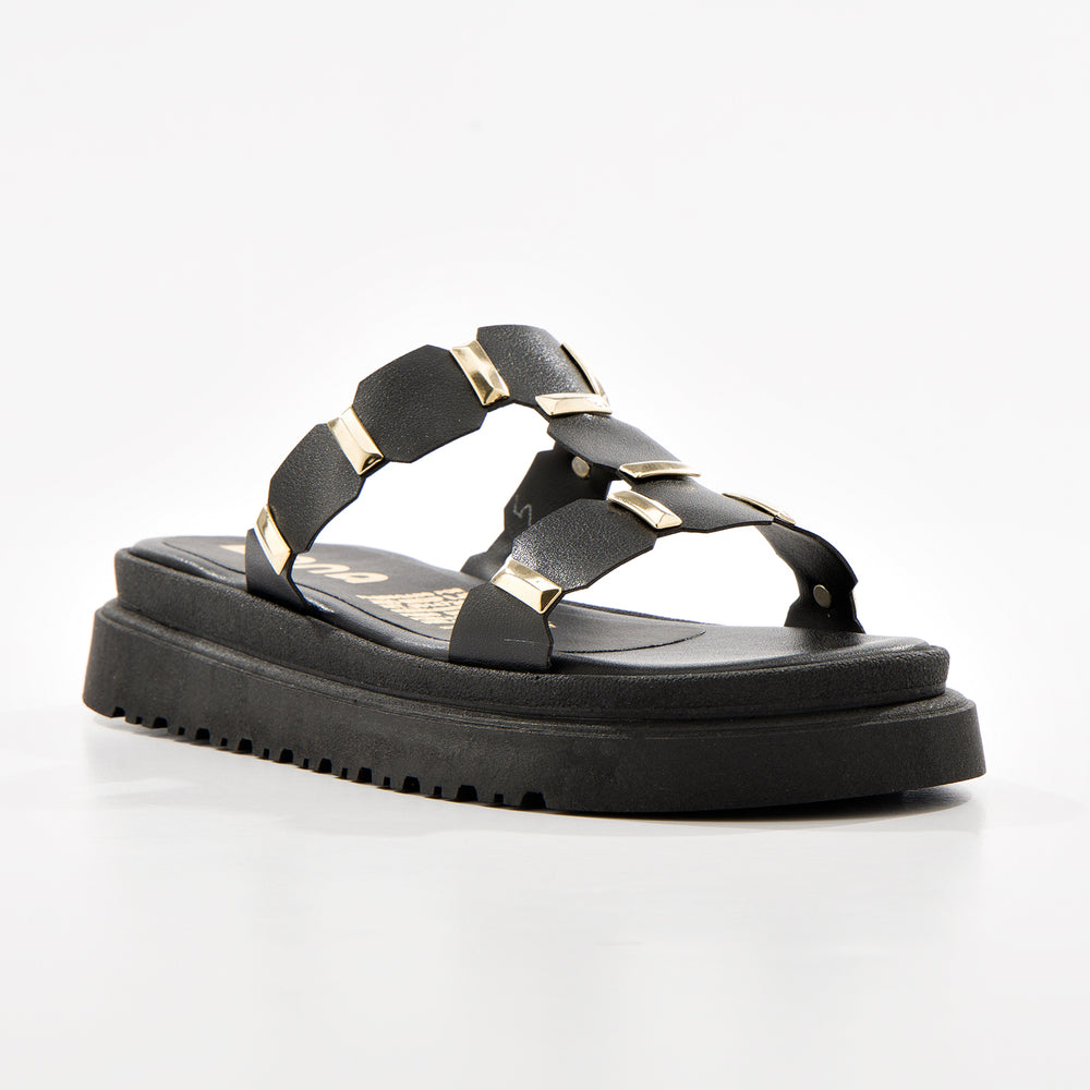 Sandalias tipo slide con plataforma chunky en cuero sintético premium de alta calidad y elegantes detalles metálicos dorados. Diseño urbano-contemporáneo que combina tendencia, comodidad y estilo atrevido. La plataforma chunky te da altura mientras que los detalles metálicos aportan un toque de sofisticación. Ideales para el día a día con un toque de personalidad.