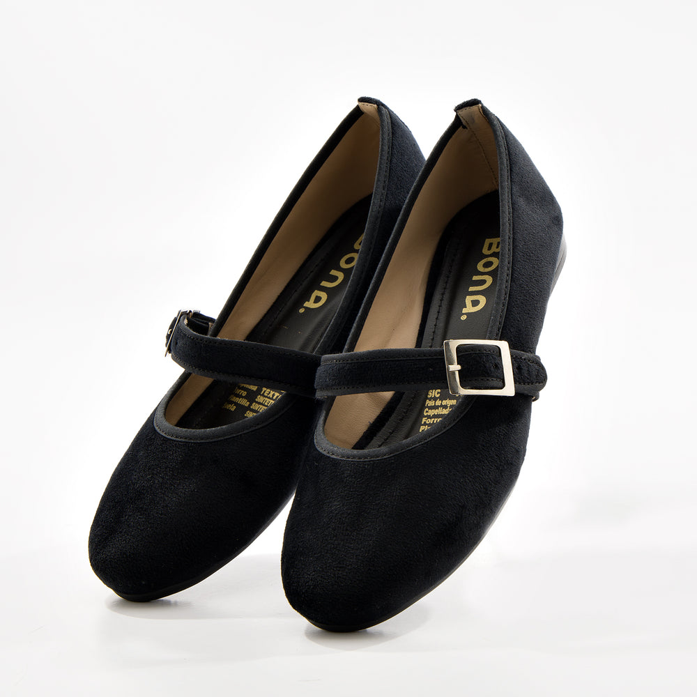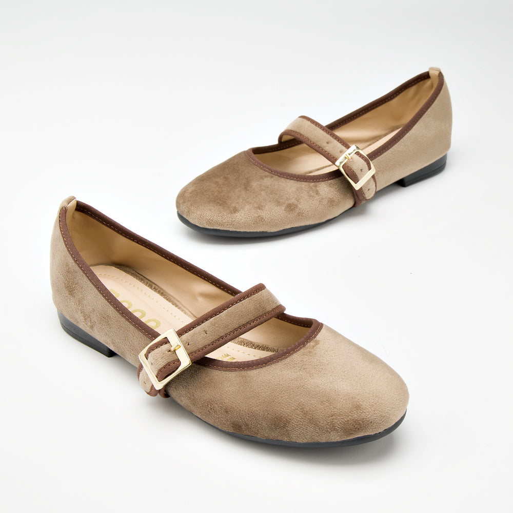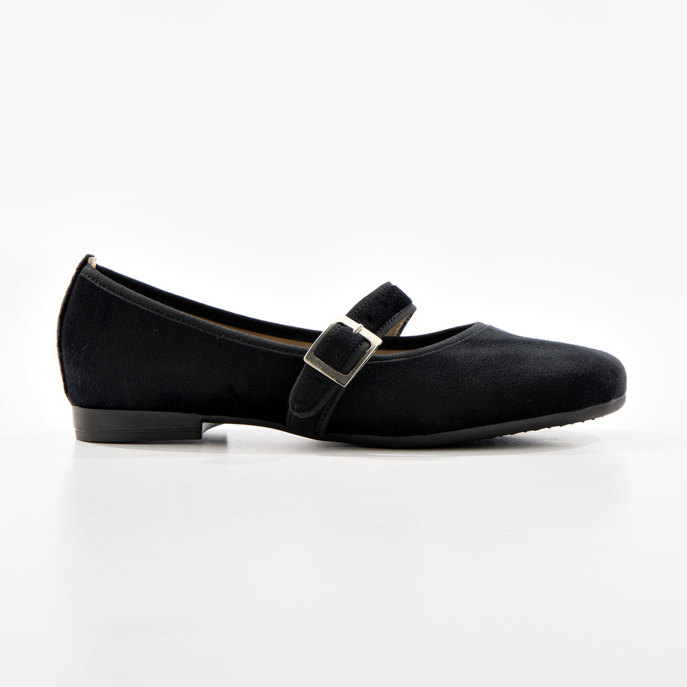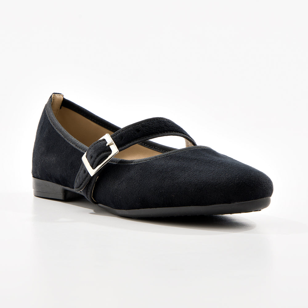 Baletas tipo Mary Jane con textura suave tipo gamuza sintética premium y elegante tira cruzada y hebilla dorada. Diseño sofisticado y femenino que combina el estilo clásico con un toque contemporáneo, perfectas para cualquier ocasión.