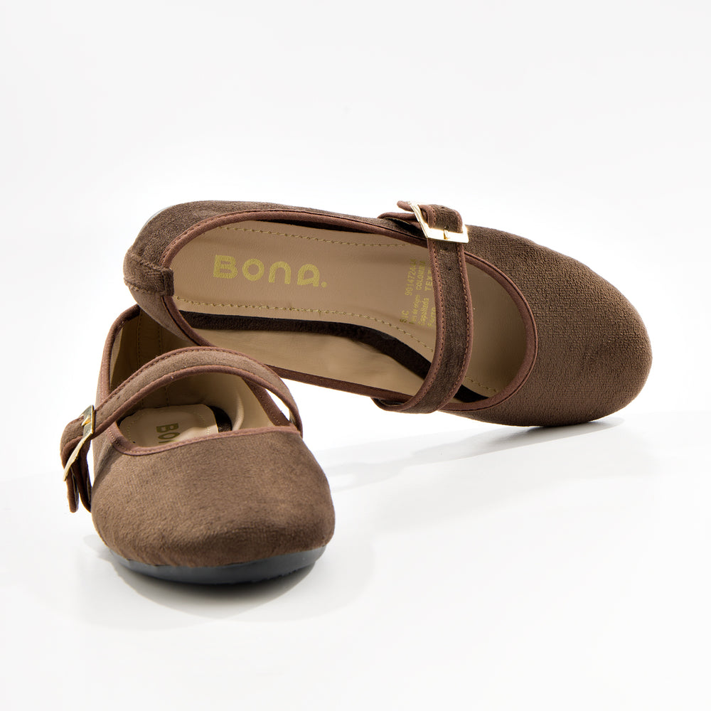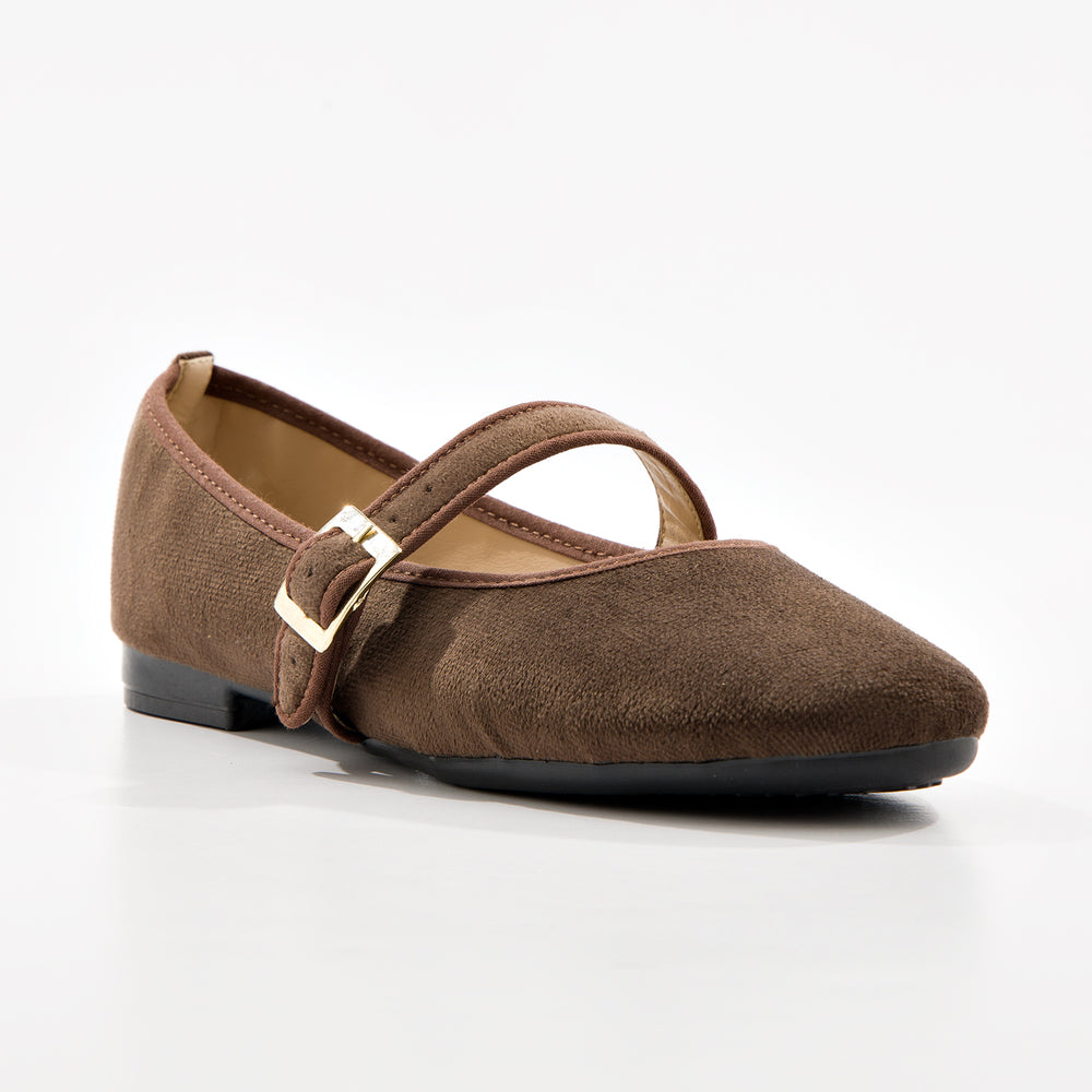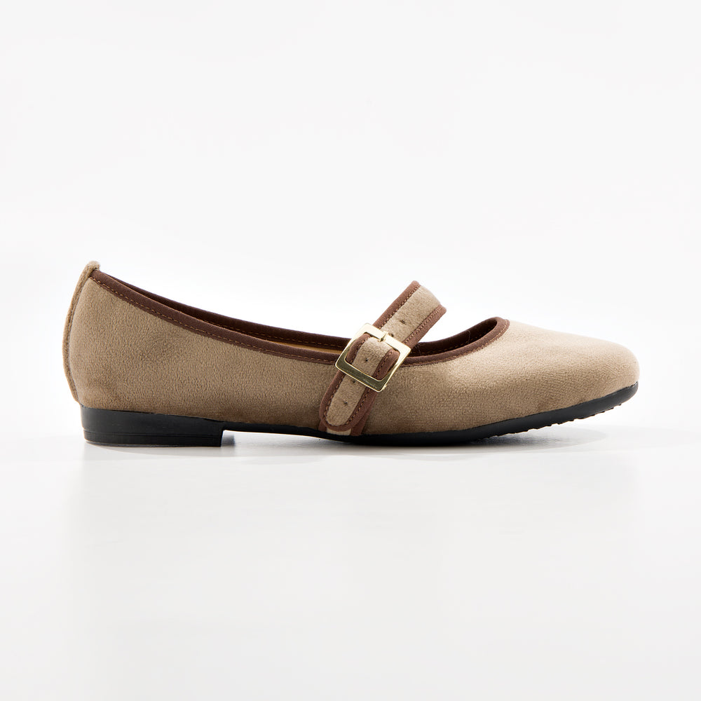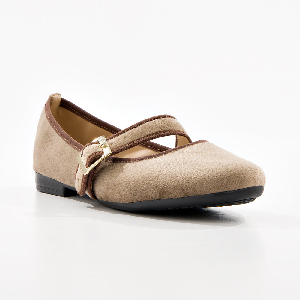 Baletas tipo Mary Jane con textura suave tipo gamuza sintética premium y elegante tira cruzada y hebilla dorada. Diseño sofisticado y femenino que combina el estilo clásico con un toque contemporáneo, perfectas para cualquier ocasión.