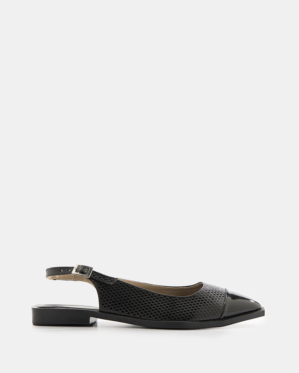 Este slingback representa la evolución del calzado clásico con toques contemporáneos. El diseño cap toe bicolor crea un punto focal distintivo que eleva el zapato plano de básico a statement. La textura cocodrilo añade dimensión y sofisticación, mientras que la punta cuadrada moderna equilibra la estética clásica con tendencias actuales. La correa slingback con hebilla plateada aporta funcionalidad y un toque de brillo discreto.