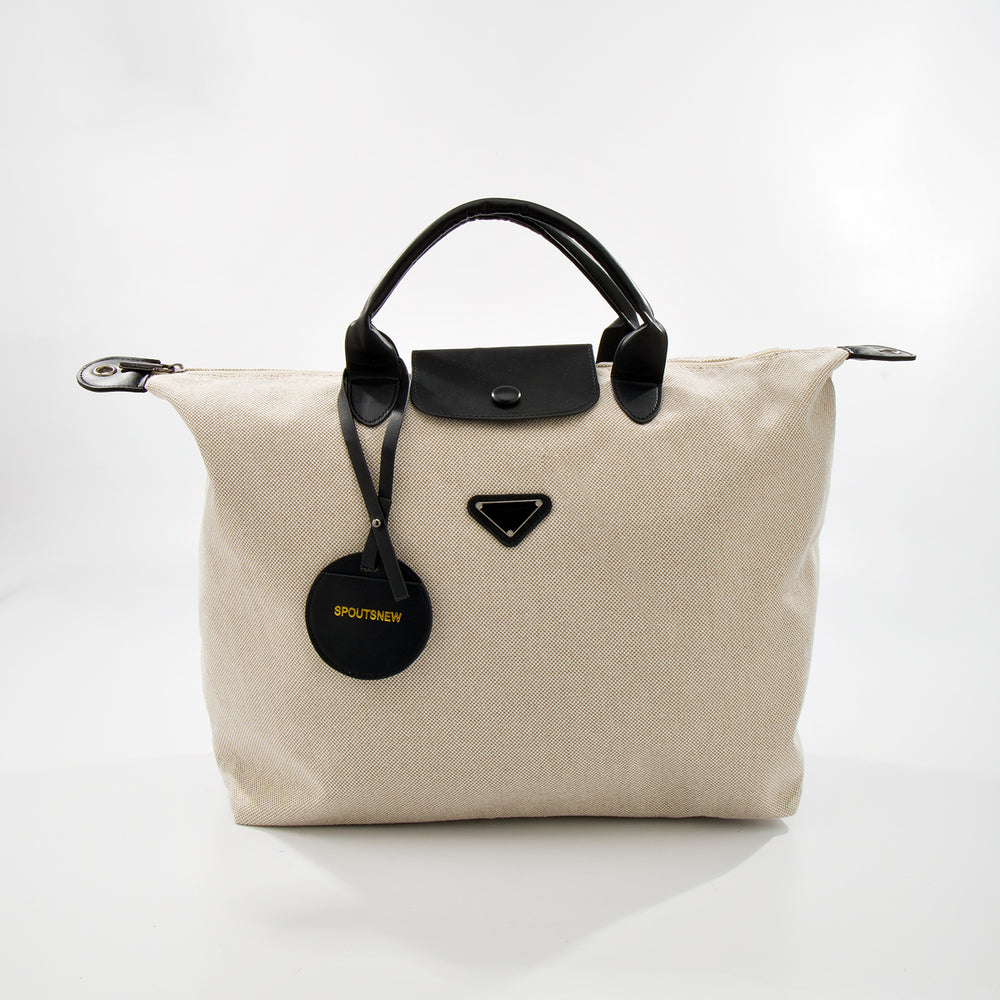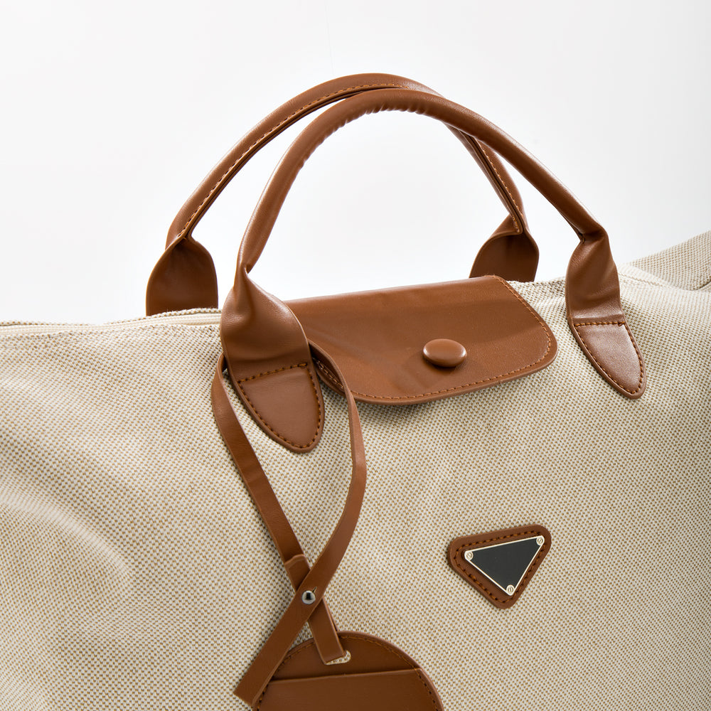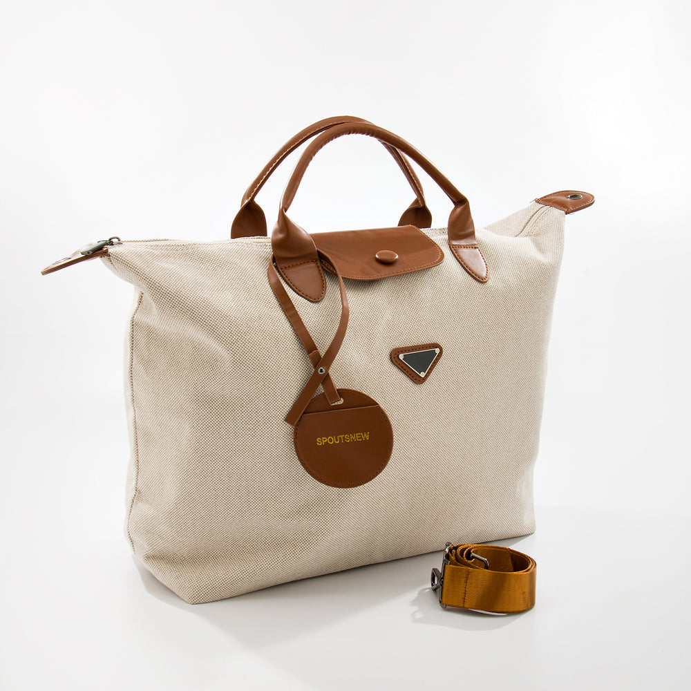 Bolsos de moda para mujer, diseño tote espacioso y versátil, material textil beige de alta calidad, asas en cuero marrón resistentes y cómodas y solapa frontal en cuero con cierre magnético.