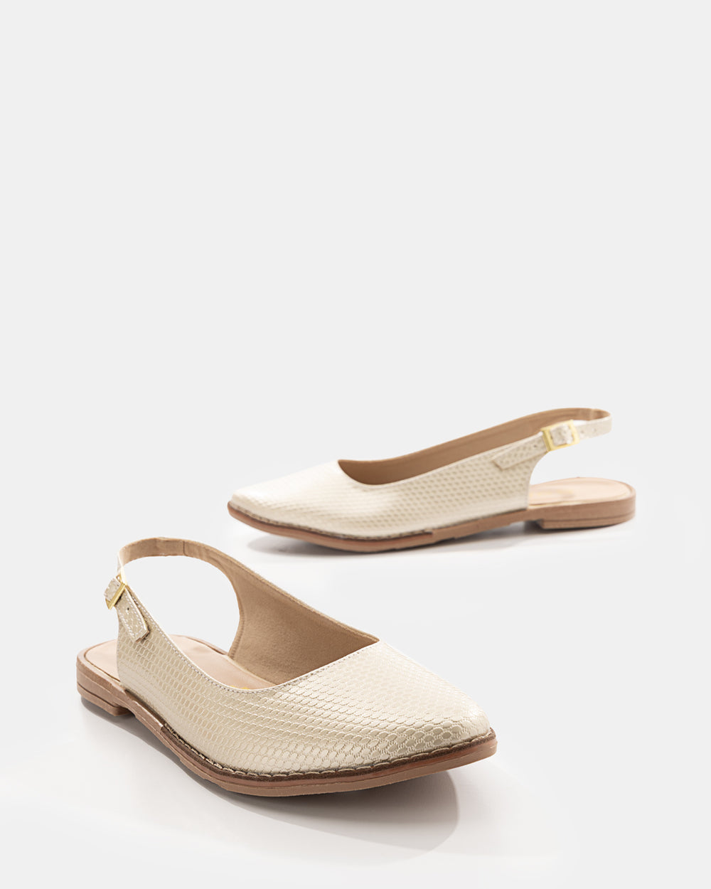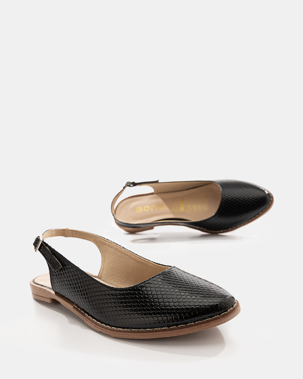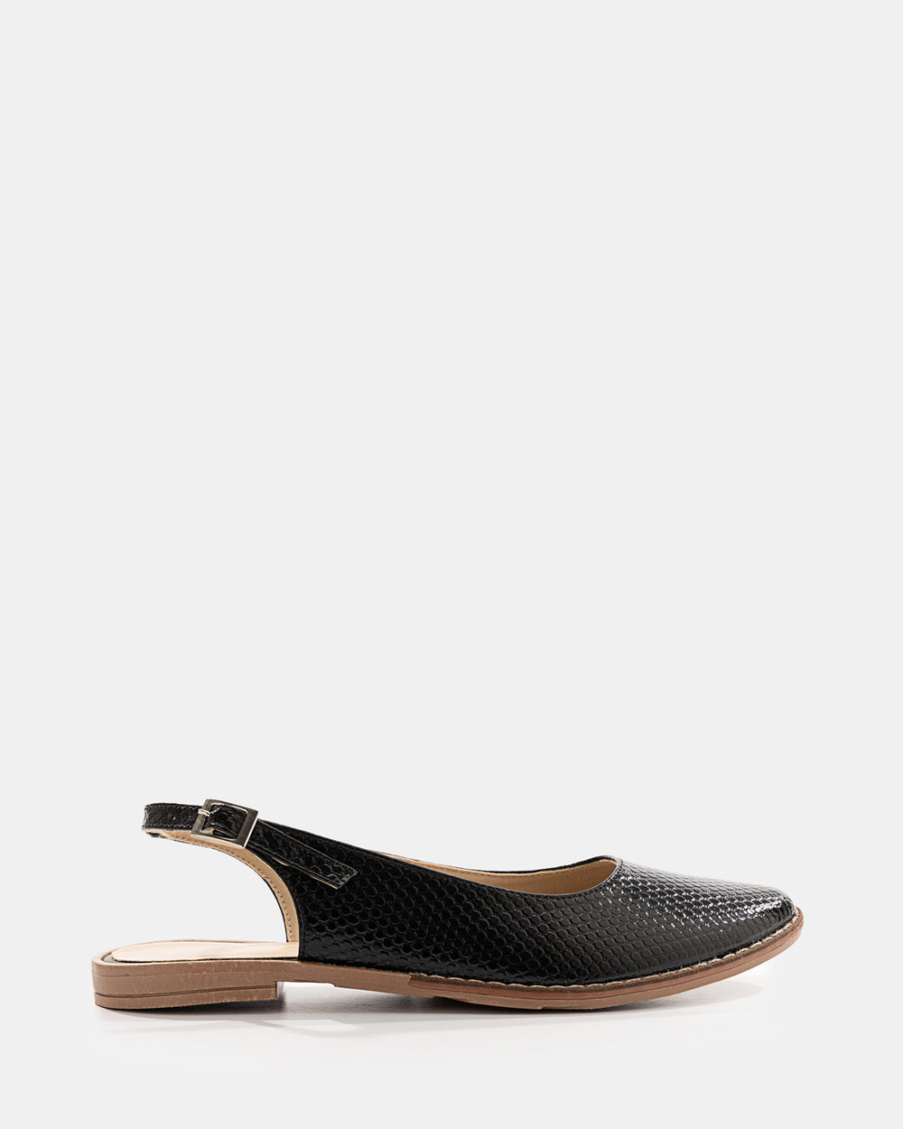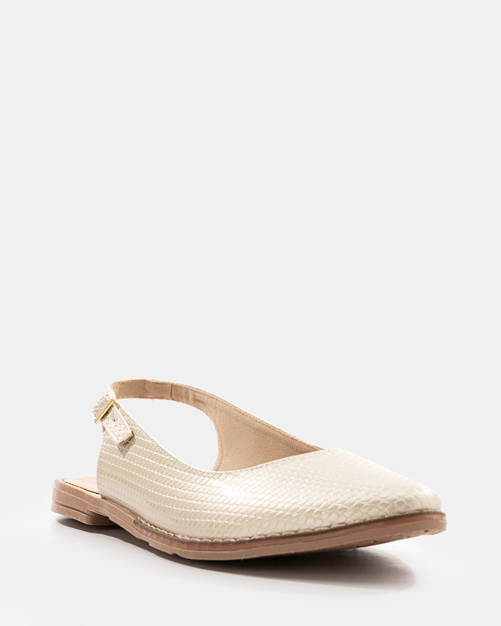 Baleta cerrada destalonada fabricada en cuero sintético texturizado tipo cocodrilo con terminaciones premium. Elaborada con capellada de cuero sintético grabado, plantilla forrada en material suave, suela plana de cuero sintético con taco bajo en madera natural y correa posterior ajustable con hebilla metálica dorada. Incorpora costuras decorativas en tono contrastante, punta cuadrada alargada y base antideslizante.