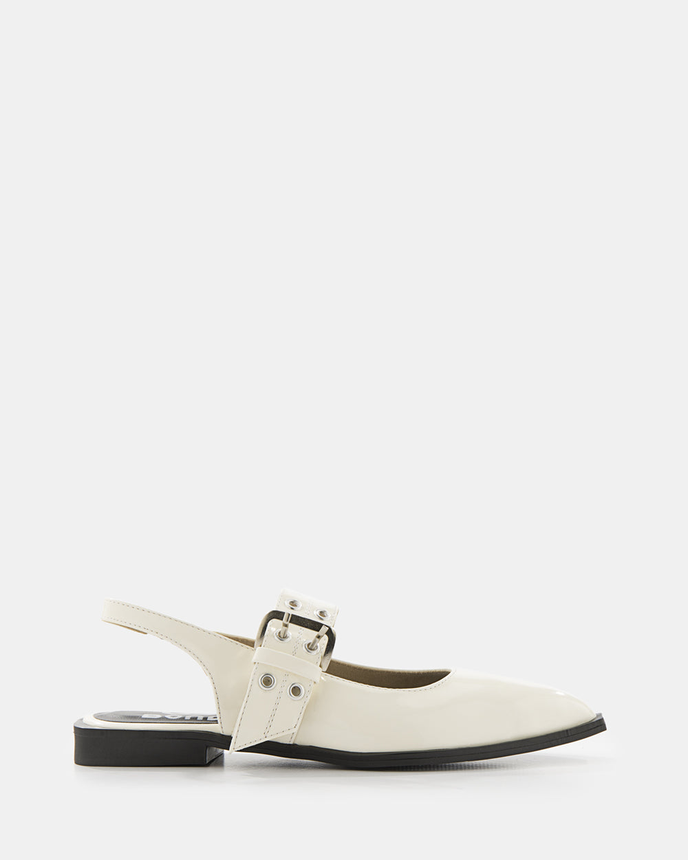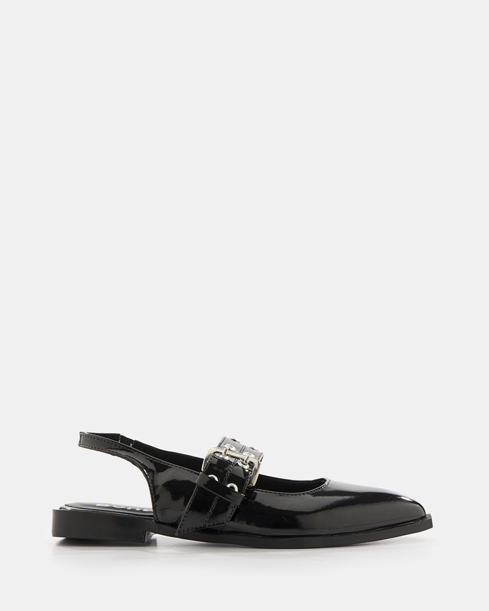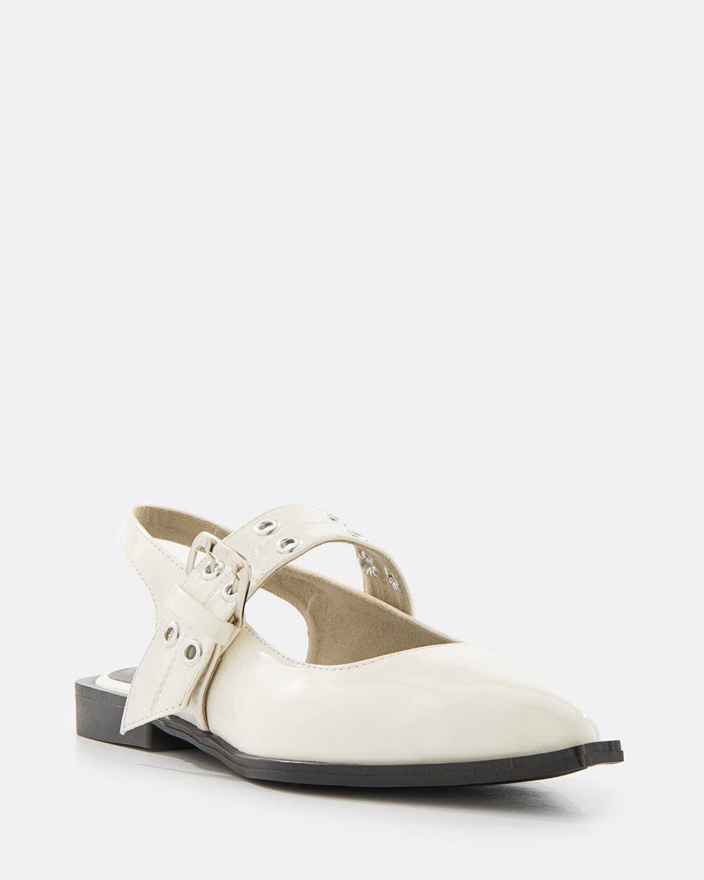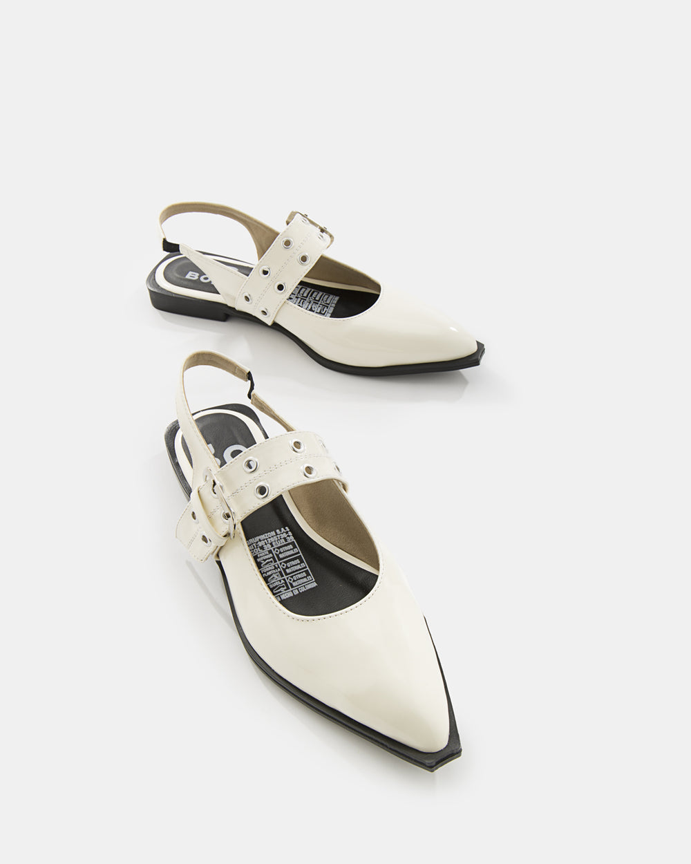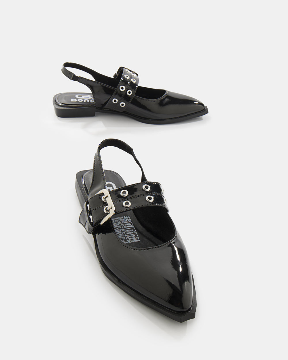 Baleta destalonadas urbanas con diseño moderno. Puntera afilada que estiliza el pie. Aplicaciones de tachuelas plateadas en tiras cruzadas que aportan personalidad y estilo irreverente. Talonera ajustable con elástico para calce perfecto. Tacón bajo cuadrado que brinda estabilidad y comodidad. Confeccionadas en material sintético de alta calidad. Diseño versátil ideal para looks casuales urbanos.