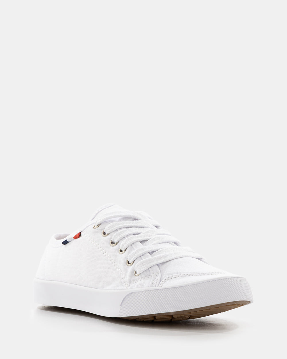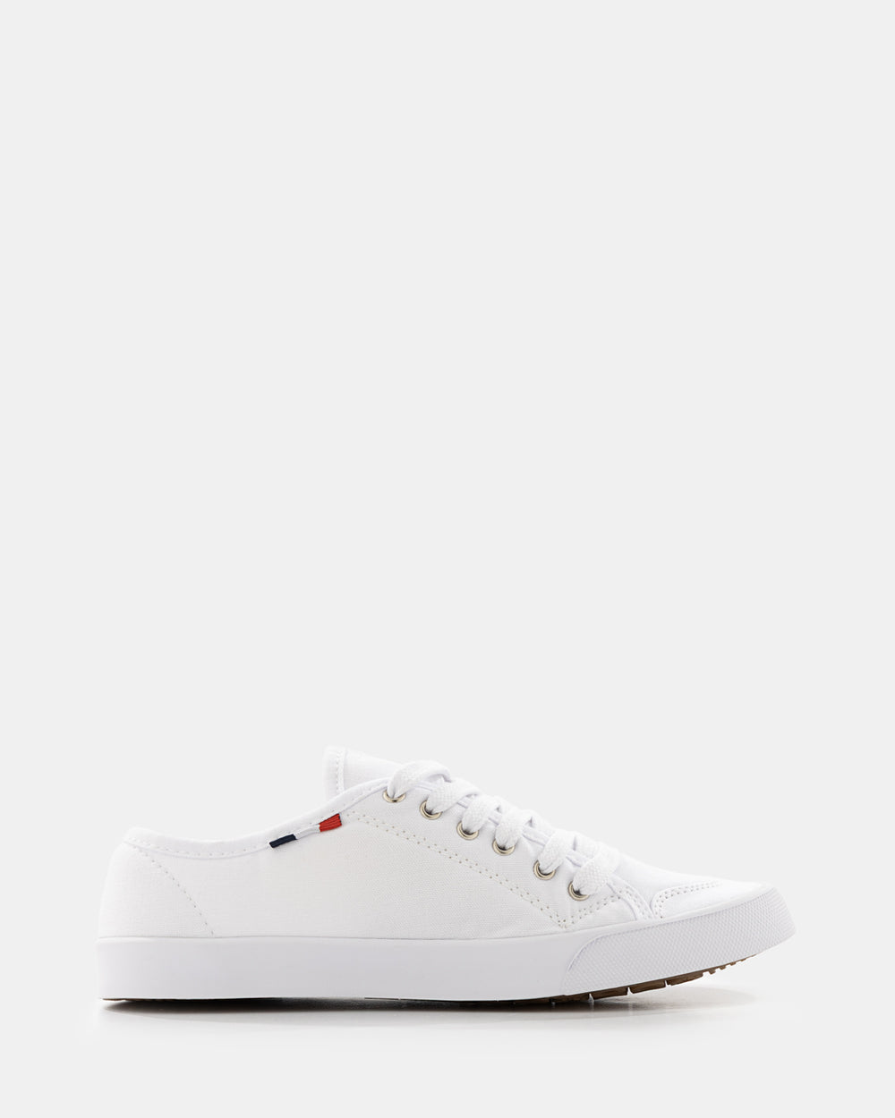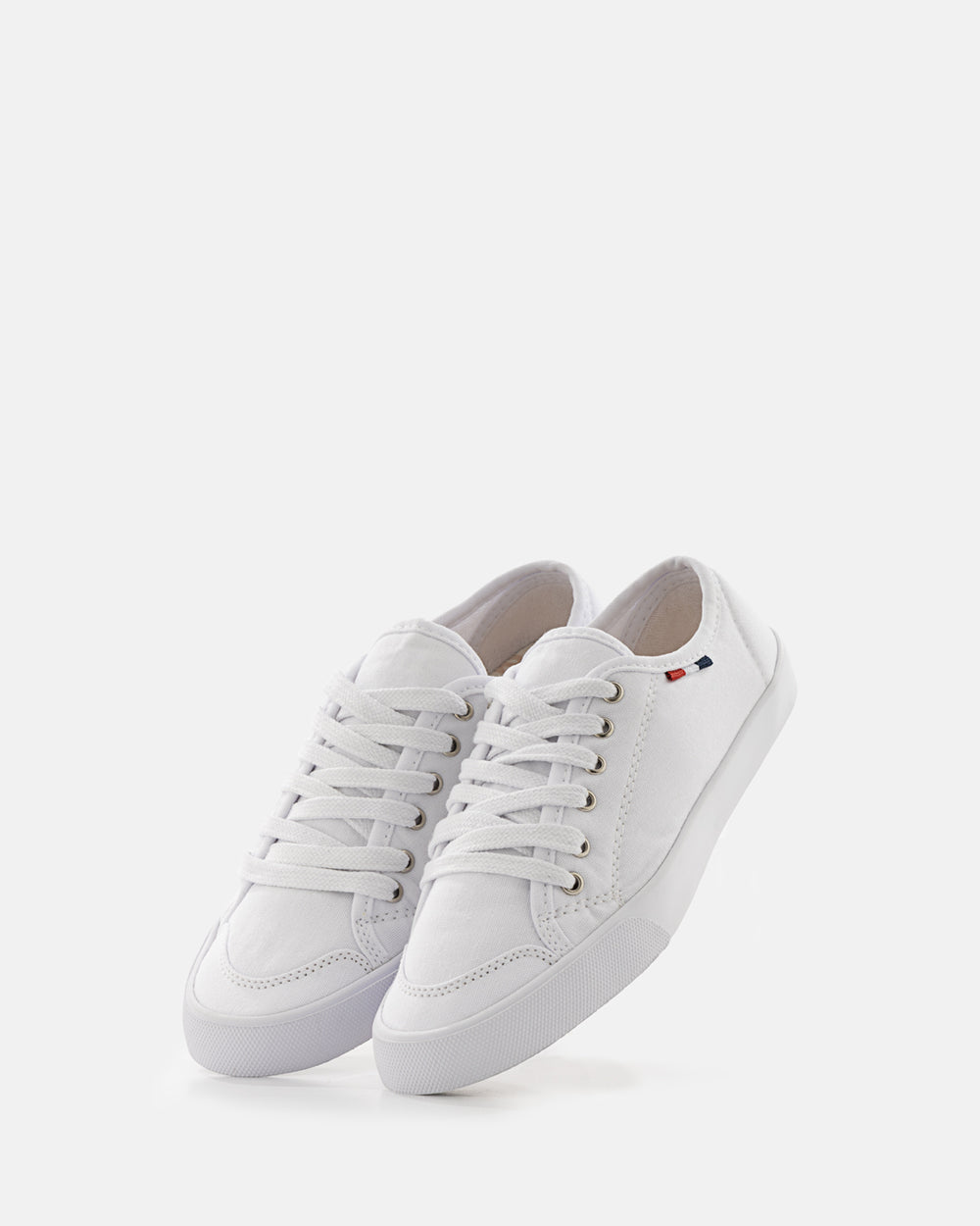 Tenis casual tipo sneaker producido en canvas de alta densidad en blanco total con aplicaciones bordadas. Manufacturado con upper de lona resistente al desgaste, revestimiento interior transpirable, plantilla extraíble con soporte de arco y base de goma inyectada antideslizante en blanco. Incluye cordones redondos en blanco. Estilo clásico de inspiración vintage con silueta esbelta y construcción ligera.
