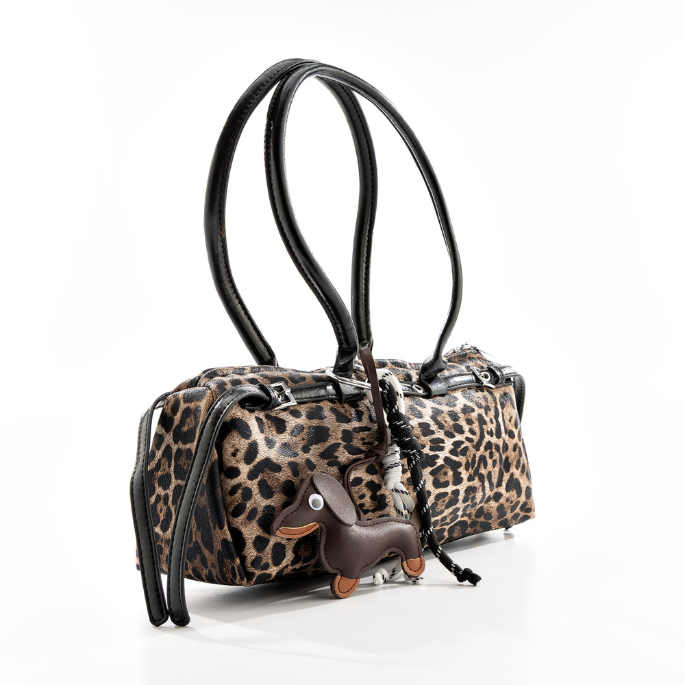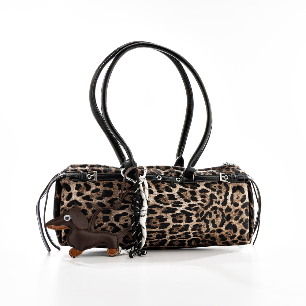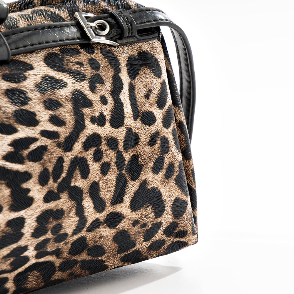 Bolsa bucket de terciopelo con estampado leopardo y charm exclusivo. Añade un toque salvaje y juguetón a tu look con esta encantadora bolsa bucket en terciopelo estampado leopardo. Terciopelo suave con estampado leopardo en tonos grises y marrones, diseño bucket con cierre de cordón ajustable, asas dobles en cuero sintético negro, charm decorativo de perrito en cuero con detalles bordados.