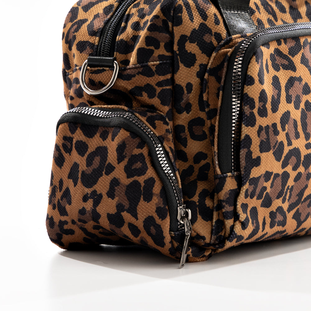 Bolsa de viaje multifuncional con estampado leopardo. Viaja con estilo y actitud con esta versátil bolsa de viaje en animal print. Material textil resistente y ligero, asas superiores ajustables con hebillas metálicas y correa de hombro desmontable y ajustable.