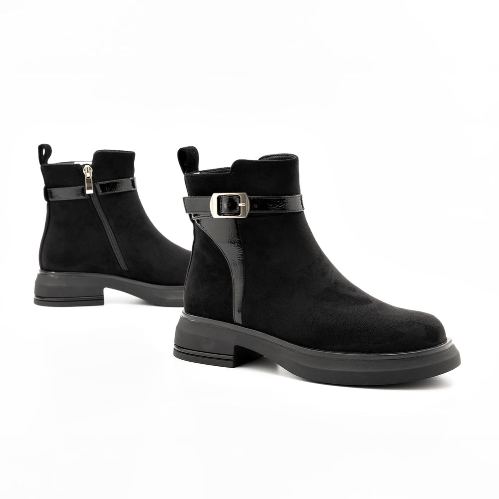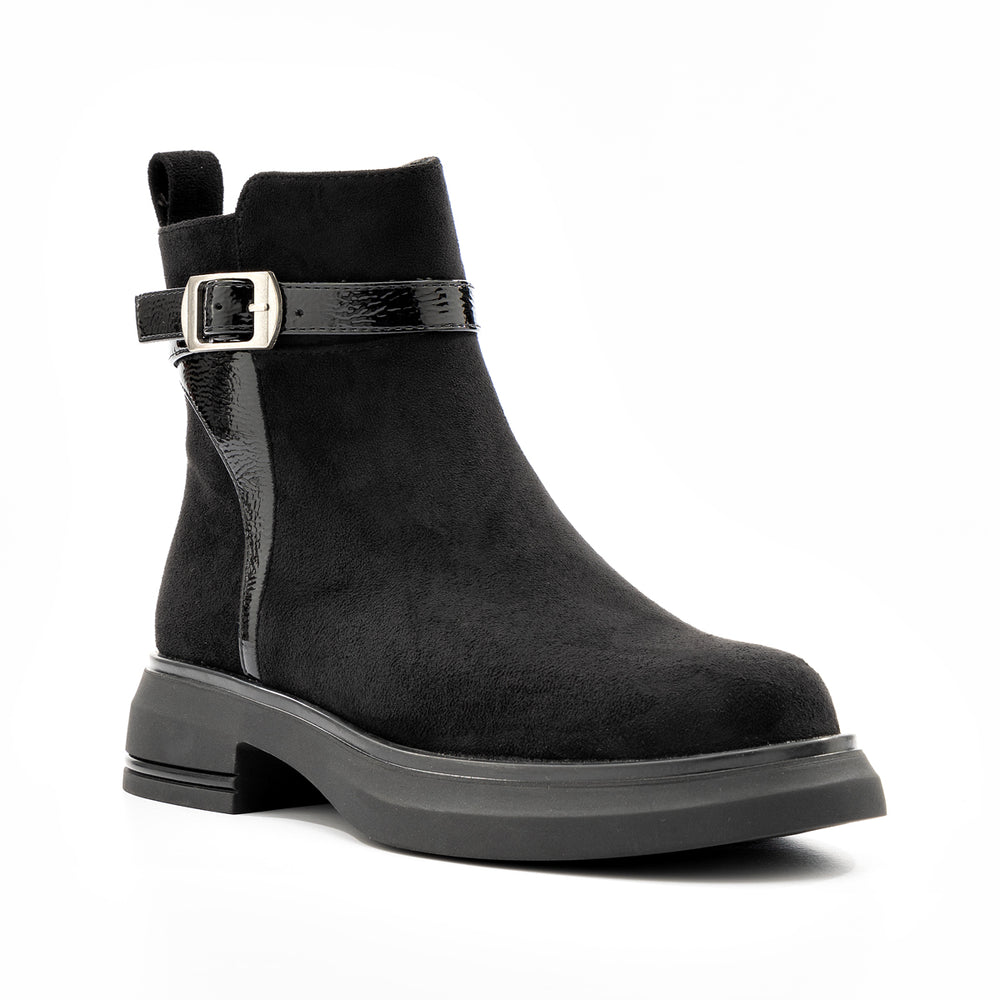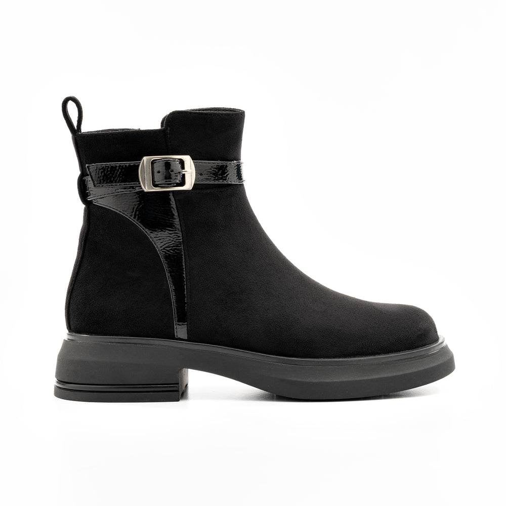 Botin de moda para mujer, elegante en gamuza con detalles en charol, hebilla plateada y cierre lateral....