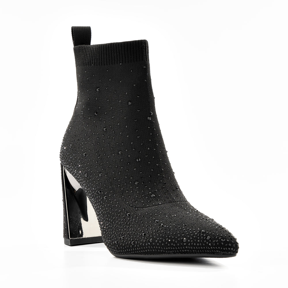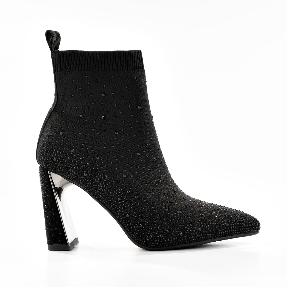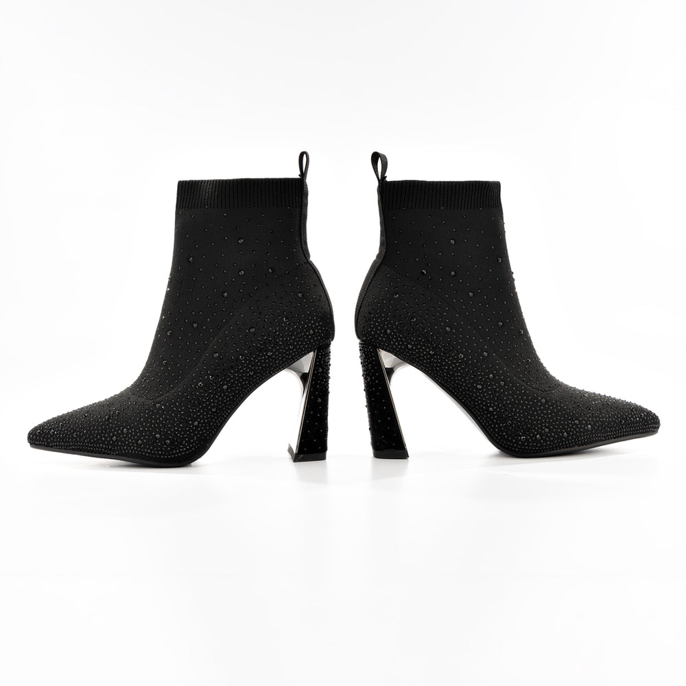 Botines de moda para mujer, estilo media en color negro confeccionado en material elástico tipo tejido que se ajusta perfectamente al tobillo para máxima comodidad. Destaca por su elegante decoración de cristales y brillos distribuidos por toda la superficie que crean un efecto glamuroso y sofisticado, perfecto para ocasiones especiales.