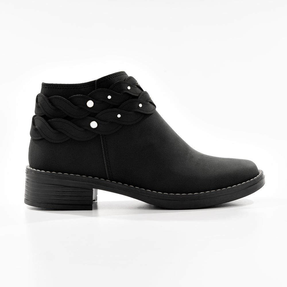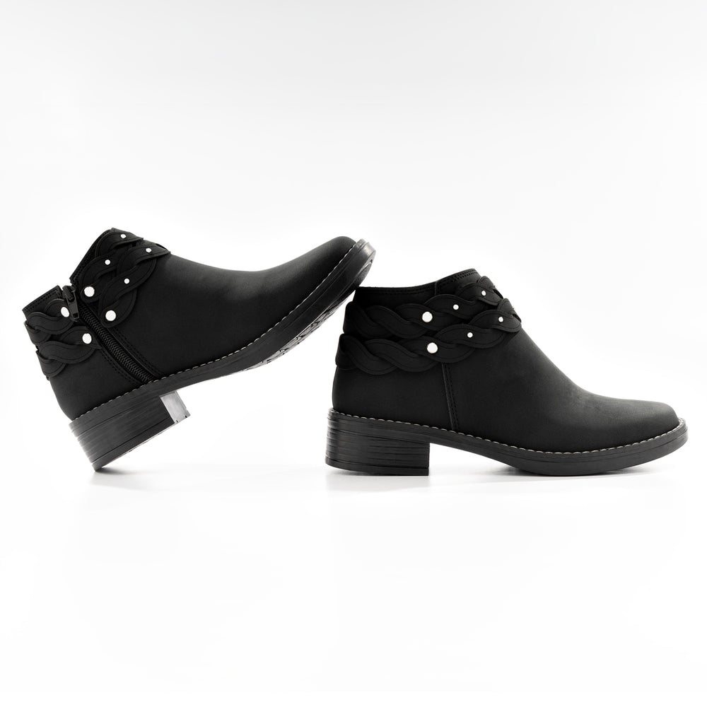 Botines de moda para mujer, material sintético de alta calidad tipo cuero, diseño con detalles trenzados decorativos en la parte superior con tachuelas metálicas, cierre lateral con cremallera, plantilla acolchada, tacón bajo tipo bloque, suela de goma antideslizante. Estilo casual elegante perfecto para uso diario, cómodos para caminar todo el día, detalles artesanales que aportan personalidad.