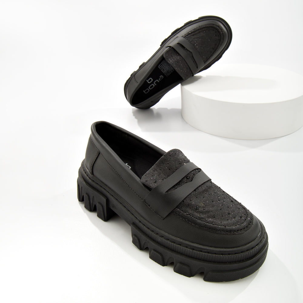 Mocasines de moda para mujer, en color negros de suela gruesa tipo track. Perfectos para quienes buscan comodidad sin sacrificar el estilo, cuenta con una silueta clásica de mocasín con detalles perforados y acabado mate.