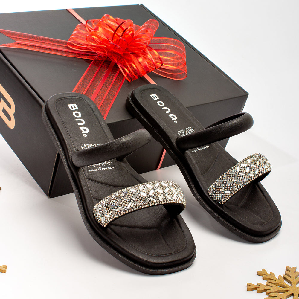 Sandalias de moda para mujer, combinan la sofisticación del negro con el glamour de una banda completamente decorada con pedrería brillante. Su diseño de doble banda ofrece un ajuste cómodo mientras que los cristales aportan un toque de lujo perfecto para ocasiones especiales.
