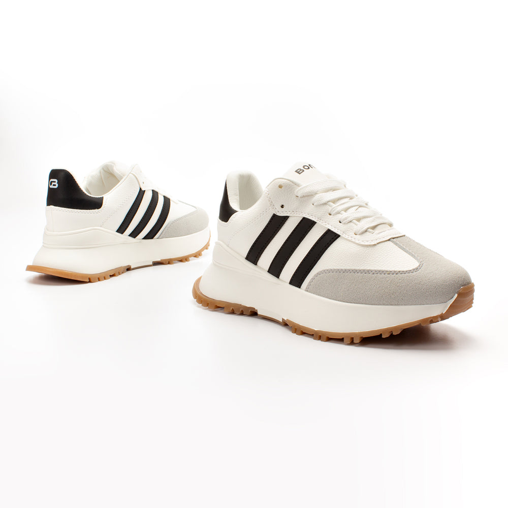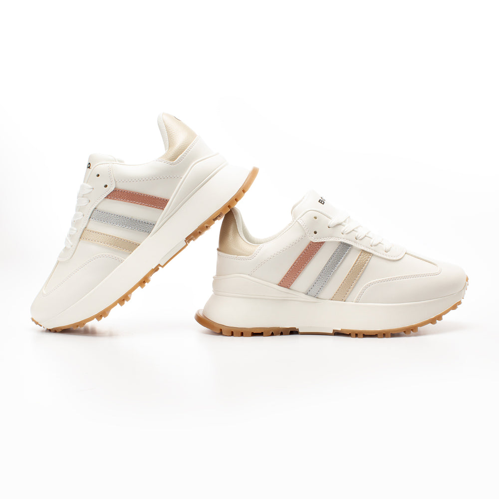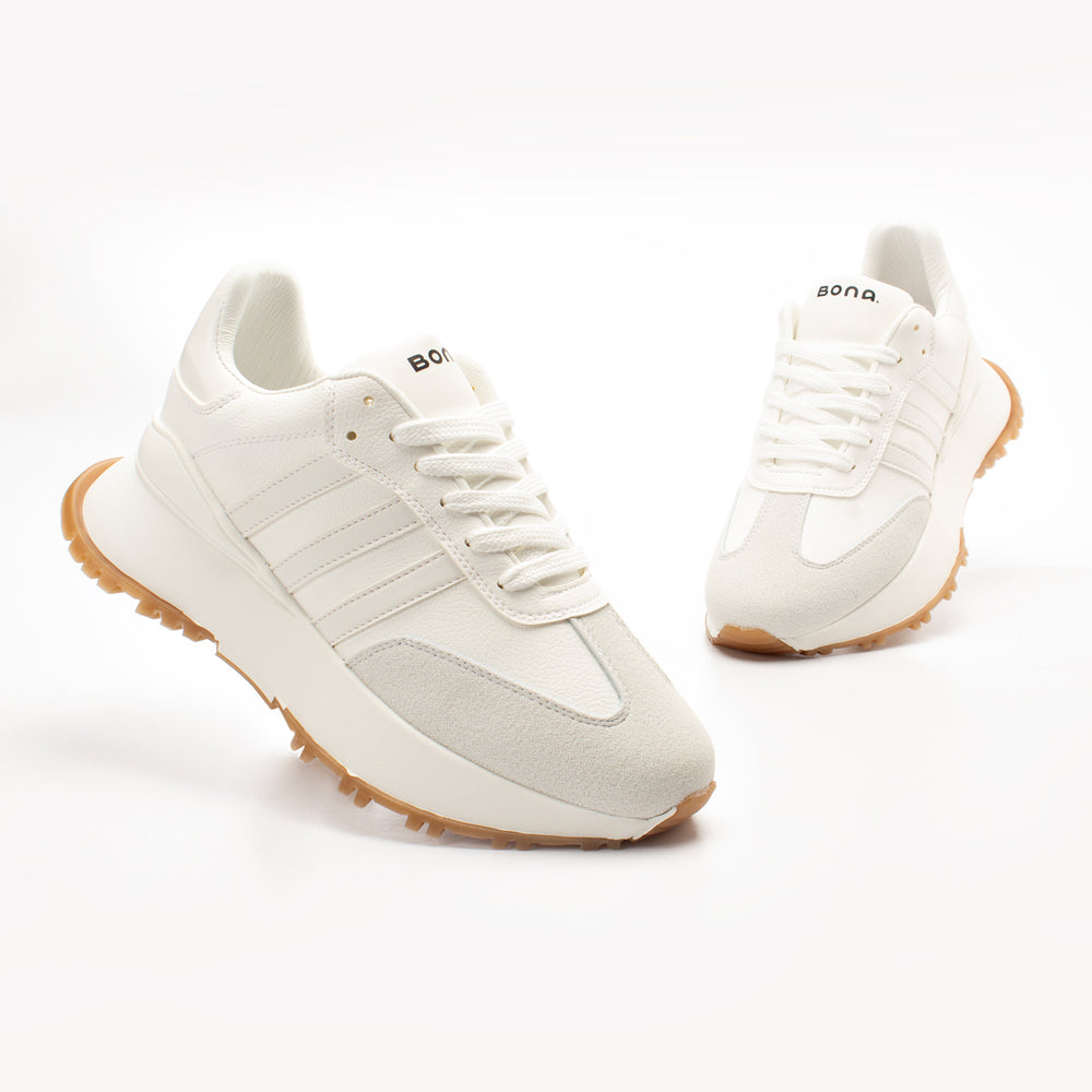 Tenis de moda para mujer, silueta clásica deportiva en blanco inmaculado con detalles sutiles, suela en tono caramelo que aporta calidez y contraste elegante, plantilla acolchada y construcción ligera para uso diario, materiales de calidad con costuras reforzadas y cordones resistentes.