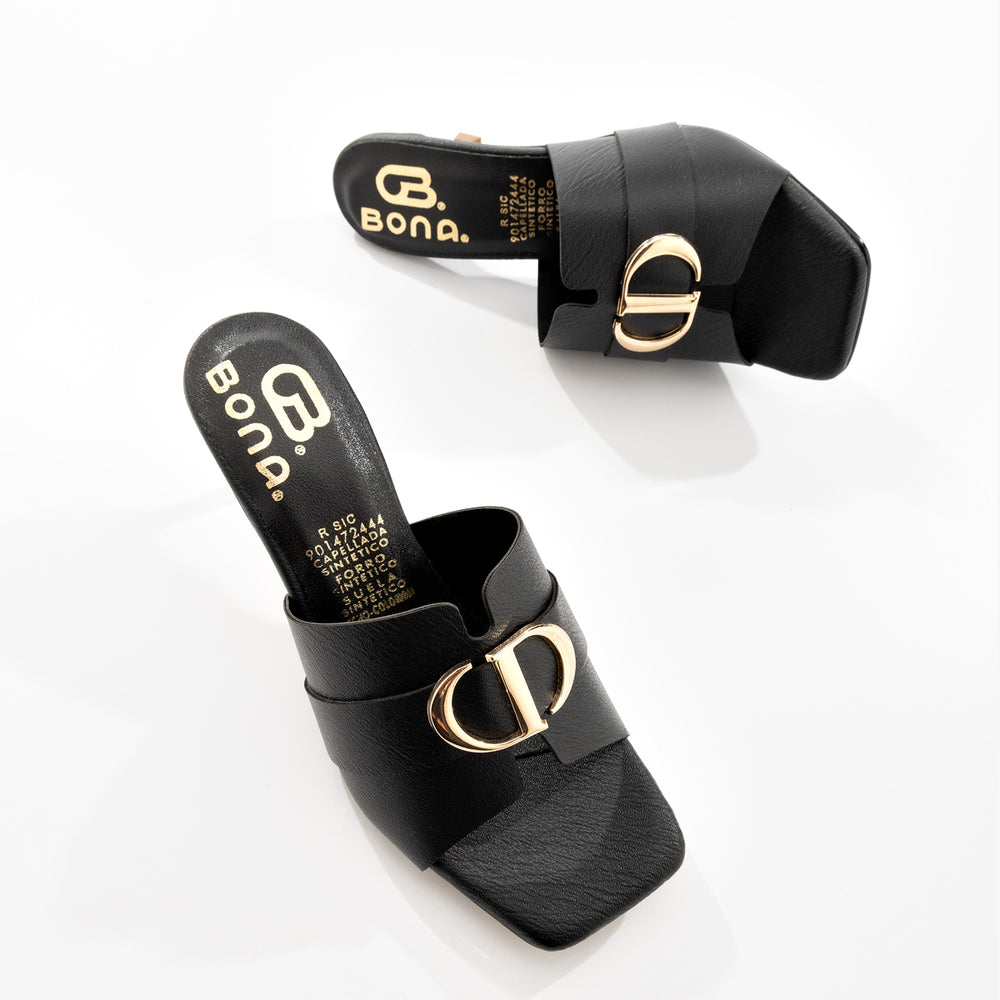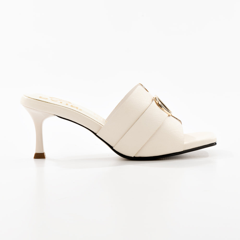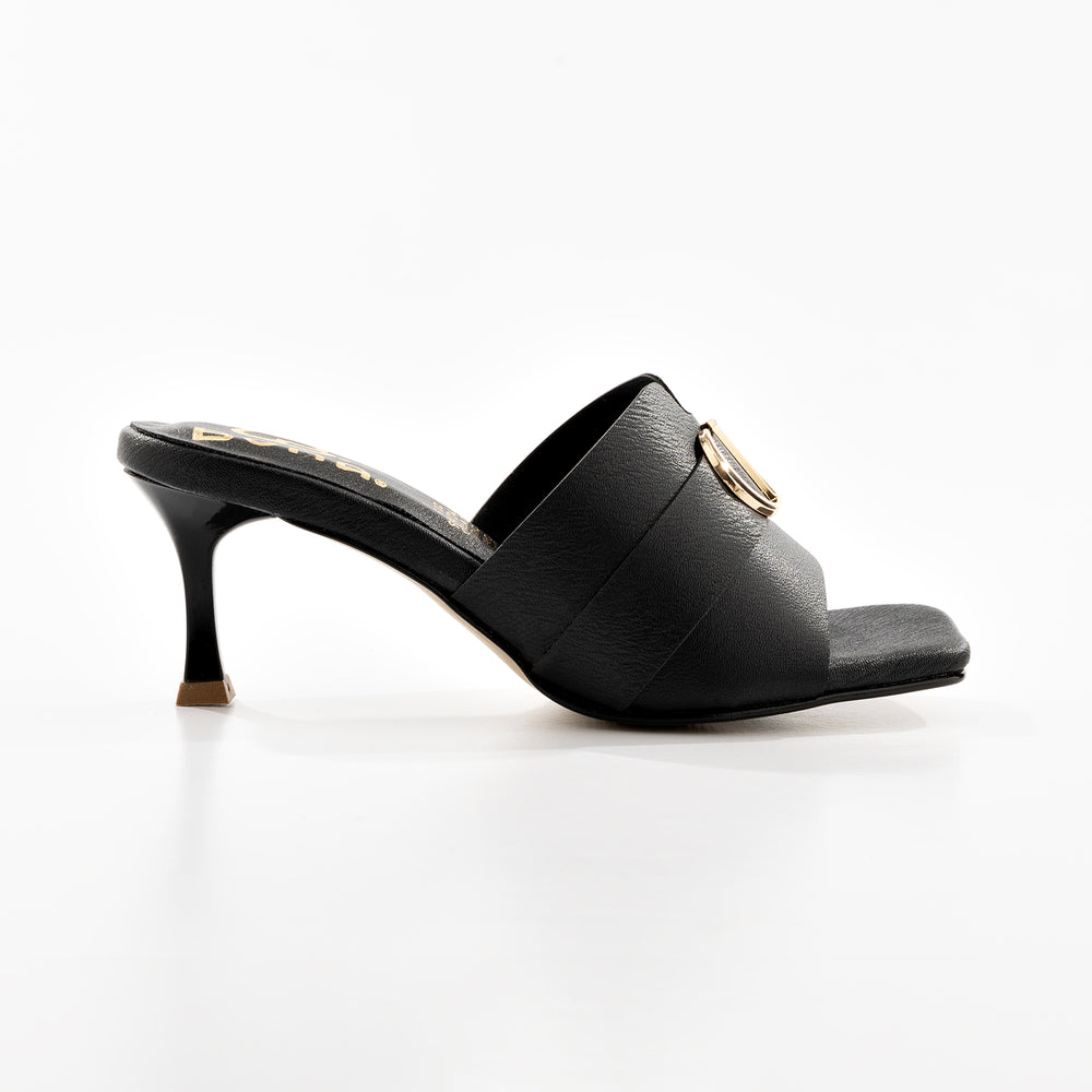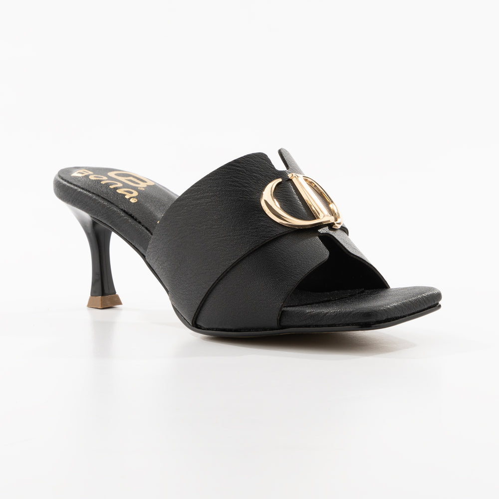 Tacones de moda para mujer, cuero sintético de alta calidad con argolla metálica dorada como detalle central. Tacón tipo kitten heel y suela de goma antideslizante. Diseño sofisticado con doble banda cruzada, tacón medio ideal para uso prolongado, plantilla suave y acolchada. Ideales para eventos especiales o looks casuales elegantes.