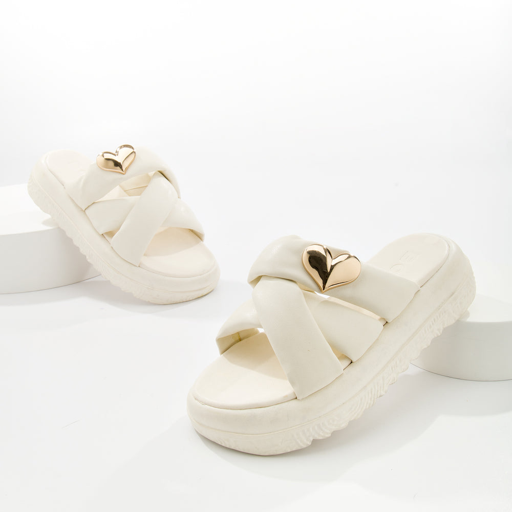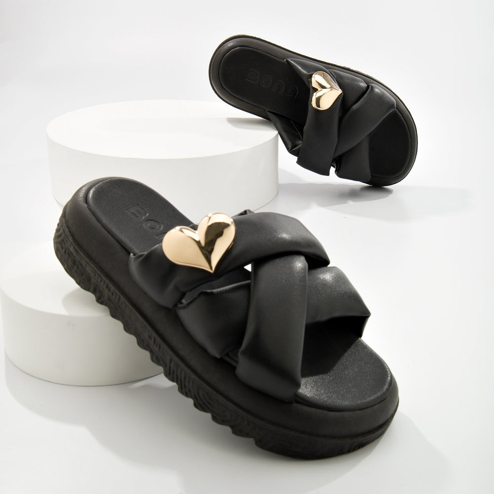Sandalias de moda para mujer, combinan la comodidad del estilo slide con un toque femenino y elegante. El moño decorativo con detalle dorado añade un toque de sofisticación, mientras que la plataforma aporta altura y estilo contemporáneo.