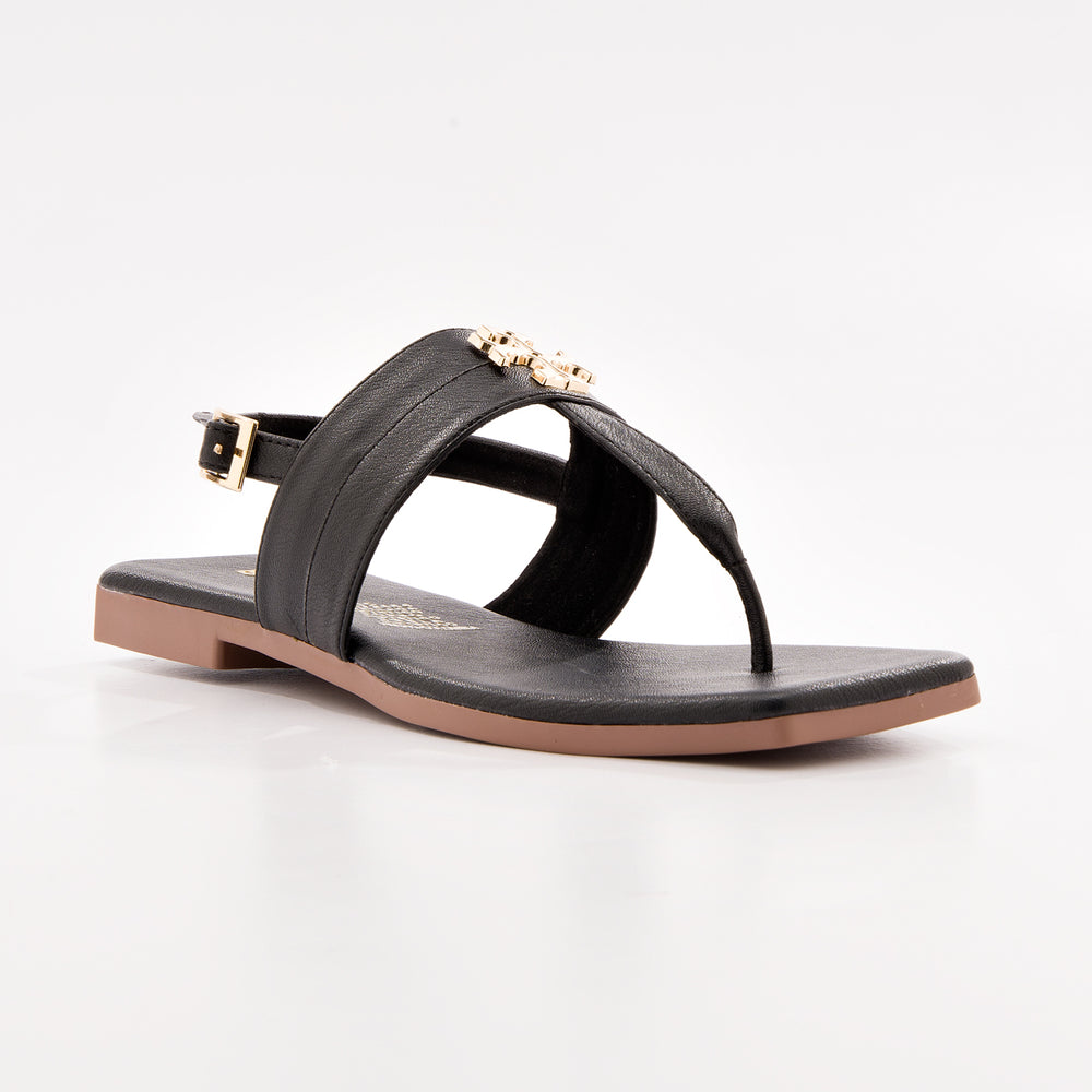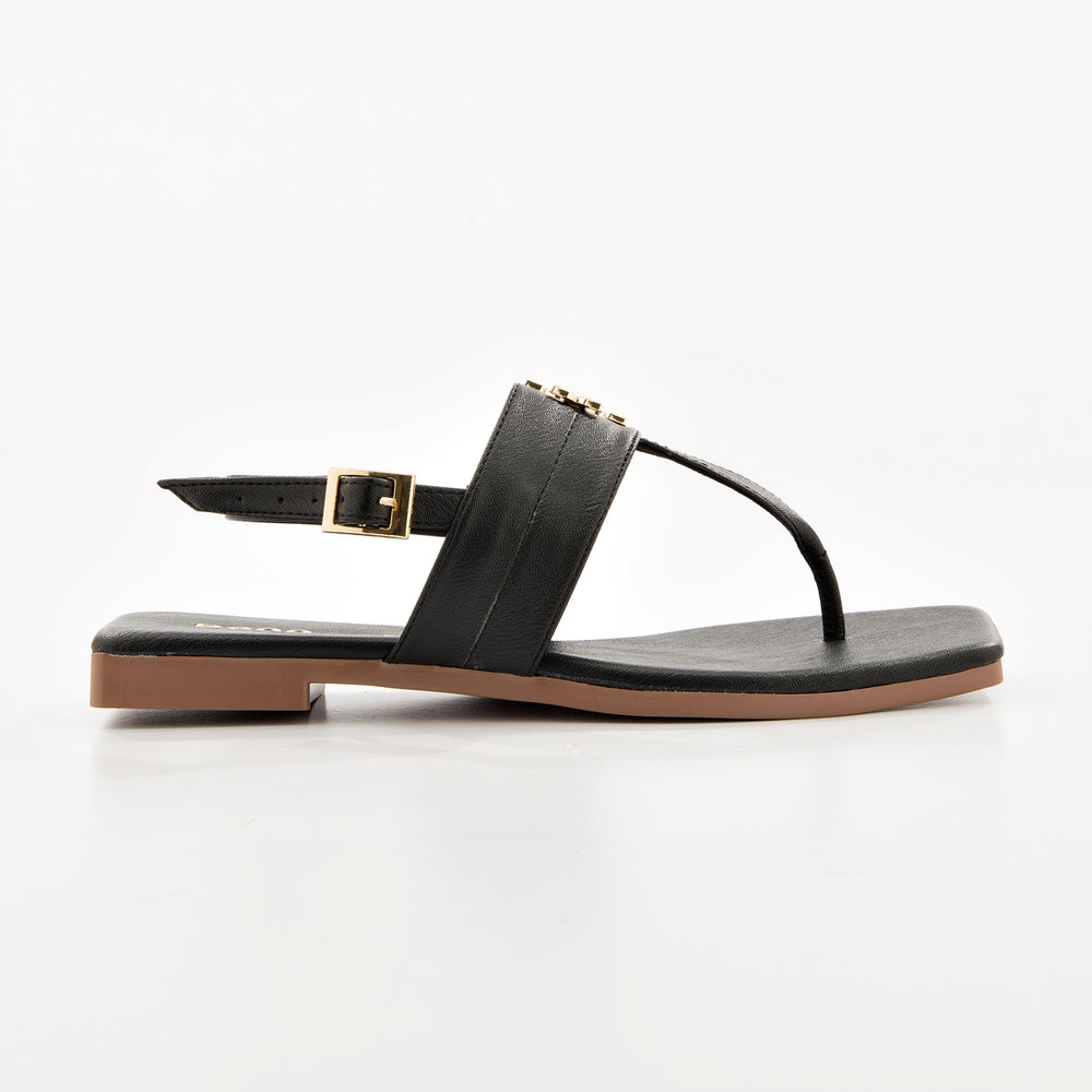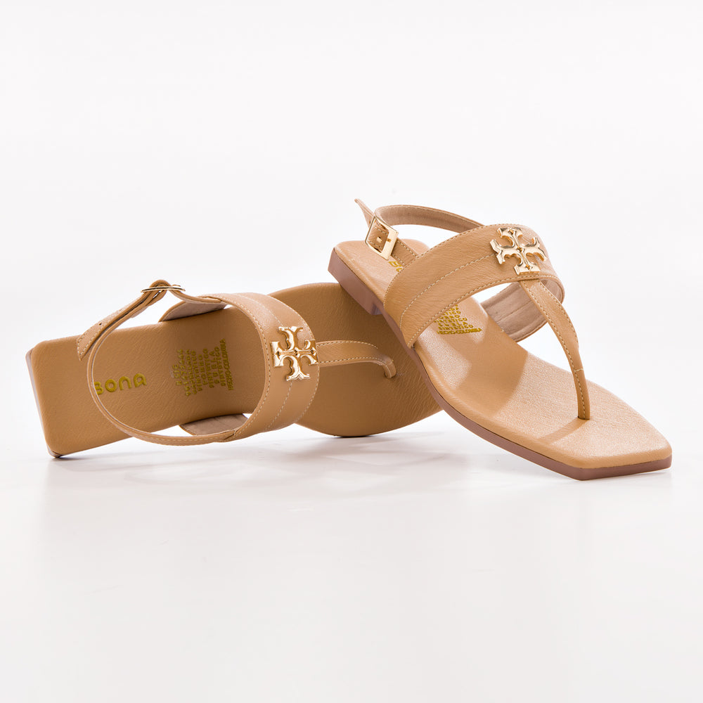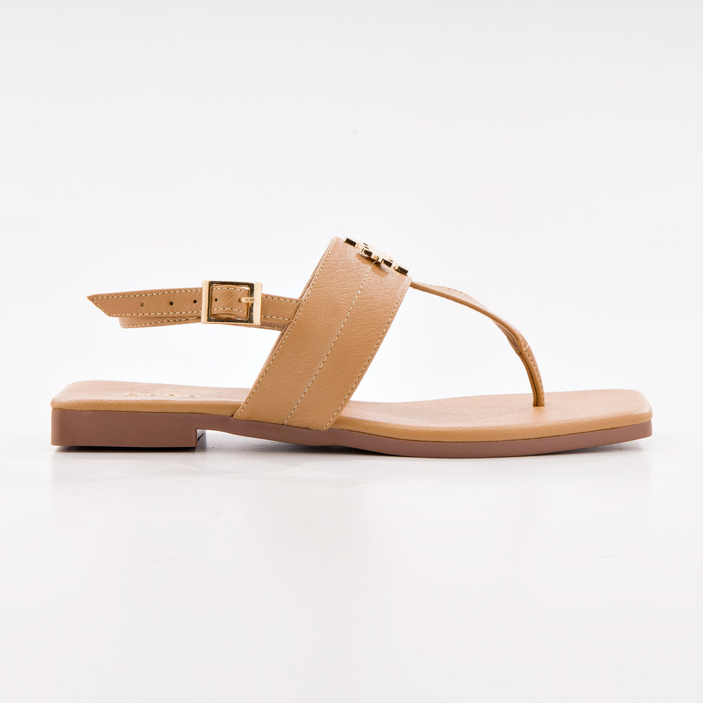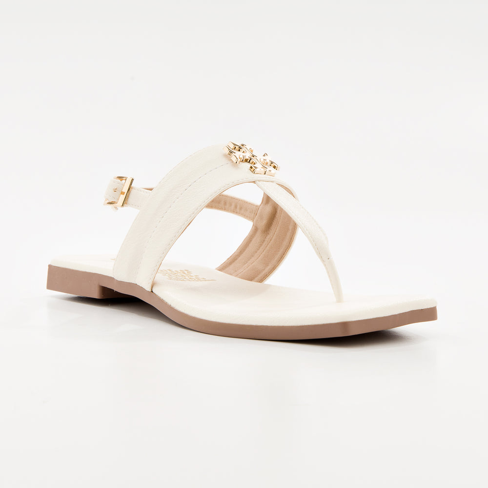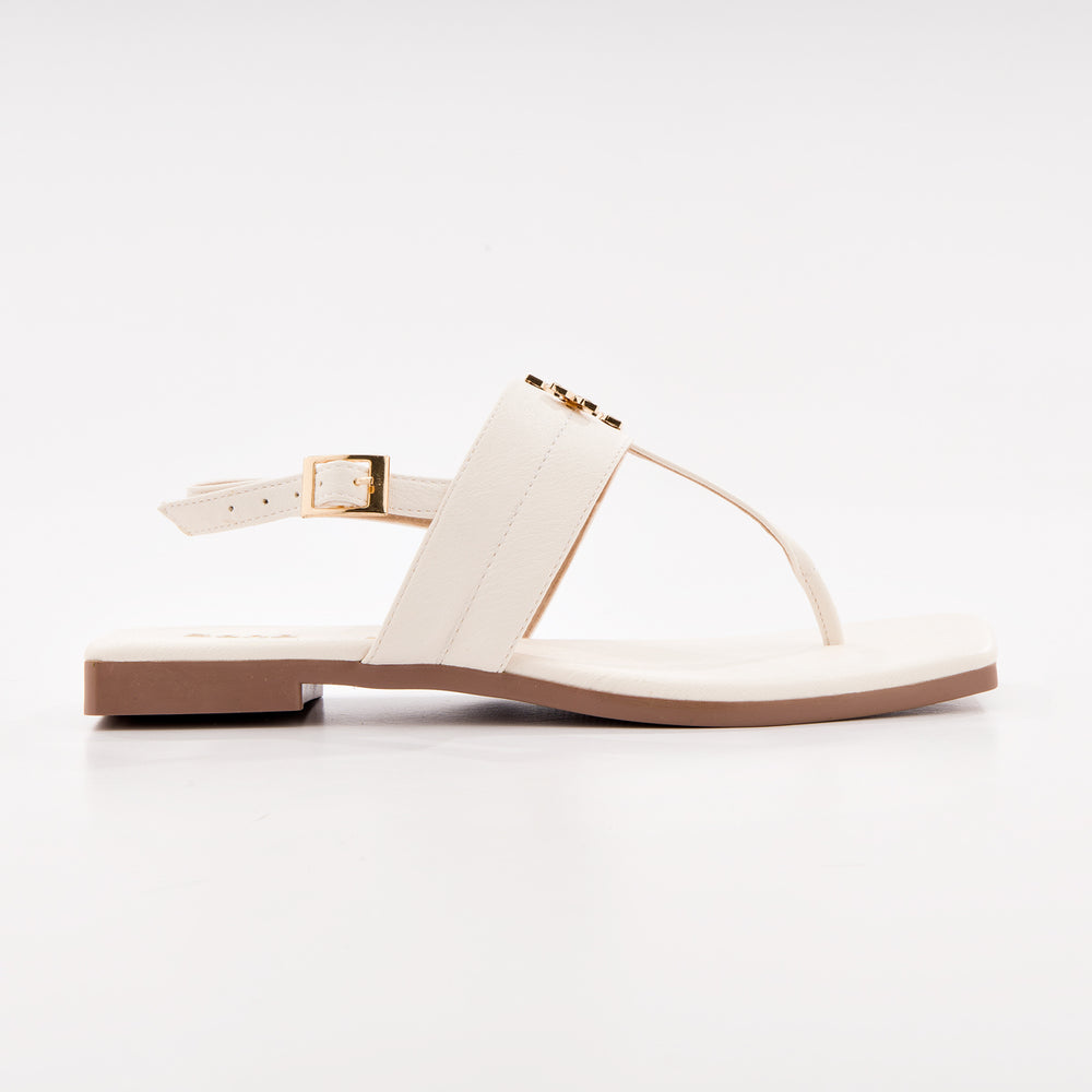 Sandalia plana de moda para mujer,diseño minimalista ofrece frescura y elegancia para los días más cálidos. Su estructura tipo T-strap combina tiras blancas texturizadas con sutiles detalles dorados, incluyendo hebillas metálicas decorativas que realzan su estilo femenino y delicado.