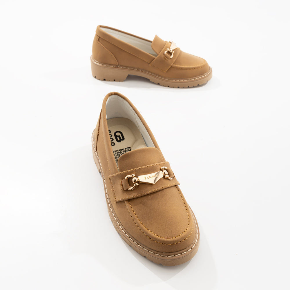 Mocasines de moda para mujer, con elegante detalle de cadena dorada que aporta un toque sofisticado. En material sintético de alta calidad con acabado mate y costuras decorativas en contraste que resaltan el diseño. La cadena metálica dorada en el empeine añade un elemento distintivo y moderno. Cuentan con suela tipo track dentada de aproximadamente 3 cm que proporciona comodidad y tracción, perfecta para uso diario. Su plantilla acolchada garantiza confort durante largas jornadas.