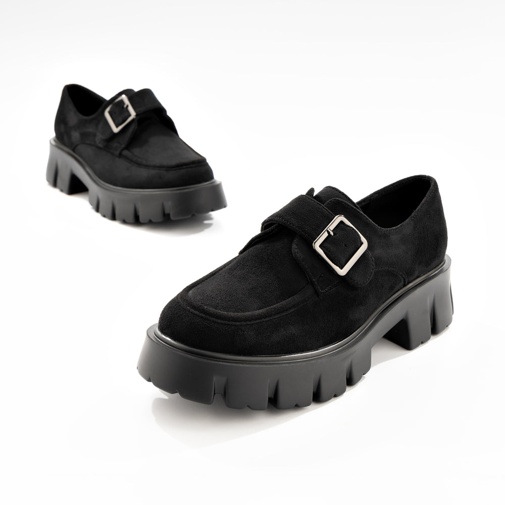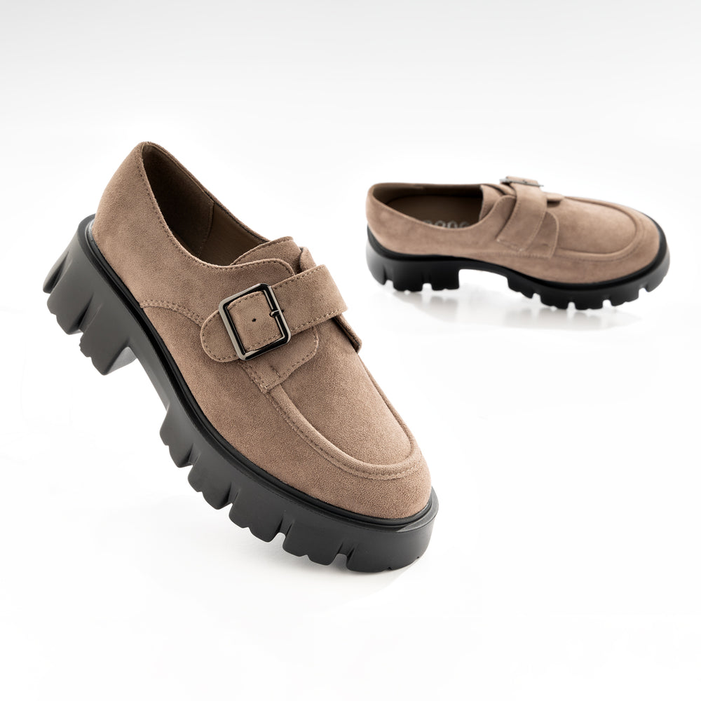 Mocasín de moda para mujer, tipo monk strap con hebilla metálica y plataforma chunky, perfecto para un look urbano moderno con toque sofisticado. Diseño versátil que combina elegancia y comodidad. Material tipo gamuza o ante sintético con hebilla metálica plateada ajustable en el empeine.