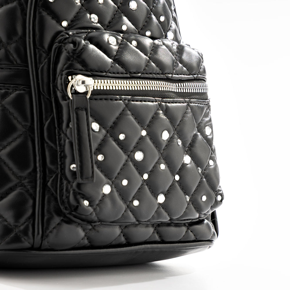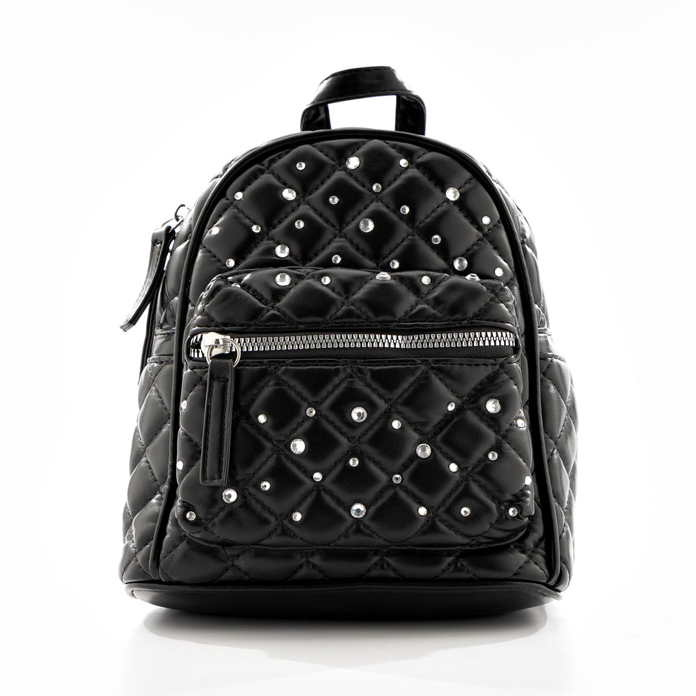 Mochila acolchada tipo quilted con tachuelas plateadas y diseño rock-chic. Fusiona elegancia y actitud con esta impresionante mochila en cuero sintético negro con acolchado tipo quilted. Las tachuelas plateadas distribuidas estratégicamente sobre el patrón romboidal crean un efecto visual sofisticado con un toque rebelde, perfecta para la mujer que busca un accesorio statement con personalidad única.