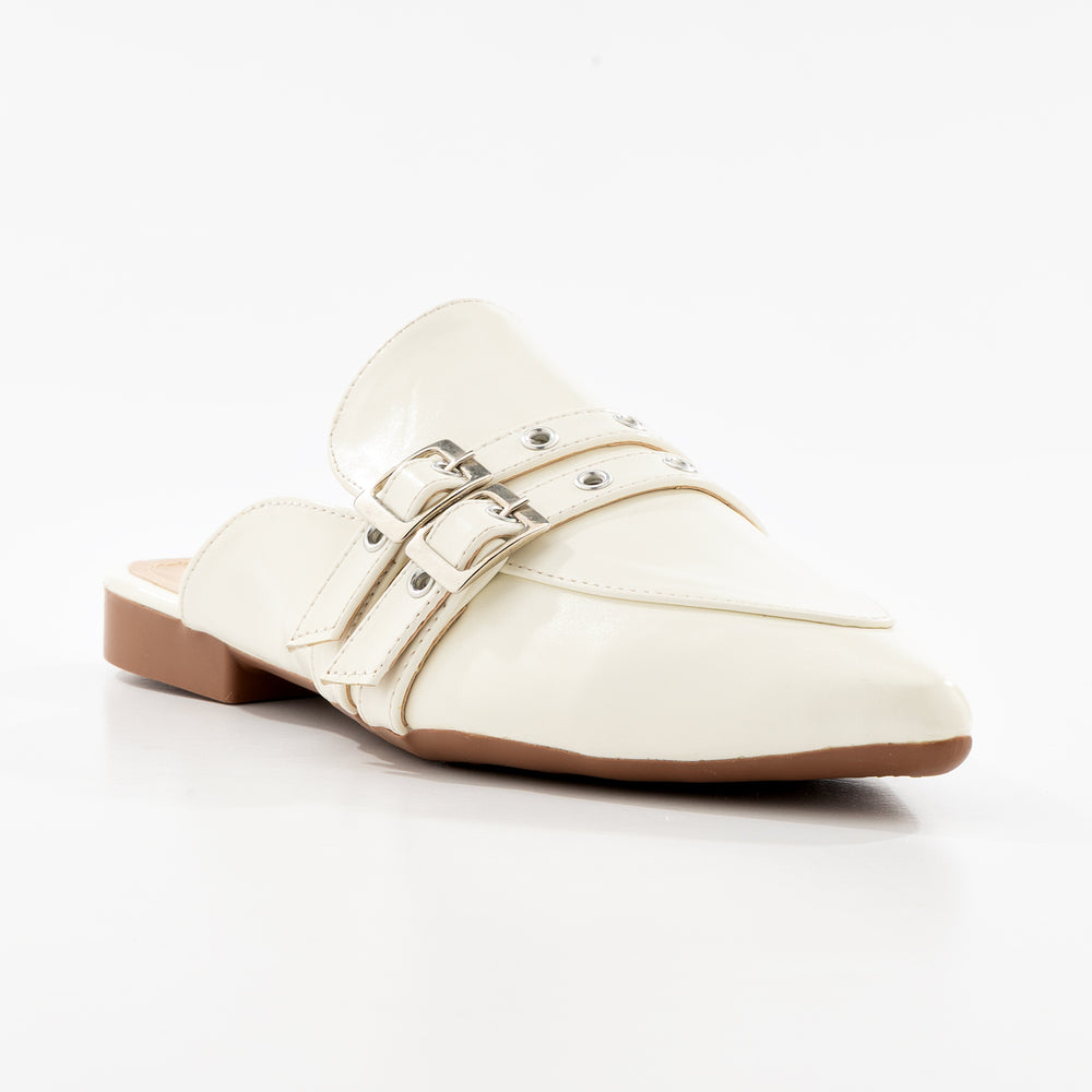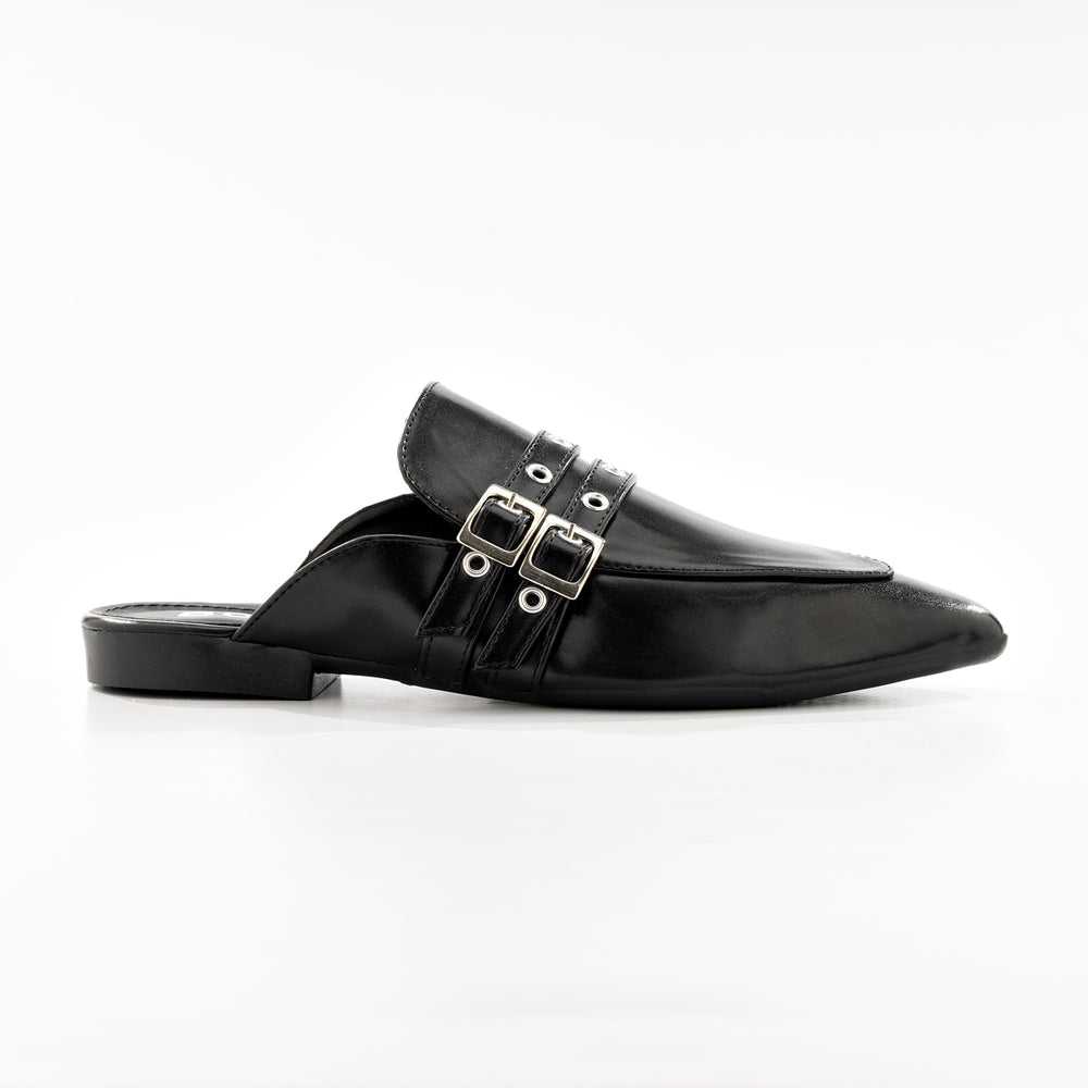 Descubre la sofisticación minimalista con estas elegantes mules en cuero sintético. Su diseño clásico con doble hebilla plateada y tacón bajo las convierte en el calzado perfecto para la mujer que busca comodidad sin sacrificar estilo, ideal para llevar desde la oficina hasta tus planes casuales.