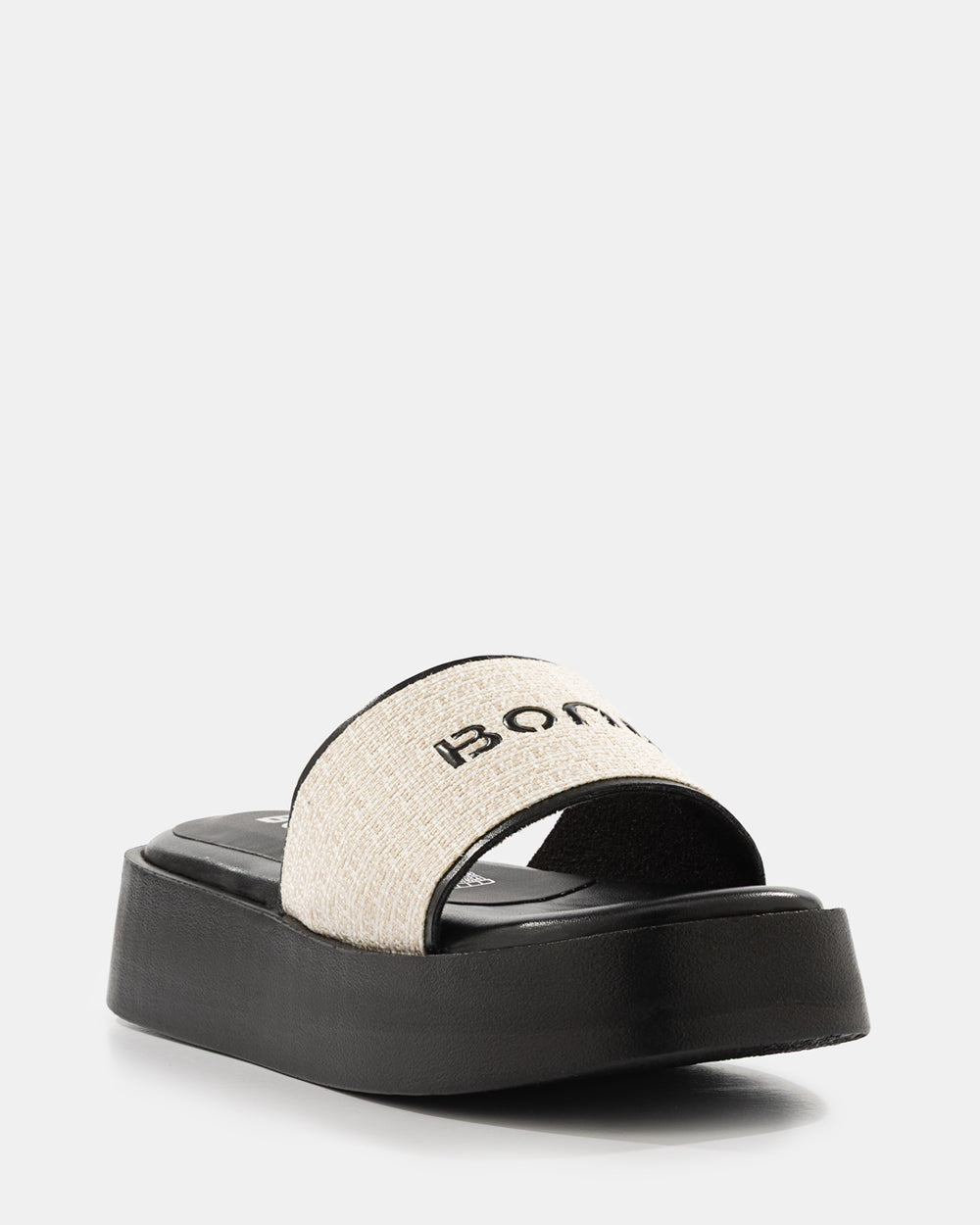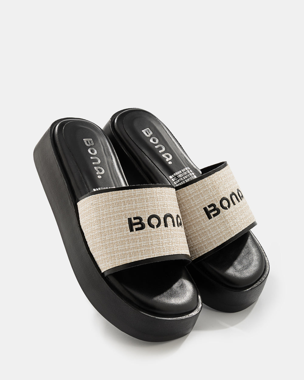 Sandalia femenina de plataforma alta con tira frontal ancha en lino natural con logo Bona estampado en grande como elemento central del diseño. Base y plataforma en material sintético con acabado liso y plantilla acolchada con logo de marca. Plataforma gruesa que aporta altura y presencia con comodidad. Diseño minimalista y de alto impacto, perfecto para looks casuales y de temporada con sello de marca.