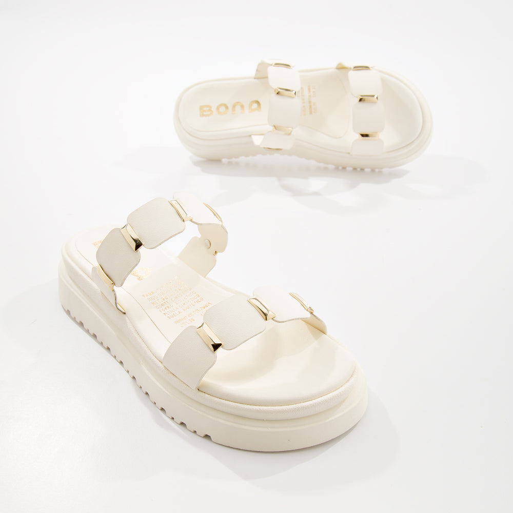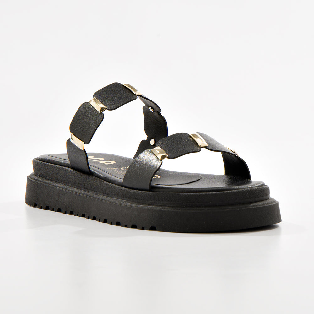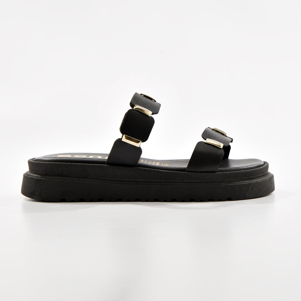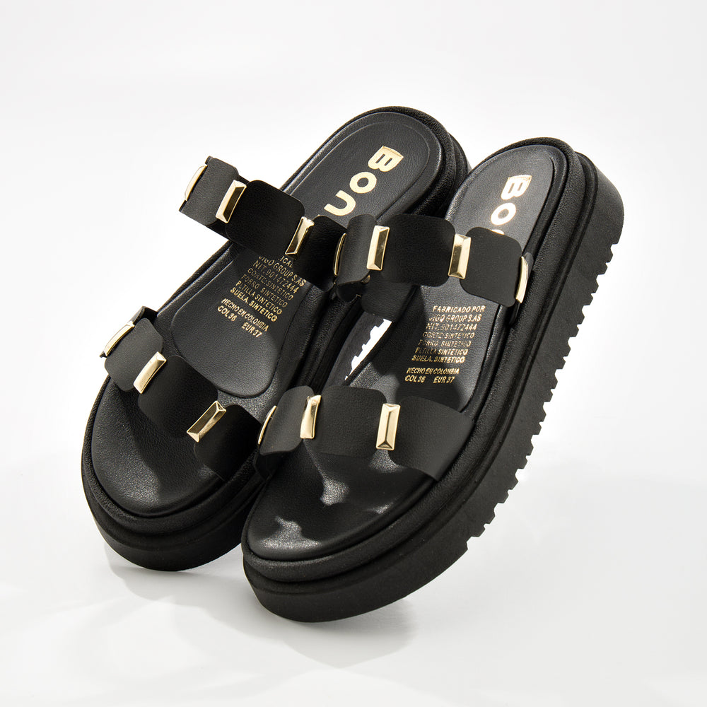 Plataforma de moda para mujer, con detalles de hebillas doradas que aportan un toque sofisticado. En material sintético de alta calidad con acabado suave y brillante. Cuentan con dos correas mediante hebillas metálicas doradas para un calce perfecto y cómodo. La plataforma gruesa tipo track de aproximadamente 5-6 cm proporciona altura sin sacrificar estabilidad, mientras que la suela dentada antideslizante garantiza seguridad.