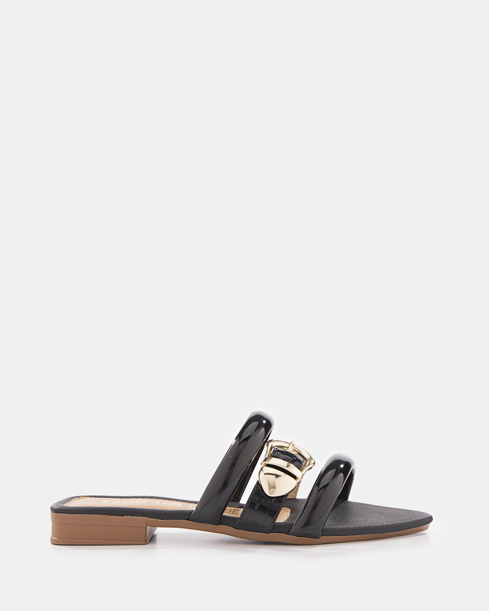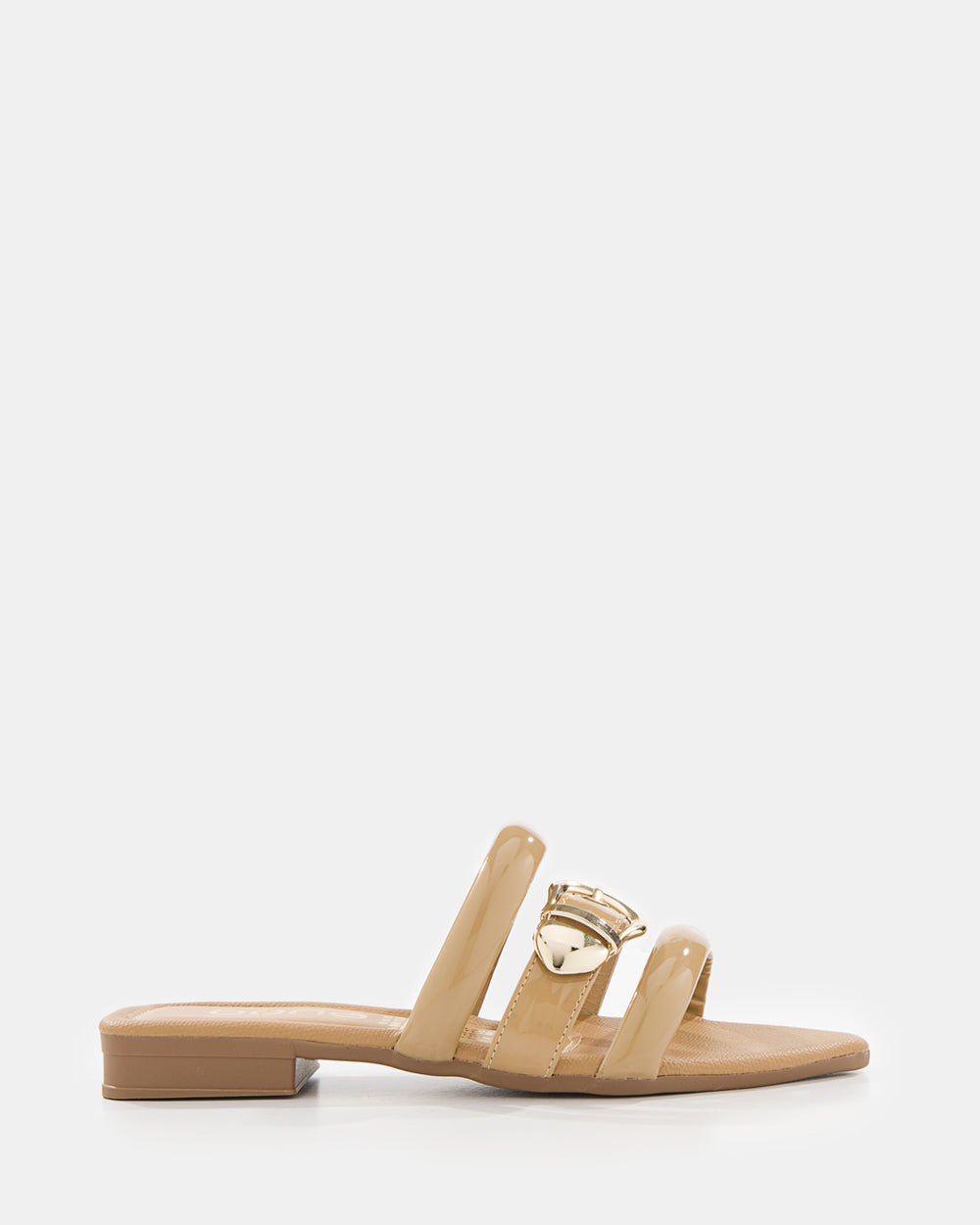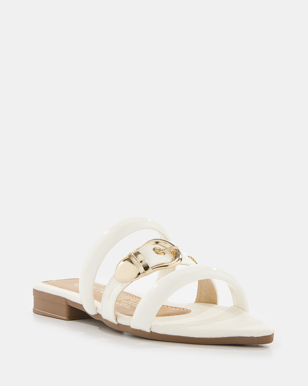 Sandalia de punta redenda con banda frontal delgada y detalle metálico dorado al centro. Suela plana . Diseño minimalista que equilibra comodidad y elegancia para el uso diario.