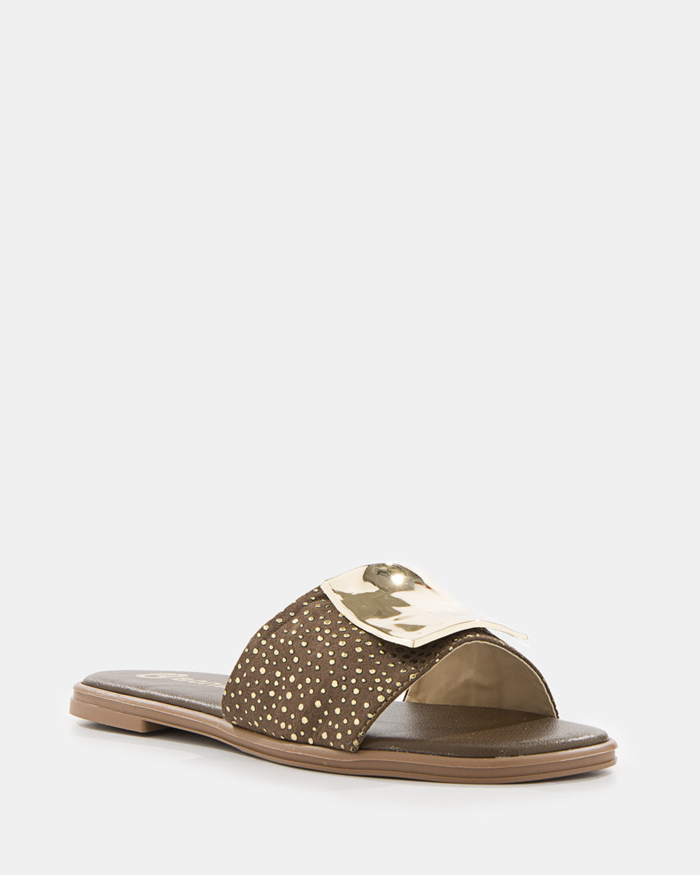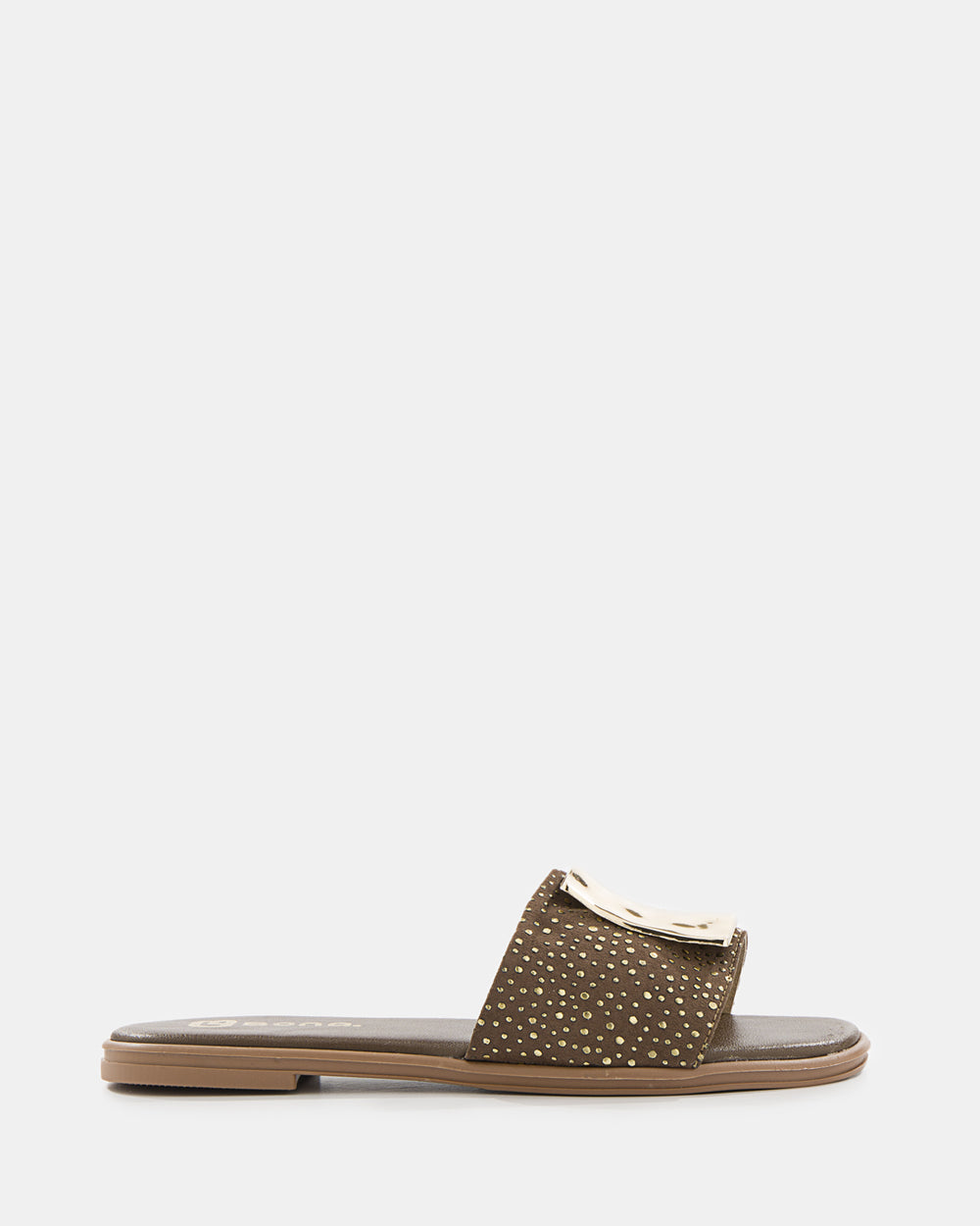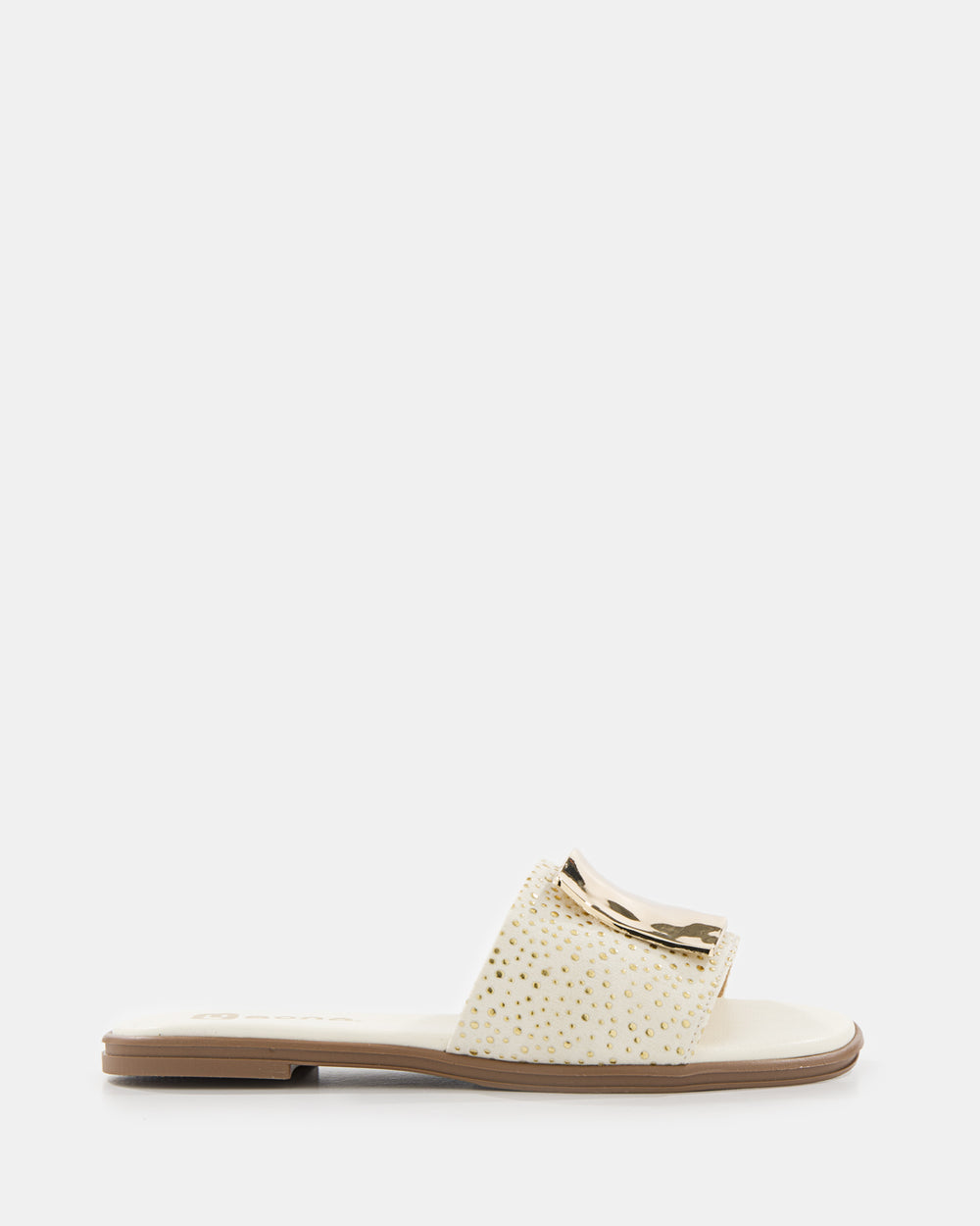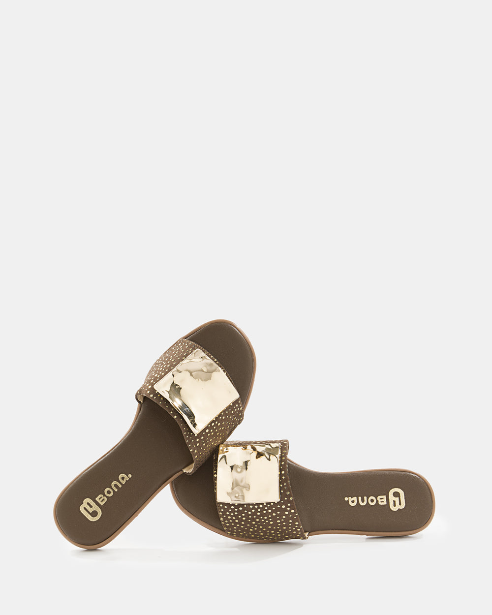 Sandalia plana de diseño minimalista. Presenta una silueta de punta redonda y una banda frontal con delicado detalle de nudo, cuenta con una plantilla cómoda y suave. Su suela ligera brinda estabilidad que aporta textura y elegancia al diseño.