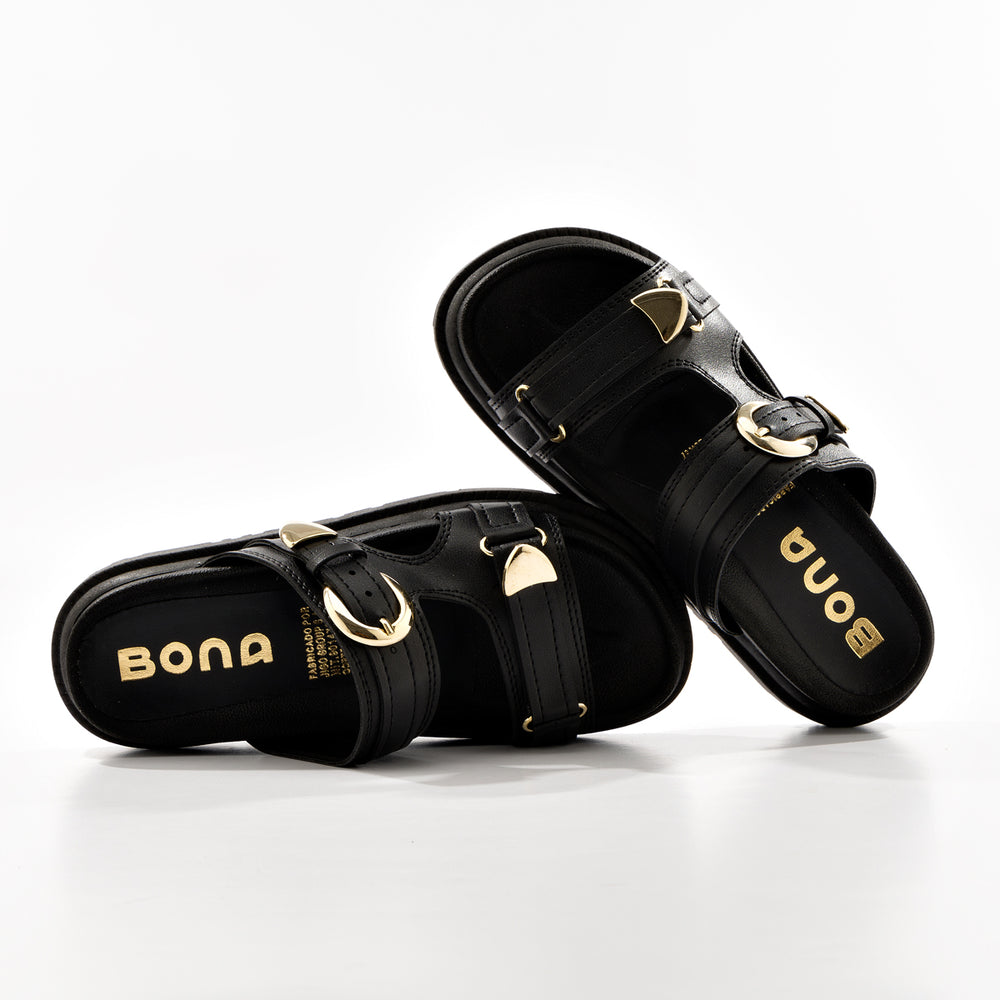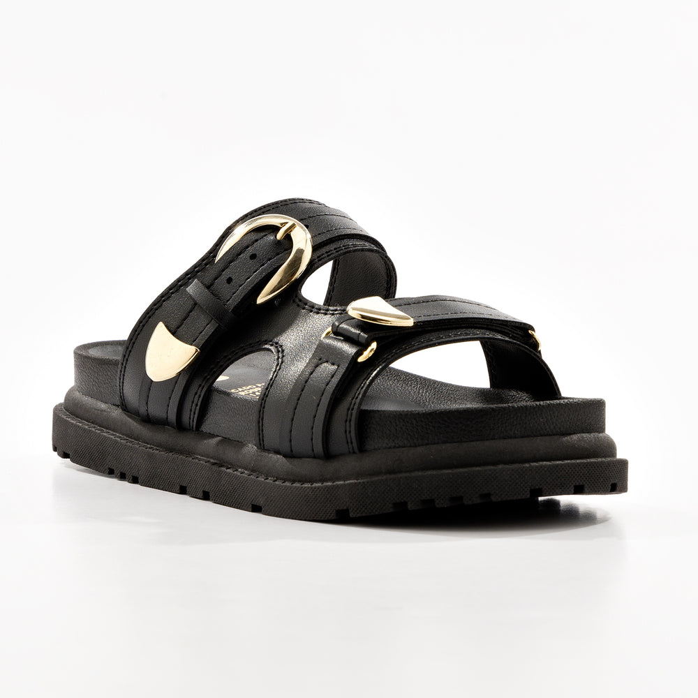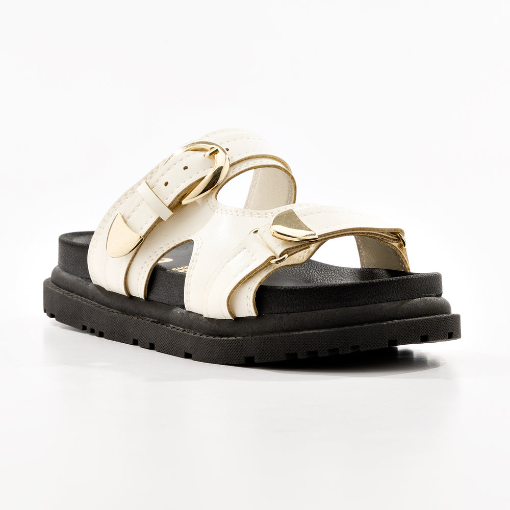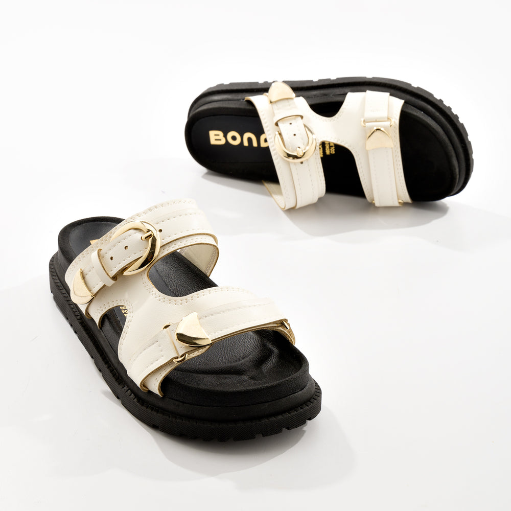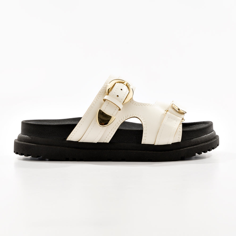 Plataforma de moda para mujer, con elegantes hebillas doradas ajustables. En material sintético de alta calidad con acabado suave. Cuentan con dos correas anchas con hebillas metálicas doradas que permiten ajuste personalizado para mayor comodidad. La plataforma gruesa tipo track de aproximadamente 5-6 cm proporciona altura y estabilidad, mientras que la suela dentada antideslizante garantiza seguridad en cada paso.