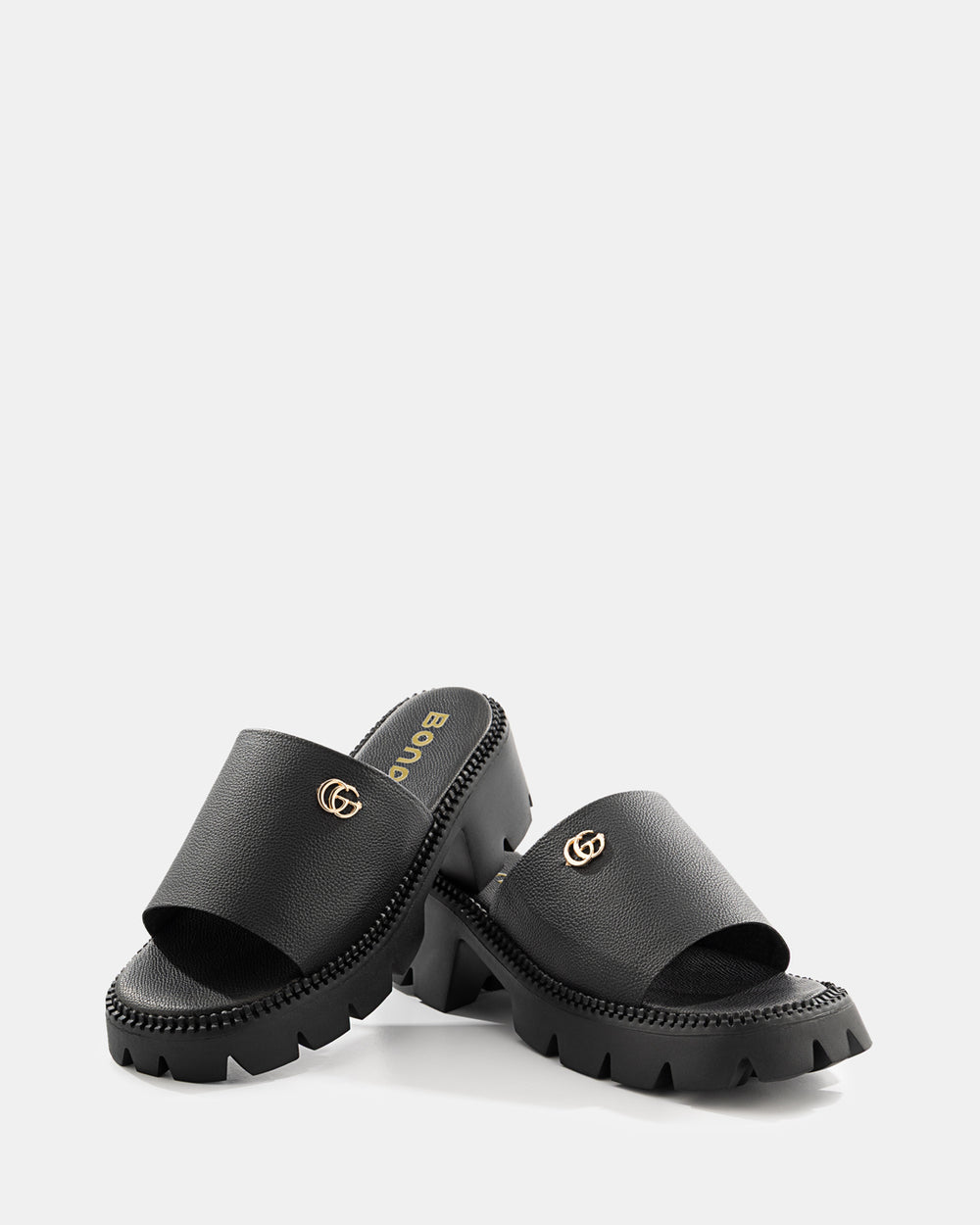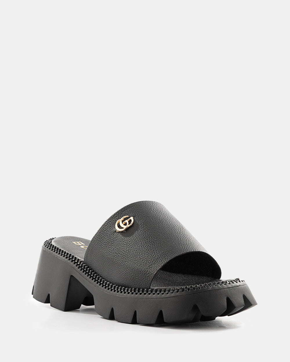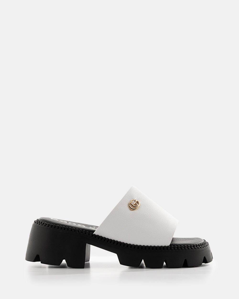 Sandalia slide de plataforma track que combina la comodidad del diseño slip-on con la actitud de una suela robusta tipo militar. La hebilla dorada distintiva y la plataforma dentada crean una pieza statement perfecta para la mujer que busca altura, estabilidad y un look urbano contemporáneo.