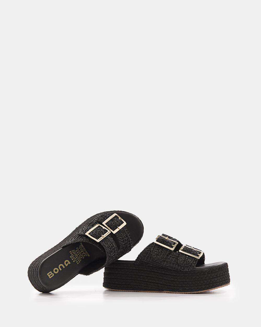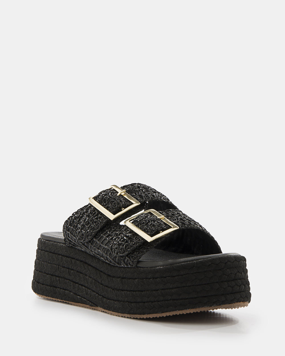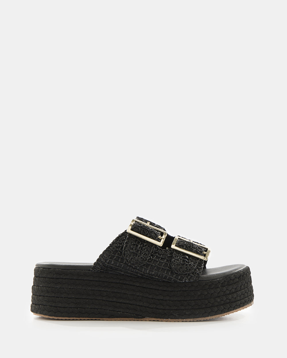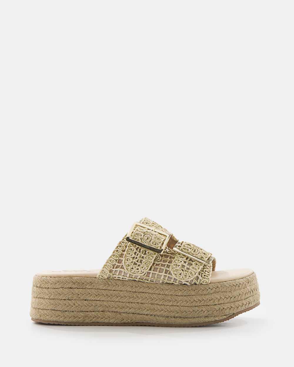 Sandalias plataforma estilo espadrille con elegante tejido calado. Doble tira ancha en material tejido que brinda soporte y estilo veraniego. Hebilla ajustable dorada para calce perfecto. Plataforma de yute natural que aporta altura y comodidad. Suela de goma antideslizante con excelente tracción. Diseño versátil ideal para looks casuales de verano, paseos playeros o combinaciones bohemias. Frescura, comodidad y estilo natural en cada paso.