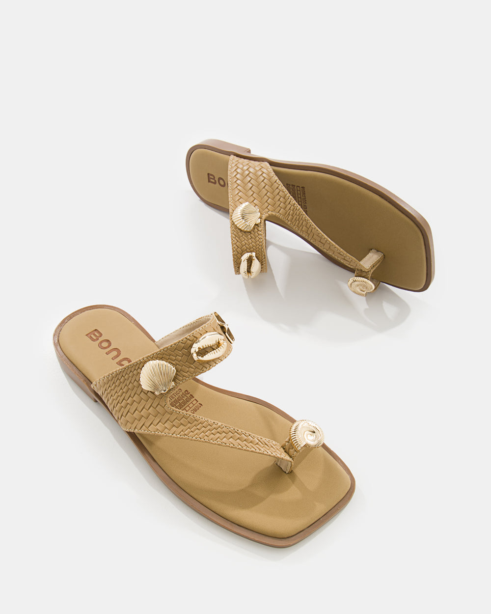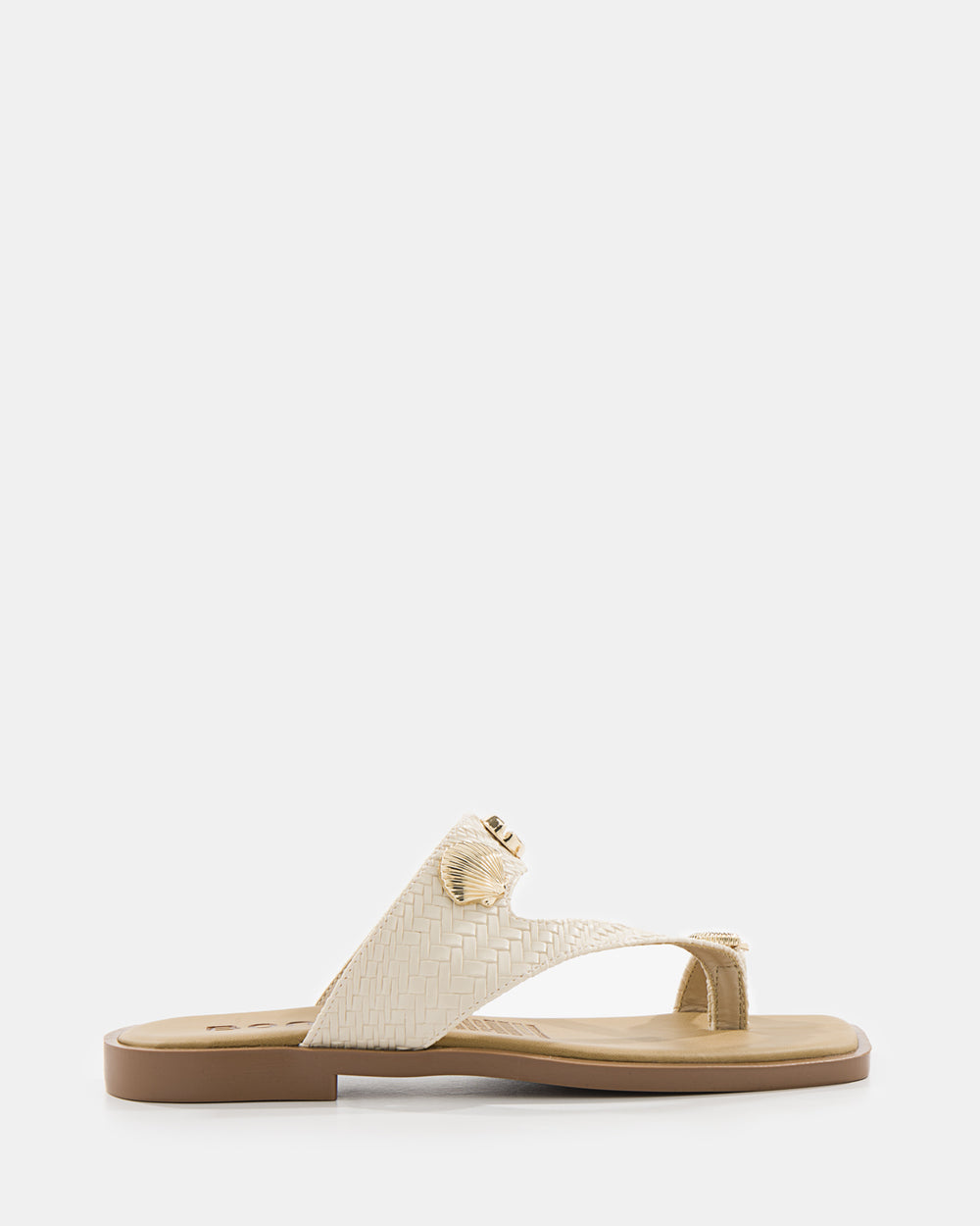 Sandalia plana con silueta de punta cuadrada que aporta un carácter moderno y sofisticado al look. Su estructura en tira T abraza el pie con elegancia, realzada por un herraje rectangular en acabado dorado que se convierte en el detalle protagonista