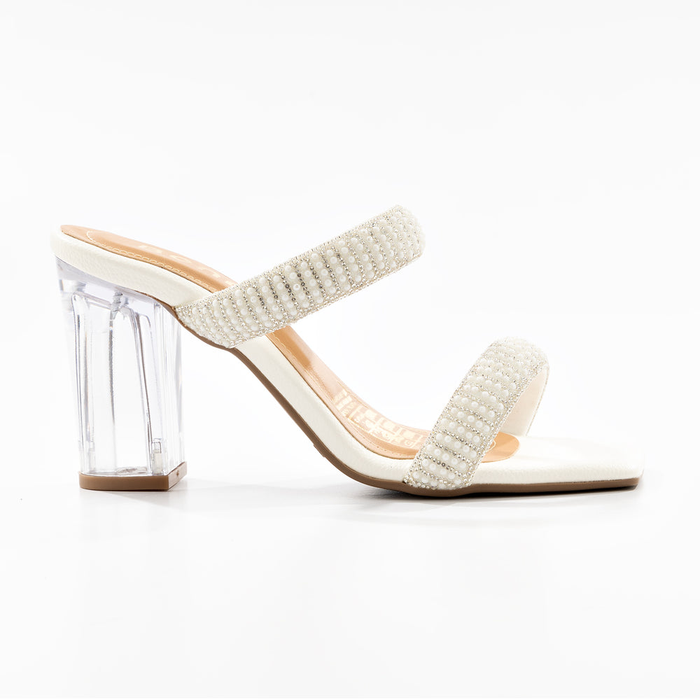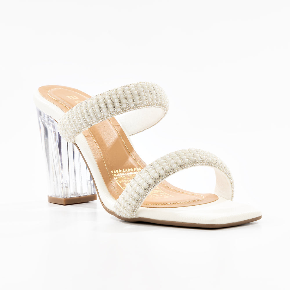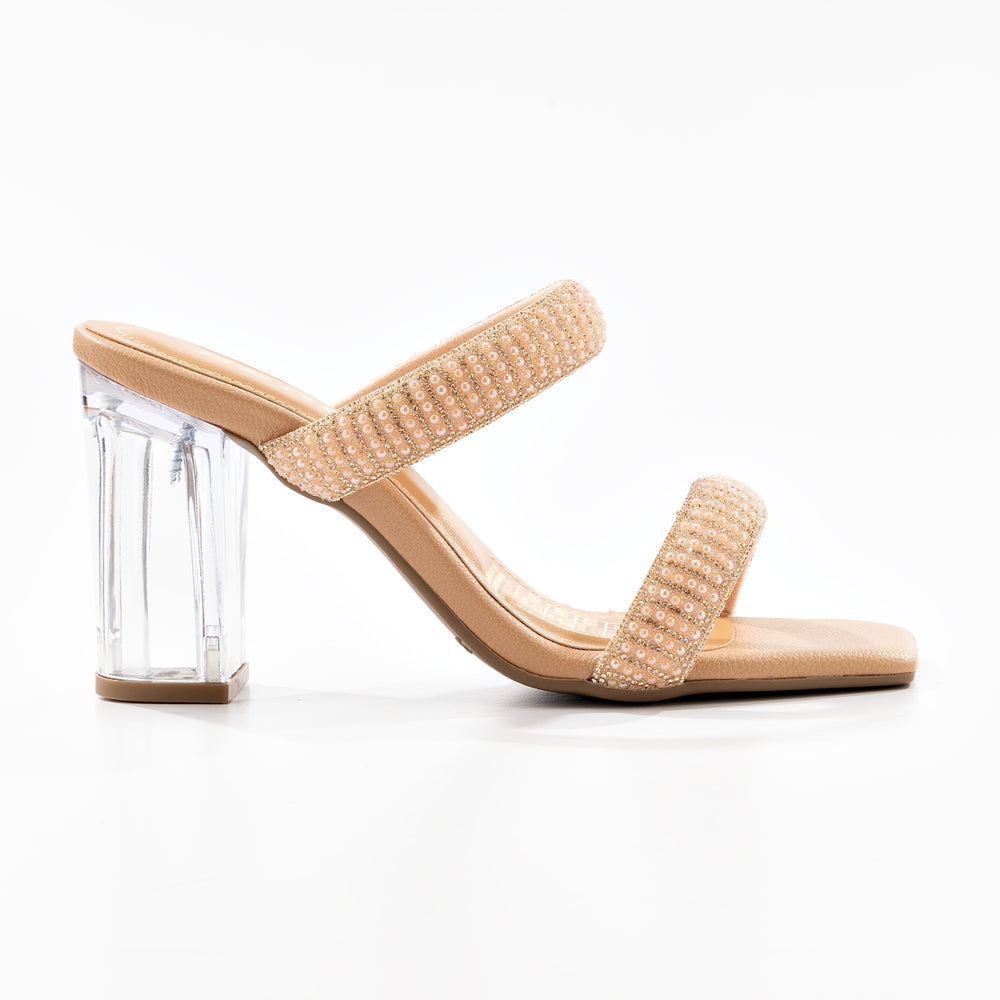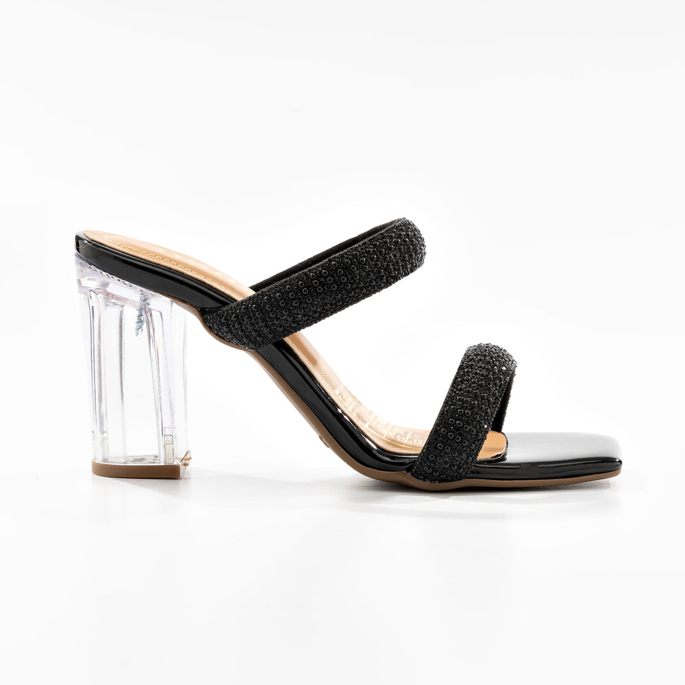 Sandalia tacon de moda para mujer, su diseño de doble tira brillante proporciona sujeción y comodidad, mientras que la plantilla acolchada ofrece confort durante todo el día. A portan un toque glamuroso y sofisticado. Destaca por su innovador tacón transparente tipo acrílico que crea un efecto visual moderno y llamativo.