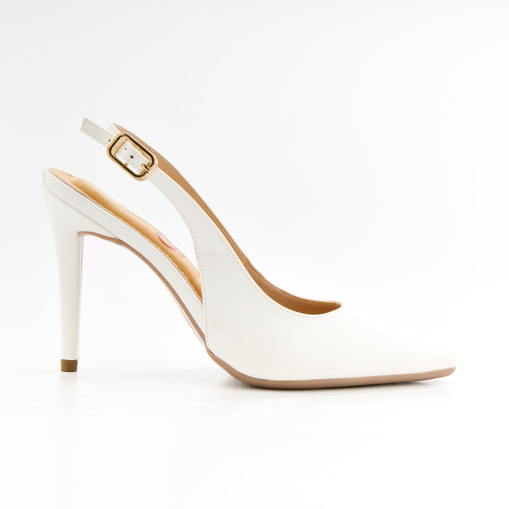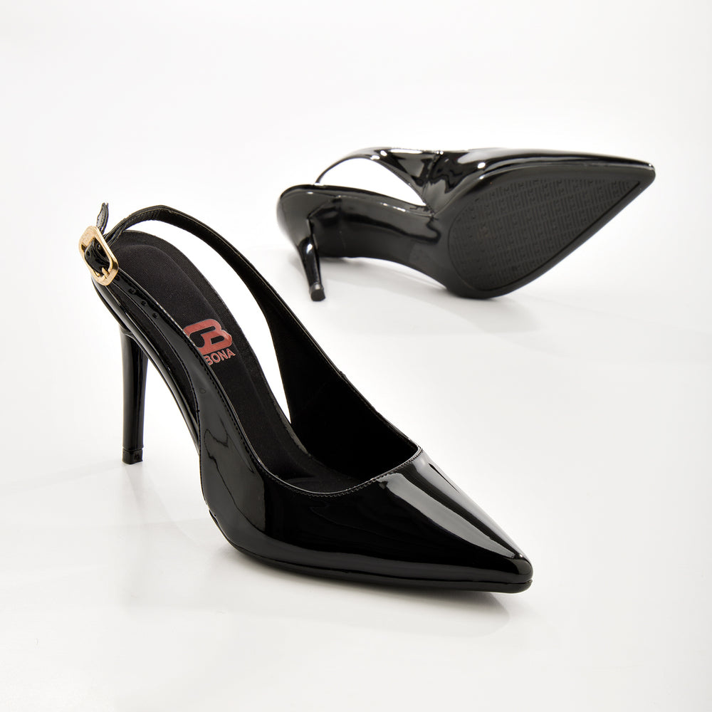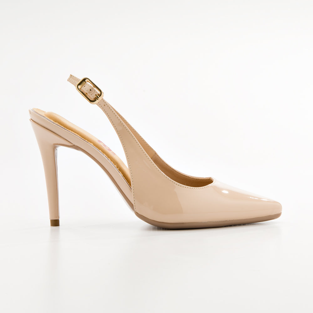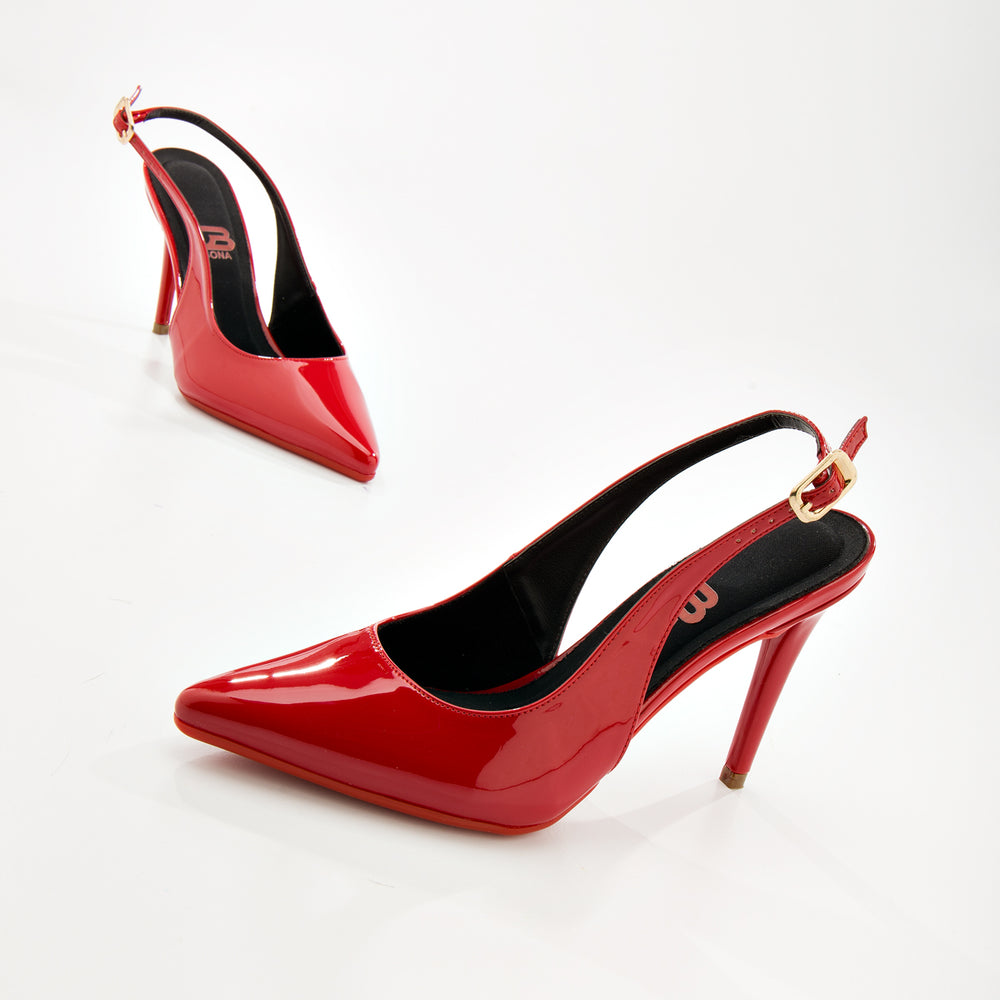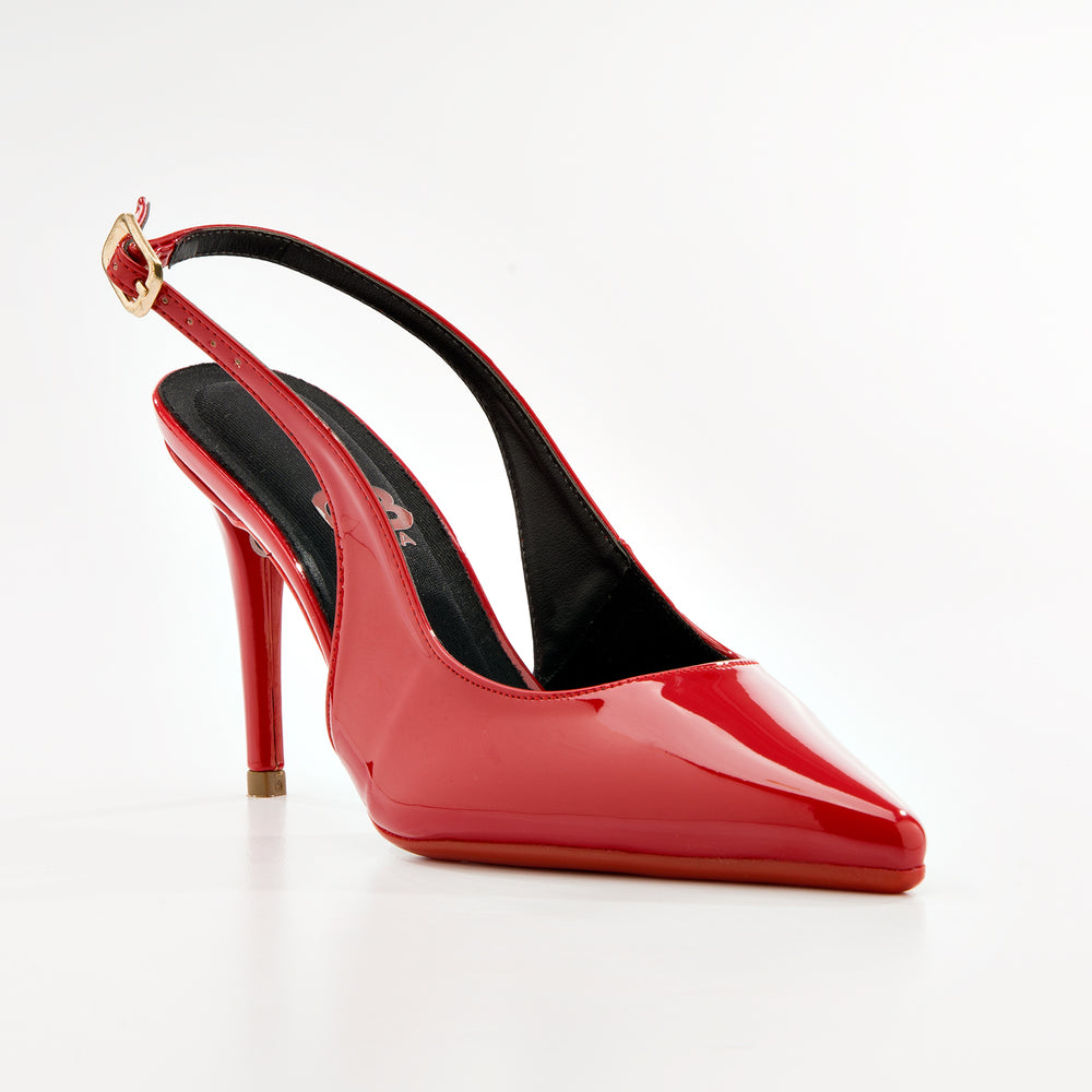 Tacon de moda para mujer, eleva tu estilo con estos tacones tipo stiletto slingback en color rojo. Su diseño con punta fina, talón descubierto y acabado en charol brillante los convierte en el complemento perfecto para tus looks más elegantes y atrevidos.
