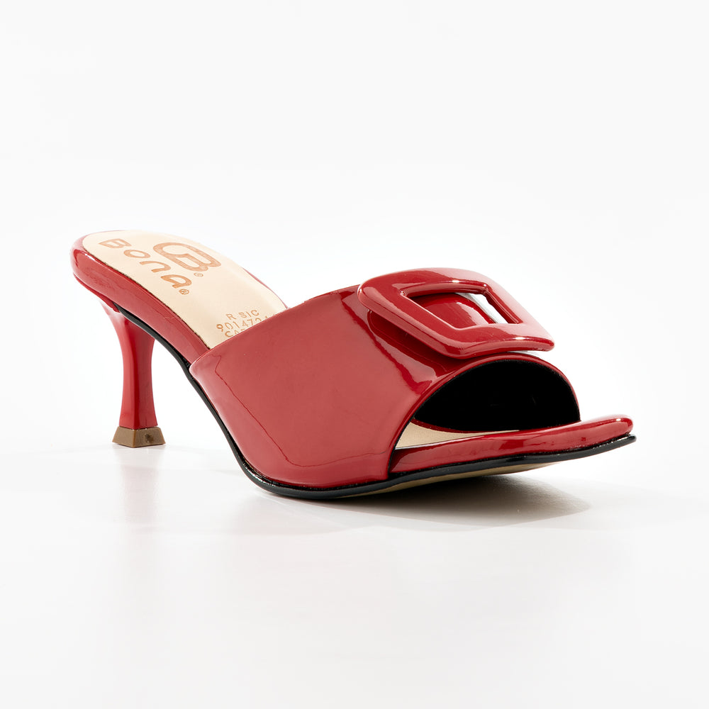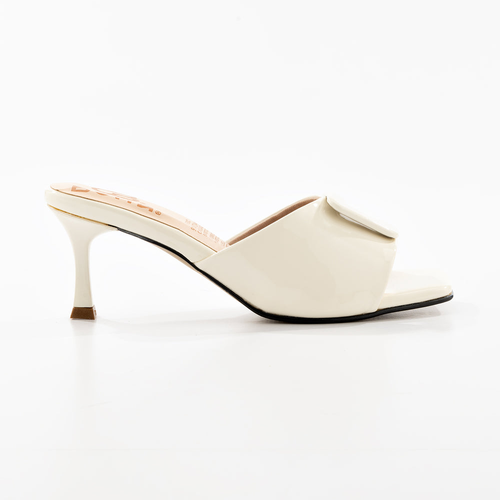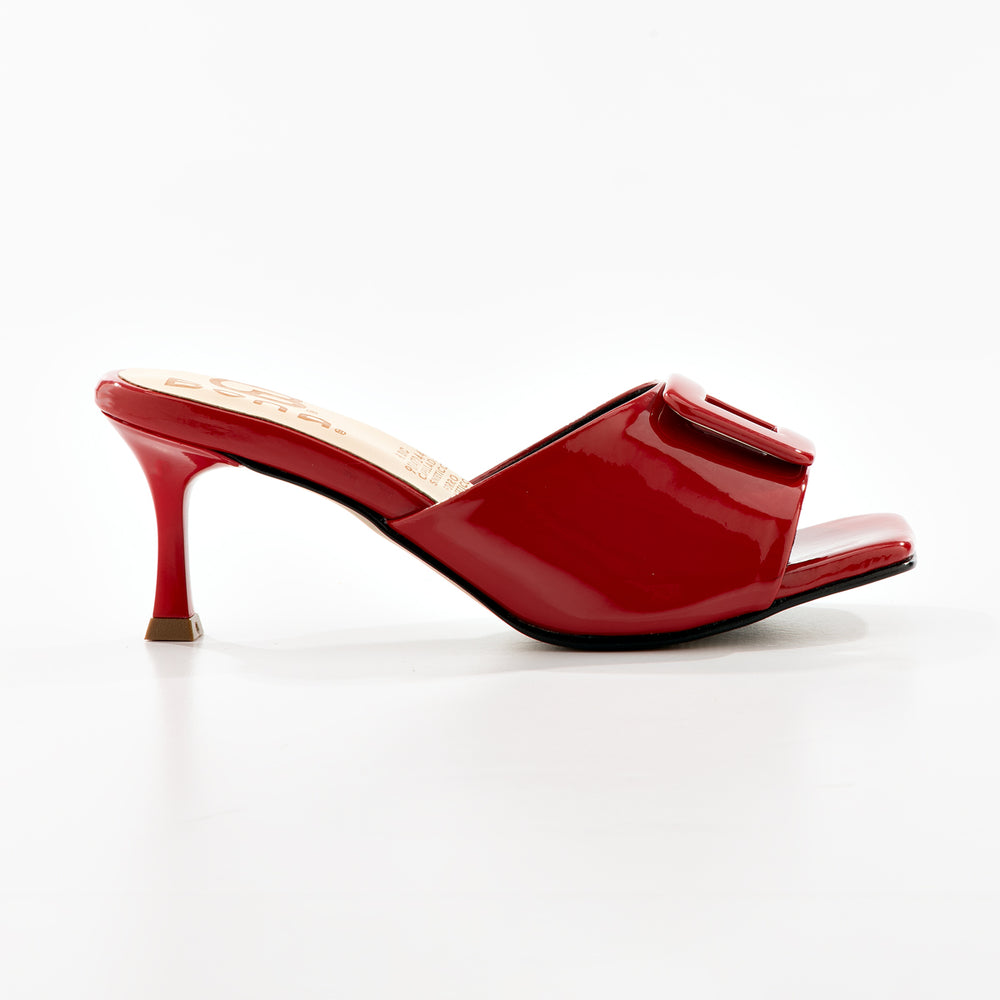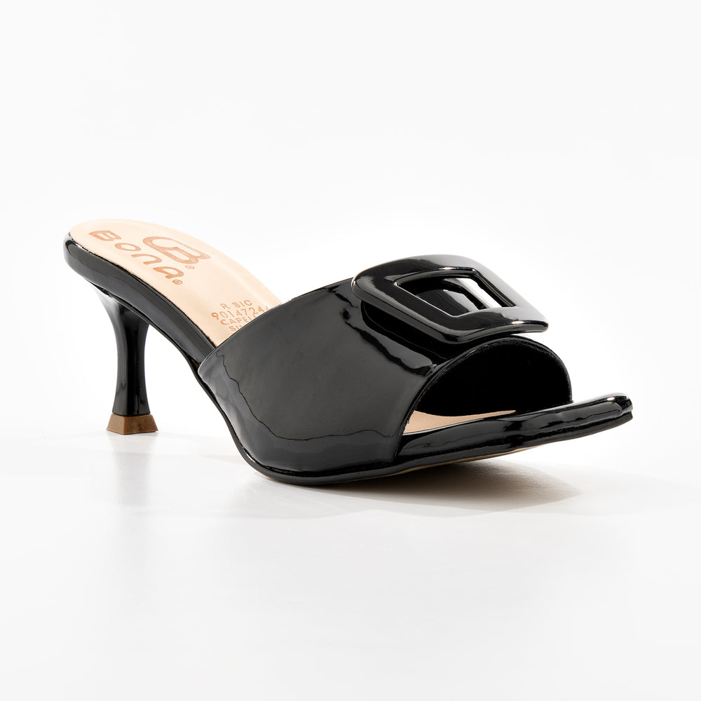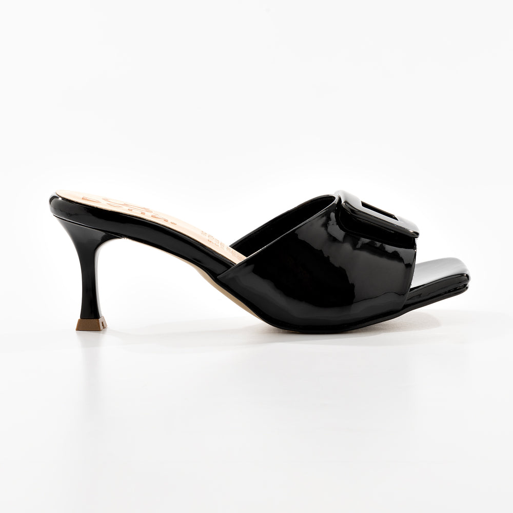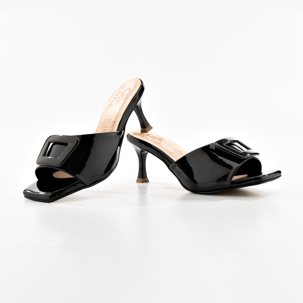 Tacones de moda para mujer, en material sintético premium con hebilla metálica decorativa. Tacón tipo kitten heel y suela antideslizante. Diseño elegante de una banda ajustable, tacón medio para comodidad y estilo, plantilla acolchada. Perfectas para ocasiones especiales y uso diario.